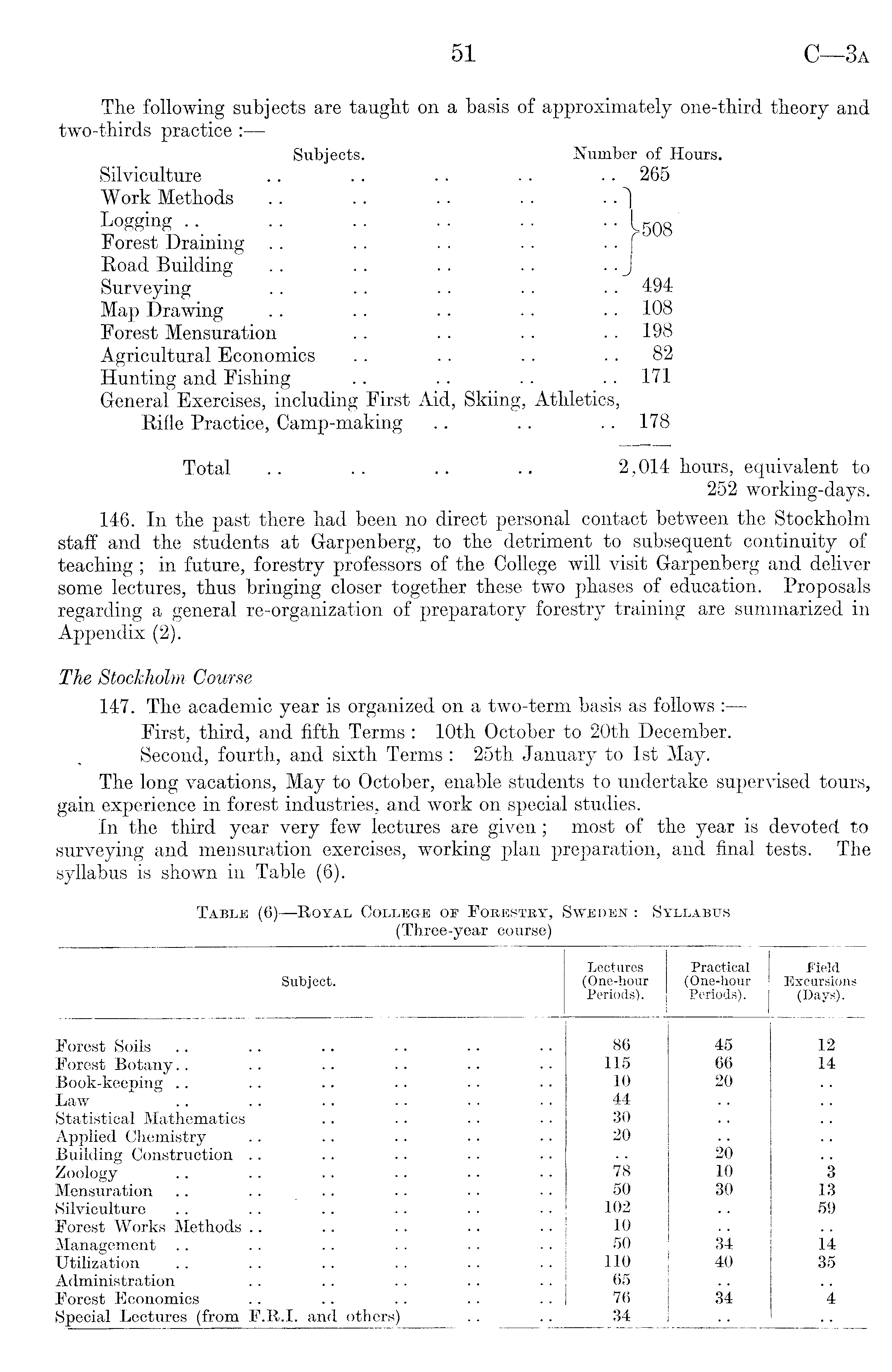 The following subjects are taught on a basis of approximately one-third theory and two-thirds practice : Subjects. Number of Hours. Silviculture .. .. .. .. .. 265 Work Methods .. .. .. .. .. Fobbing i! " " !! "K Road Building .. .. .. .. .. J Surveying .. .. .. .. .. 494 Map Drawing .. .. .. .. - • 108 Forest Mensuration .. .. .. .. 198 Agricultural Economics .. .. .. 82 Hunting and Fishing .. .. .. 171 General Exercises, including First Aid, Skiing, Athletics, Rifle Practice, Camp-making .. .. .. 178 Total .. .. .. .. 2,014 hours, equivalent to 252 working-days. 146. In the past there had been no direct personal contact between the Stockholm staff and the students at Garpenberg, to the detriment to subsequent continuity of teaching ; in future, forestry professors of the College will visit Garpenberg and deliver some lectures, thus bringing closer together these two phases of education. Proposals regarding a general re-organization of preparatory forestry training are summarized in Appendix (2). The Stockholm Course 147. The academic year is organized on a two-term basis as follows : First, third, and fifth Terms : 10th October to 20th December. Second, fourth, and sixth Terms: 25th January to Ist May. The long vacations, May to October, enable students to undertake supervised tours, gain experience in forest industries, and work on special studies. In the third year very few lectures are given; most of the year is devoted to surveying and mensuration exercises, working plan preparation, and final tests. The syllabus is shown in Table (6).