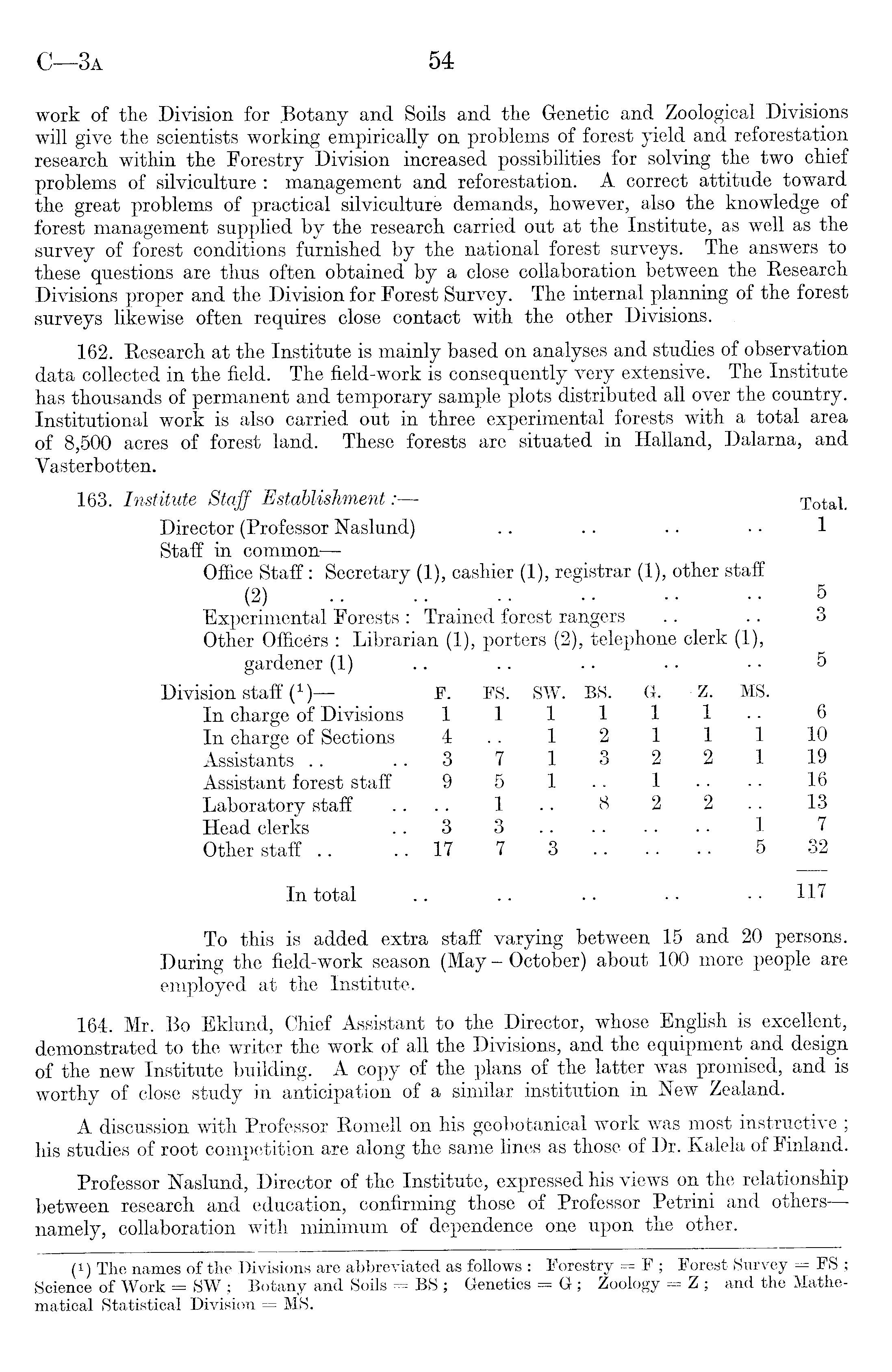 work of the Division for Botany and Soils and the Genetic and Zoological Divisions will give the scientists working empirically on problems of forest yield and reforestation research within the Forestry Division increased possibilities for solving the two chief problems of silviculture : management and reforestation. A correct attitude toward the great problems of practical silviculture demands, however, also the knowledge of forest management supplied by the research carried out at the Institute, as well as the survey of forest conditions furnished by the national forest surveys. The answers to these questions are thus often obtained by a close collaboration between the Research Divisions proper and the Division for Forest Survey. The internal planning of the forest surveys likewise often requires close contact with the other Divisions. 162. Research at the Institute is mainly based on analyses and studies of observation data collected in the field. The field-work is consequently very extensive. The Institute has thousands of permanent and temporary sample plots distributed all over the country. Institutional work is also carried out in three experimental forests with a total area of 8,500 acres of forest land. These forests are situated in Halland, Dalarna, and Vasterbotten. 163. Institute Staff Establishment:— Total. Director (Professor Naslund) .. .. .. • • 1 Staff in common — Office Staff: Secretary (1), cashier (1), registrar (1), other staff (2) 6 Experimental Forests : Trained forest rangers .. .. 3 Other Officers : Librarian (1), porters (2), telephone clerk (1), gardener (1) .. .. .. .. • • 5 Division staff ( 1 ) F. FS. SW. BS. G. Z. MS. In charge of Divisions 1 1 1 1 1 1 6 In charge of Sections 4 1 2 1 1 1 10 Assistants .. ..3 7 1 3 22 1 19 Assistant forest staff 9 5 1 .. 1 •• 16 Laboratory staff .... 1 .. 8 22 . . 13 Head clerks .. 3 3 1 7 Other staff .. ..17 7 3 5 32 In total .. .. .. . • • • 117 To this is added extra staff varying between 15 and 20 persons. During the field-work season (May - October) about 100 more people are employed at the Institute. 164. Mr. Bo Eklund, Chief Assistant to the Director, whose English is excellent, demonstrated to the writer the work of all the Divisions, and the equipment and design of the new Institute building. A copy of the plans of the latter was promised, and is worthy of close study in anticipation of a similar institution in New Zealand. A discussion with Professor Romell on his geobotanical work was most instructive ; his studies of root competition are along the same fines as those of Dr. Kalela of Finland. Professor Naslund, Director of the Institute, expressed his views on the relationship between research and education, confirming those of Professor Petrini and others namely, collaboration with minimum of dependence one upon the other.