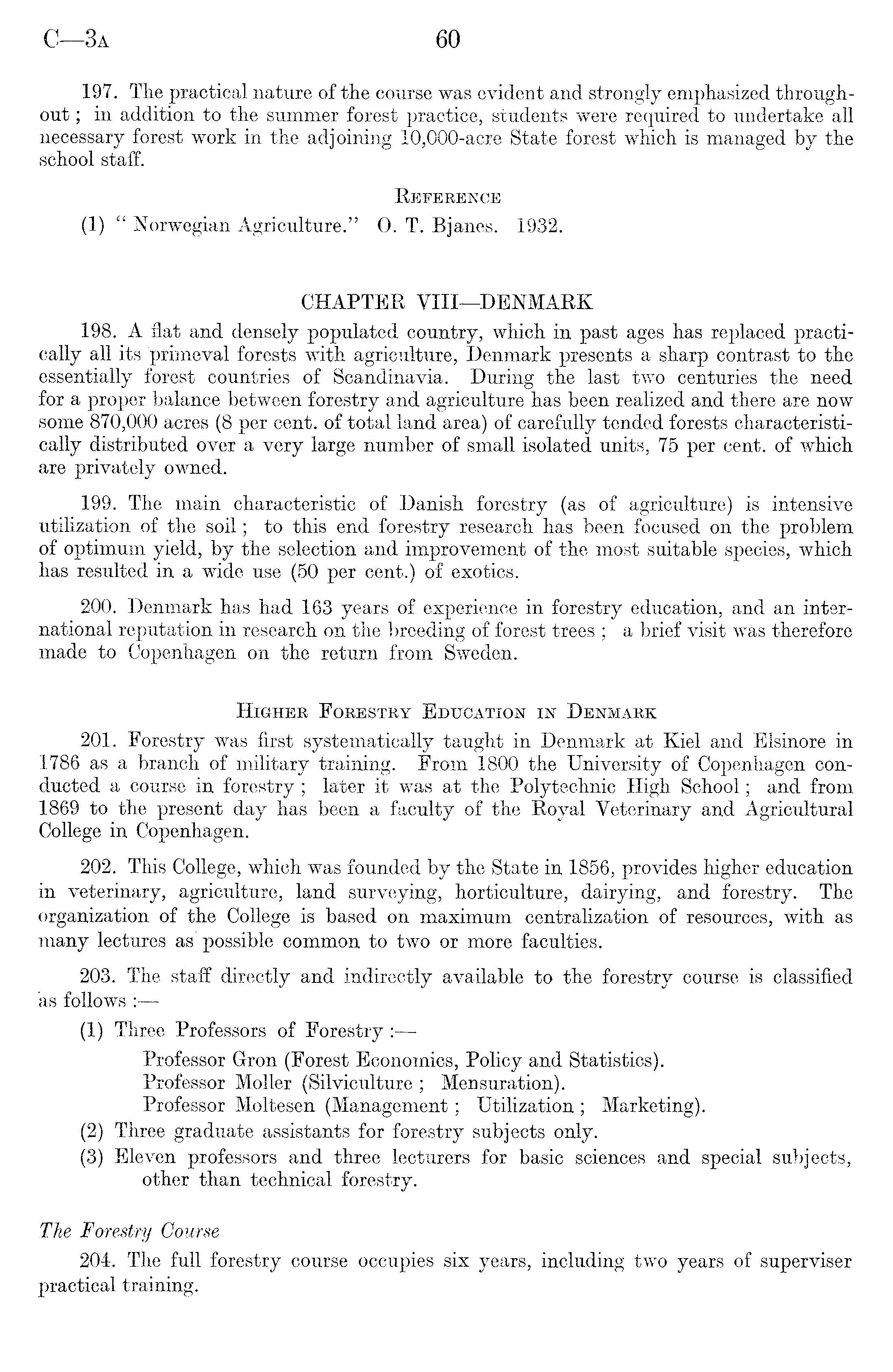 197. The practical nature of the course was evident and strongly emphasized throughout ; in addition to the summer forest practice, students were required to undertake all necessary forest work in the adjoining 10,000-acre State forest which is managed by the school staff. Reference (1) " Norwegian Agriculture." 0. T. Bjanes. 1932. CHAPTER VIII—DENMARK 198. A flat and densely populated country, which in past ages has replaced practically all its primeval forests with agriculture, Denmark presents a sharp contrast to the essentially forest countries of Scandinavia. During the last two centuries the need for a proper balance between forestry and agriculture has been realized and there are now some 870,000 acres (8 per cent, of total land area) of carefully tended forests characteristically distributed over a very large number of small isolated units, 75 per cent, of which are privately owned. 199. The main characteristic of Danish forestry (as of agriculture) is intensive utilization of the soil; to this end forestry research has been focused on the problem of optimum yield, by the selection and improvement of the most suitable species, which has resulted in a wide use (50 per cent.) of exotics. 200. Denmark has had 163 years of experience in forestry education, and an international reputation in research on the breeding of forest trees ; a brief visit was therefore made to Copenhagen on the return from Sweden. Higher Forestry Education in Denmark 201. Forestry was first systematically taught in Denmark at Kiel and Elsinore in 1786 as a branch of military training. From 1800 the University of Copenhagen conducted a course in forestry ; later it was at the Polytechnic High School; and from 1869 to the present day has been a faculty of the Royal Veterinary and Agricultural College in Copenhagen. 202. This College, which was founded by the State in 1856, provides higher education in veterinary, agriculture, land surveying, horticulture, dairying, and forestry. The organization of the College is based on maximum centralization of resources, with as many lectures as possible common to two or more faculties. 203. The staff directly and indirectly available to the forestry course is classified as follows : (1) Three Professors of Forestry:— Professor Gron (Forest Economics, Policy and Statistics). Professor Moller (Silviculture ; Mensuration). Professor Moltesen (Management; Utilization ; Marketing). (2) Three graduate assistants for forestry subjects only. (3) Eleven professors and three lecturers for basic sciences and special subjects, other than technical forestry. The Forestry Course 204. The full forestry course occupies six years, including two years of superviser practical training.