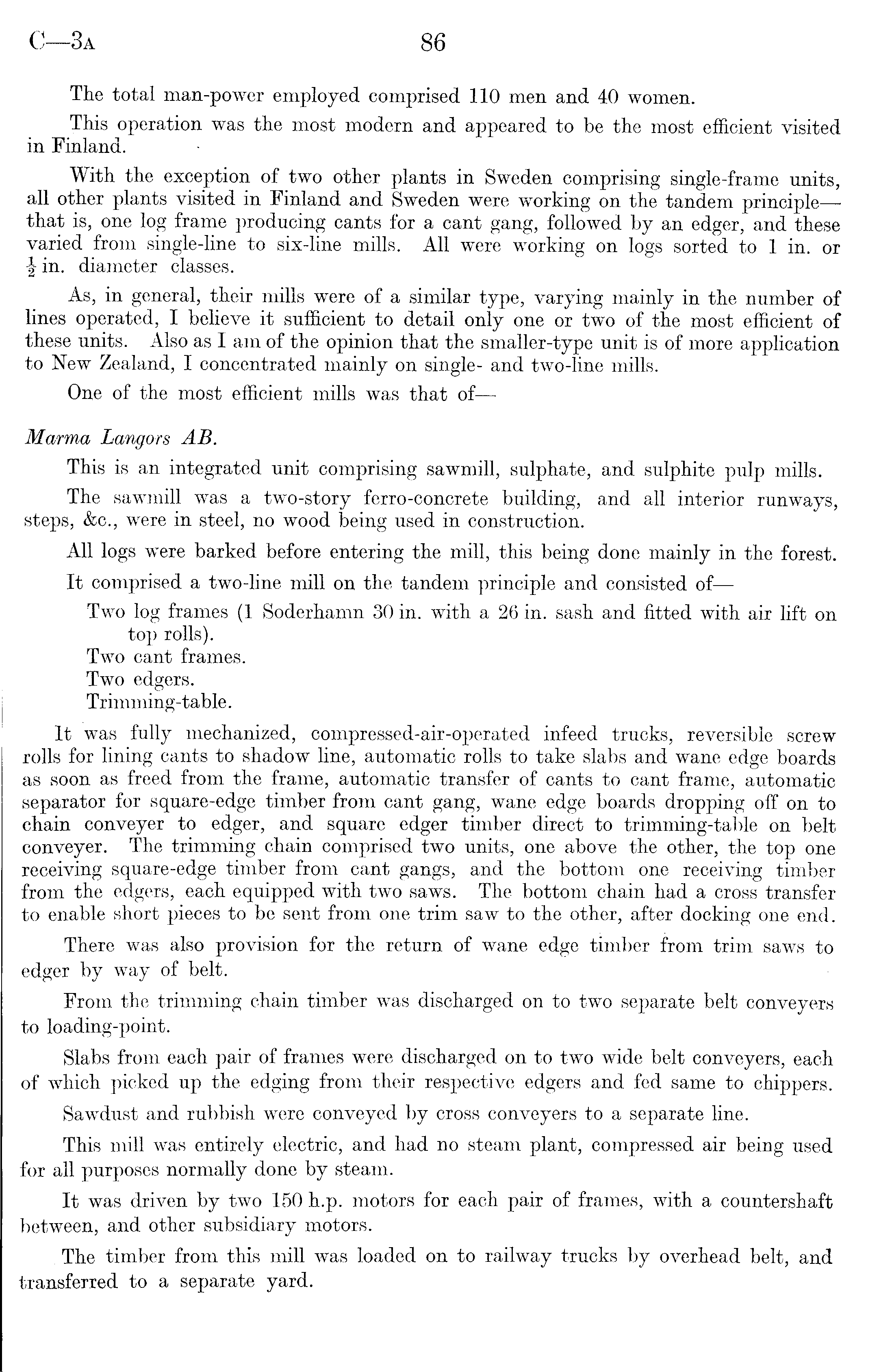 The total mail-power employed comprised 110 men and 40 women. This operation was the most modern and appeared to be the most efficient visited in Finland. With the exception of two other plants in Sweden comprising single-frame units, all other plants visited in Finland and Sweden were working on the tandem principle—that is, one log frame producing cants for a cant gang, followed by an edger, and these varied from single-line to six-line mills. All were working on logs sorted to 1 in. or \ in. diameter classes. As, in general, their mills were of a similar type, varying mainly in the number of lines operated, I believe it sufficient to detail only one or two of the most efficient of these units. Also as lam of the opinion that the smaller-type unit is of more application to New Zealand, I concentrated mainly on single- and two-line mills. One of the most efficient mills was that of— Marma Langors AB. This is an integrated unit comprising sawmill, sulphate, and sulphite pulp mills. The sawmill was a two-story ferro-concrete building, and all interior runways, steps, &c., were in steel, no wood being used in construction. All logs were barked before entering the mill, this being done mainly in the forest. It comprised a two-line mill on the tandem principle and consisted of— Two log frames (1 Soderhamn 30 in. with a 26 in. sash and fitted with air lift on top rolls). Two cant frames. Two edgers. Trimming-table. It was fully mechanized, compressed-air-operated infeed trucks, reversible screw rolls for lining cants to shadow line, automatic rolls to take slabs and wane edge boards as soon as freed from the frame, automatic transfer of cants to cant frame, automatic separator for square-edge timber from cant gang, wane edge boards dropping off on to chain conveyer to edger, and square edger timber direct to trimming-table on belt conveyer. The trimming chain comprised two units, one above the other, the top one receiving square-edge timber from cant gangs, and the bottom one receiving timber from the edgers, each equipped with two saws. The bottom chain had a cross transfer to enable short pieces to be sent from one trim saw to the other, after docking one end. There was also provision for the return of wane edge timber from trim saws to edger by way of belt. From the trimming chain timber was discharged on to two separate belt conveyers to loading-point. Slabs from each pair of frames were discharged on to two wide belt conveyers, each of which picked up the edging from their respective edgers and fed same to chippers. Sawdust and rubbish were conveyed by cross conveyers to a separate line. This mill was entirely electric, and had no steam plant, compressed air being used for all purposes normally done by steam. It was driven by two 150 h.p. motors for each pair of frames, with a countershaft between, and other subsidiary motors. . The timber from this mill was loaded on to railway trucks by overhead belt, and transferred to a separate yard.