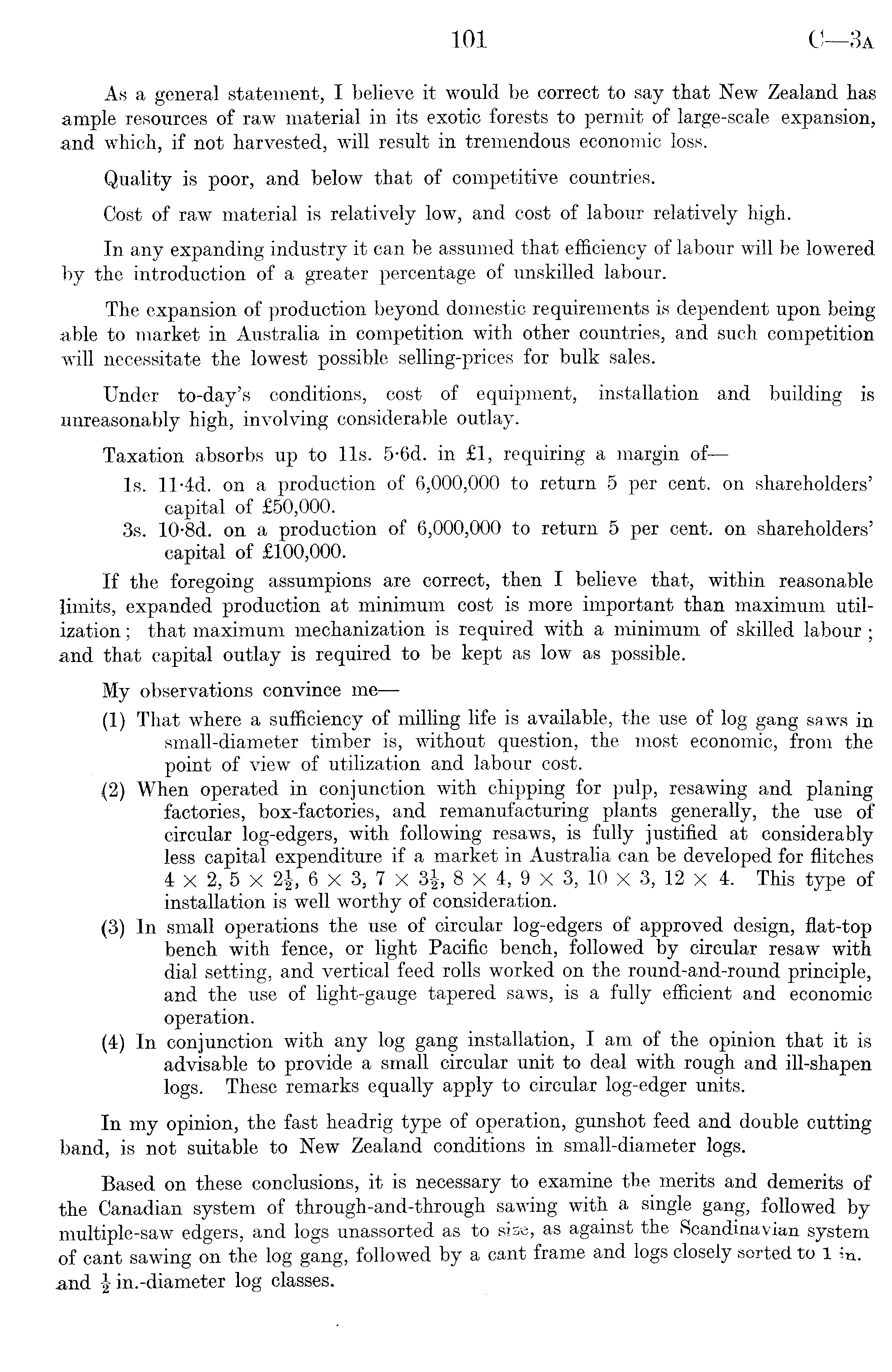 As a general statement, I believe it would be correct to say that New Zealand lias ample resources of raw material in its exotic forests to permit of large-scale expansion, and which, if not harvested, will result in tremendous economic loss. Quality is poor, and below that of competitive countries. Cost of raw material is relatively low, and cost of labour relatively high. In any expanding industry it can be assumed that efficiency of labour will be lowered by the introduction of a greater percentage of unskilled labour. The expansion of production beyond domestic requirements is dependent upon being able to market in Australia in competition with other countries, and such competition will necessitate the lowest possible selling-prices for bulk sales. Under to-day's conditions, cost of equipment, installation and building is unreasonably high, involving considerable outlay. Taxation absorbs up to lis. s*6d. in £l, requiring a margin of — Is. 11-4 d. on a production of 6,000,000 to return 5 per cent, on shareholders' capital of £50,000. 3s. 10-Bd. on a production of 6,000,000 to return 5 per cent, on shareholders' capital of £lOO,OOO. If the foregoing assumpions are correct, then I believe that, within reasonable limits, expanded production at minimum cost is more important than maximum utilization ; that maximum mechanization is required with a minimum of skilled labour ; and that capital outlay is required to be kept as low as possible. My observations convince me — (1) That where a sufficiency of milling life is available, the use of log gang saws in small-diameter timber is, without question, the most economic, from the point of view of utilization and labour cost. (2) When operated in conjunction with chipping for pulp, resawing and planing factories, box-factories, and remanufacturing plants generally, the use of circular log-edgers, with following resaws, is fully justified at considerably less capital expenditure if a market in Australia can be developed for flitches 4X2, 5 X 2|, 6X3, 7 X 3|, 8X4,9X3,10 X 3, 12 x 4. This type of installation is well worthy of consideration. (3) In small operations the use of circular log-edgers of approved design, flat-top bench with fence, or light Pacific bench, followed by circular resaw with dial setting, and vertical feed rolls worked on the round-and-round principle, and the use of light-gauge tapered saws, is a fully efficient and economic operation. (4) In conjunction with any log gang installation, I am of the opinion that it is advisable to provide a small circular unit to deal with rough and ill-shapen logs. These remarks equally apply to circular log-edger units. In my opinion, the fast headrig type of operation, gunshot feed and double cutting band, is not suitable to New Zealand conditions in small-diameter logs. Based on these conclusions, it is necessary to examine the merits and demerits of the Canadian system of through-and-through sawing with a single gang, followed by multiple-saw edgers, and logs unassorted as to size, as against the Scandinavian system of cant sawing on the log gang, followed by a cant frame and logs closely sorted to 1 in, .and | in.-diameter log classes.