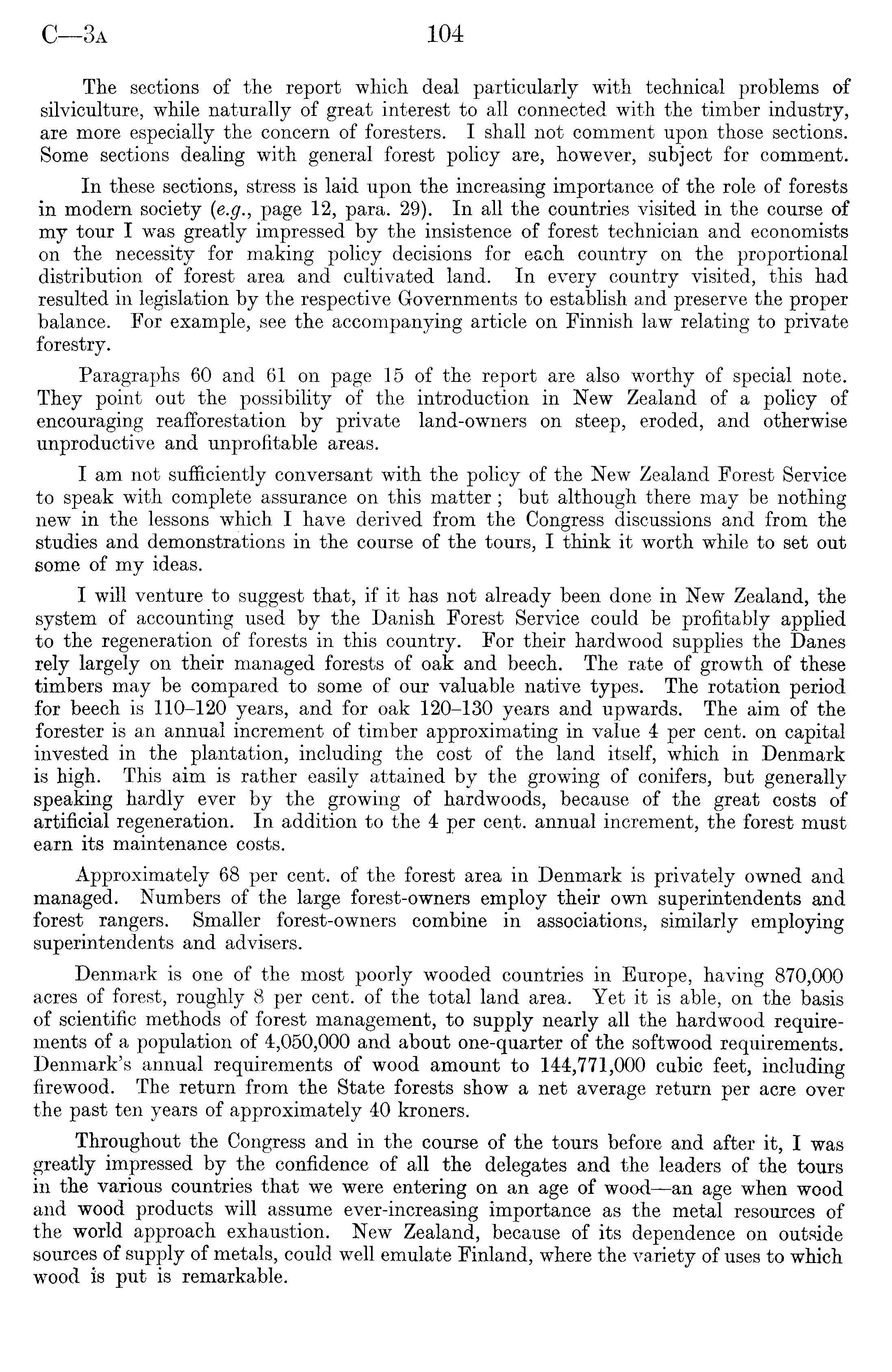 The sections of the report which deal particularly with technical problems of silviculture, while naturally of great interest to all connected with the timber industry, are more especially the concern of foresters. I shall not comment upon those sections. Some sections dealing with general forest policy are, however, subject for comment. In these sections, stress is laid upon the increasing importance of the role of forests in modern society {e.g., page 12, para. 29). In all the countries visited in the course of my tour I was greatly impressed by the insistence of forest technician and economists on the necessity for making policy decisions for each country on the proportional distribution of forest area and cultivated land. In every country visited, this had resulted in legislation by the respective Governments to establish and preserve the proper balance. For example, see the accompanying article on Finnish law relating to private forestry. Paragraphs 60 and 61 on page 15 of the report are also worthy of special note. They point out the possibility of the introduction in New Zealand of a policy of encouraging reafforestation by private land-owners on steep, eroded, and otherwise unproductive and unprofitable areas. I am not sufficiently conversant with the policy of the New Zealand Forest Service to speak with complete assurance on this matter ; but although there may be nothing new in the lessons which I have derived from the Congress discussions and from the studies and demonstrations in the course of the tours, I think it worth while to set out some of my ideas. I will venture to suggest that, if it has not already been done in New Zealand, the system of accounting used by the Danish Forest Service could be profitably applied to the regeneration of forests in this country. For their hardwood supplies the Danes rely largely on their managed forests of oak and beech. The rate of growth of these timbers may be compared to some of our valuable native types. The rotation period for beech is 110-120 years, and for oak 120-130 years and upwards. The aim of the forester is an annual increment of timber approximating in value 4 per cent, on capital invested in the plantation, including the cost of the land itself, which in Denmark is high. This aim is rather easily attained by* the growing of conifers, but generally speaking hardly ever by the growing of hardwoods, because of the great costs of artificial regeneration. In addition to the 4 per cent, annual increment, the forest must earn its maintenance costs. Approximately 68 per cent, of the forest area in Denmark is privately owned and managed. Numbers of the large forest-owners employ their own superintendents and forest rangers. Smaller forest-owners combine in associations, similarly employing superintendents and advisers. Denmark is one of the most poorly wooded countries in Europe, having 870,000 acres of forest, roughly 8 per cent, of the total land area. Yet it is able, on the basis of scientific methods of forest management, to supply nearly all the hardwood requirements of a population of 4,050,000 and about one-quarter of the softwood requirements. Denmark's annual requirements of wood amount to 144,771,000 cubic feet, including firewood. The return from the State forests show a net average return per acre over the past ten years of approximately 40 kroners. Throughout the Congress and in the course of the tours before and after it, I was greatly impressed by the confidence of all the delegates and the leaders of the tours in the various countries that we were entering on an age of wood —an age when wood and wood products will assume ever-increasing importance as the metal resources of the world approach exhaustion. New Zealand, because of its dependence on outside sources of supply of metals, could well emulate Finland, where the variety of uses to which wood is put is remarkable.