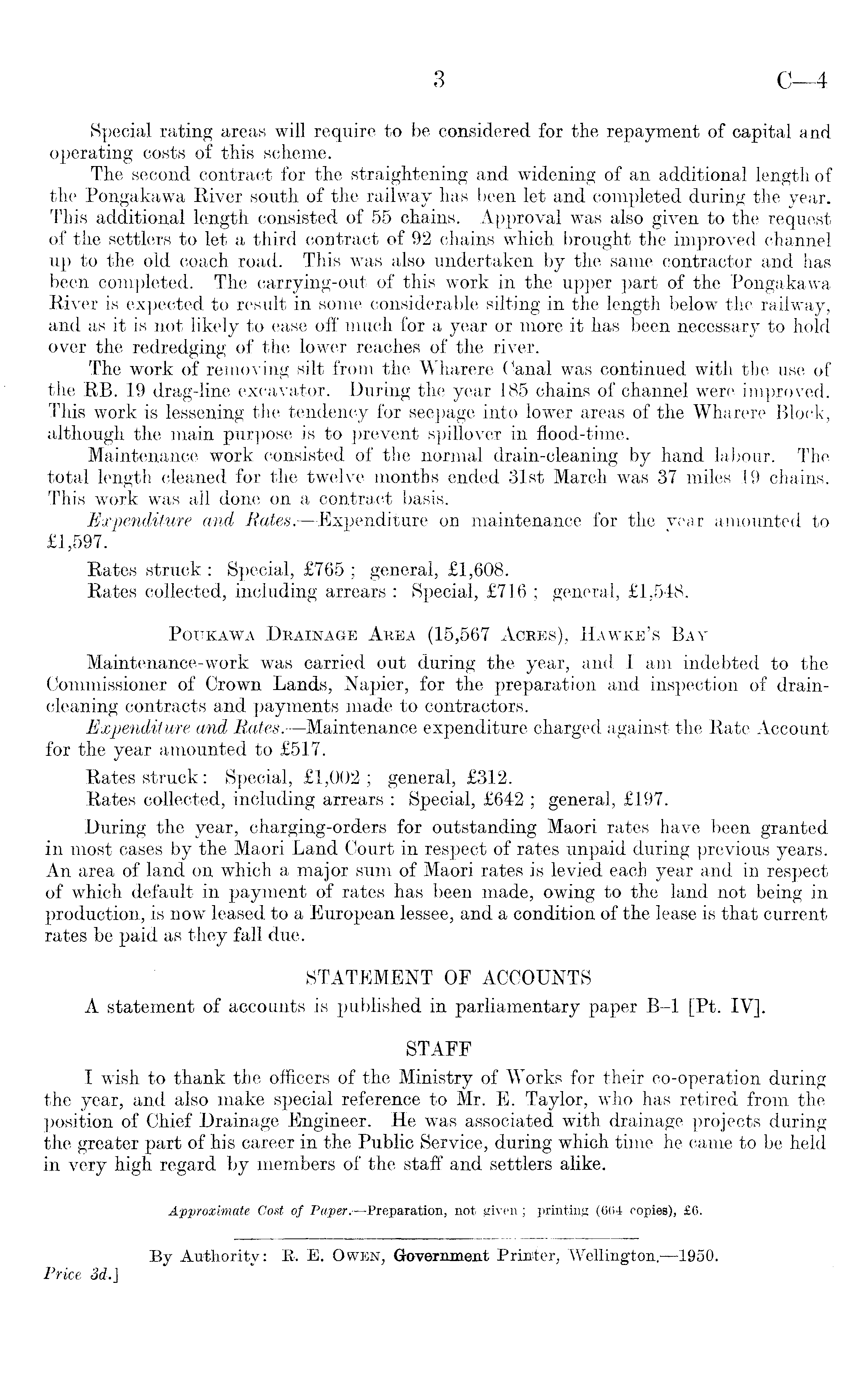 Special rating areas will require to be considered for the repayment of capital and operating costs of this scheme. The second contract for the straightening and widening of an additional length of the Pongakawa River south of the railway has been let and completed during the year. This additional length consisted of 55 chains. Approval was also given to the request of the settlers to let a third contract of 92 chains which brought the improved channel up to the old coach road. This was also undertaken by the same contractor and has been completed. The carrying-out of this work in the upper part of the Pongakawa River is expected to result in some considerable silting in the length below the railway, and as it is not likely to ease off much for a year or more it has been necessary to hold over the redredging of the lower reaches of the river. The work of removing silt from the Wharere Canal was continued with the use of the RB. 19 drag-line excavator. During the year 185 chains of channel were improved. This work is lessening the tendency for seepage into lower areas of the Wharere Block, although the main purpose is to prevent spillover in flood-time. Maintenance work consisted of the normal drain-cleaning by hand labour. The total length cleaned for the twelve months ended 31st March was 37 miles 19 chains. This work was all done on a contract basis. Expenditure and Rates.—Expenditure on maintenance for the year amounted to £1,597. Rates struck : Special, £765 ; general, £1,608. Rates collected, including arrears : Special, £716 ; general, £1,548. Poukawa Drainage Area (15,567 Acres), Hawke's Bay Maintenance-work was carried out during the year, and I am indebted to the Commissioner of Crown Lands, Napier, for the preparation and inspection of draincleaning contracts and payments made to contractors. Expenditure and Rates. —Maintenance expenditure charged against the Rate Account for the year amounted to £517. Rates struck: Special, £1,002 ; general, £312. Rates collected, including arrears : Special, £642 ; general, £197. During the year, charging-orders for outstanding Maori rates have been granted in most cases by the Maori Land Court in respect of rates unpaid during previous years. An area of land on which a major sum of Maori rates is levied each year and in respect of which default in payment of rates has been made, owing to the land not being in production, is now leased to a European lessee, and a condition of the lease is that current rates be paid as they fall due. t STATEMENT OF ACCOUNTS A statement of accounts is published in parliamentary paper B-l [Pt. IV]. STAFF I wish to thank the officers of the Ministry of Works for their co-operation during the year, and also make special reference to Mr. E. Taylor, who has retired from the position of Chief Drainage Engineer. He was associated with drainage projects during the greater part of his career in the Public Service, during which time he came to be held in very high regard by members of the staff and settlers alike. Approximate Cost of Paper.—Preparation, not given ; printing (664 copies), £6. By Authority: B. E. Owen, Government Printer, Wellington.—l9so. Price 3d.]