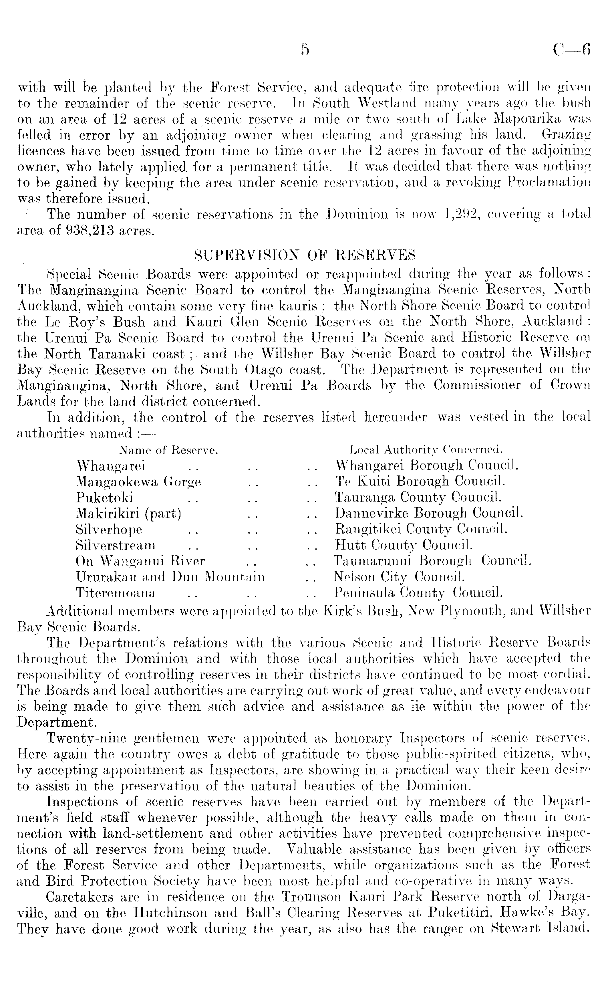 with will be planted by the Forest Service, and adequate fire protection will be given to the remainder of the scenic reserve. In South Westland many years ago the bush on an area of 12 acres of a scenic reserve a mile or two south of Lake Mapourika was felled in error by an adjoining owner when clearing and grassing his land. Grazing licences have been issued from time to time over the 12 acres in favour of the adjoining owner, who lately applied for a permanent title. It was decided that there was nothing to be gained by keeping the' area under scenic reservation, and a revoking Proclamation was therefore issued. : The number of scenic reservations in the Dominion is now 1,292, covering a total area of 938,213 acres. SUPERVISION OF RESERVES Special Scenic Boards were appointed or reappointed during the year as follows : The Manginangina Scenic Board to control the Manginangina Scenic Reserves, North Auckland, which contain some very fine kauris ; the North Shore Scenic Board to control the Le Roy's Bush and. Kauri Glen Scenic Reserves on the North Shore, Auckland; the Urenui Pa Scenic Board to control the Urenui Pa Scenic and Historic Reserve on the North Taranaki coast; and the Willsher Bay Scenic Board to control the Willsher Bay Scenic Reserve on the South Otago coast. The Department is represented on the Manginangina, North Shore, and Urenui Pa Boards by the Commissioner of Crown Lands for the land district concerned. In addition, the control of the reserves listed hereunder was vested in the local authorities named Name of Reserve. Local Authority Concerned. Whangarei .. .-. .. Whangarei Borough Council. Mangaokewa Gorge . . .. Te Kuiti Borough Council. Puketoki .. .. .. Tauranga County Council. Makirikiri (part) .. .. Dannevirke Borough Council. Silverhope .. .. .. Rangitikei County Council. Silverstream .. .. .. Hutt County Council. On Wanganui River .. .. Taumarunui Borough Council. Ururakau and Dun Mountain .. Nelson City Council. Titeremoana . . . . . . Peninsula County Council. Additional members were appointed to the Kirk's Bush, New Plymouth, and Willsher Bay Scenic Boards. The Department's relations with the various Scenic and Historic Reserve Boards throughout the Dominion and with those local authorities which have accepted the responsibility of controlling reserves in their districts have continued to be most cordial. The Boards and local authorities are carrying out work of great value, and every endeavour is being made to give them such advice and assistance as lie within the power of the Department. Twenty-nine gentlemen were appointed as honorary Inspectors of scenic reserves. Here again the country owes a debt of gratitude to those public-spirited citizens, who, by accepting appointment as Inspectors, are showing in a practical way their keen desire to assist in the preservation of the natural beauties of the Dominion. Inspections of scenic ' reserves have been carried out by members of the Department's field staff whenever possible, although the heavy calls made on them in connection with land-settlement and other activities have prevented comprehensive inspections of all reserves from being 'made. Valuable assistance has been given by officers of the Forest Service and other Departments, while organizations such as the Forest and Bird Protection Society have been most helpful and co-operative in many ways. Caretakers are in residence on the Trounson Kauri Park Reserve north of Dargaville, and on the Hutchinson and Ball's Clearing Reserves at Puketitiri, Hawke's Bay. They have done good work during the year, as also has the ranger on Stewart Island.