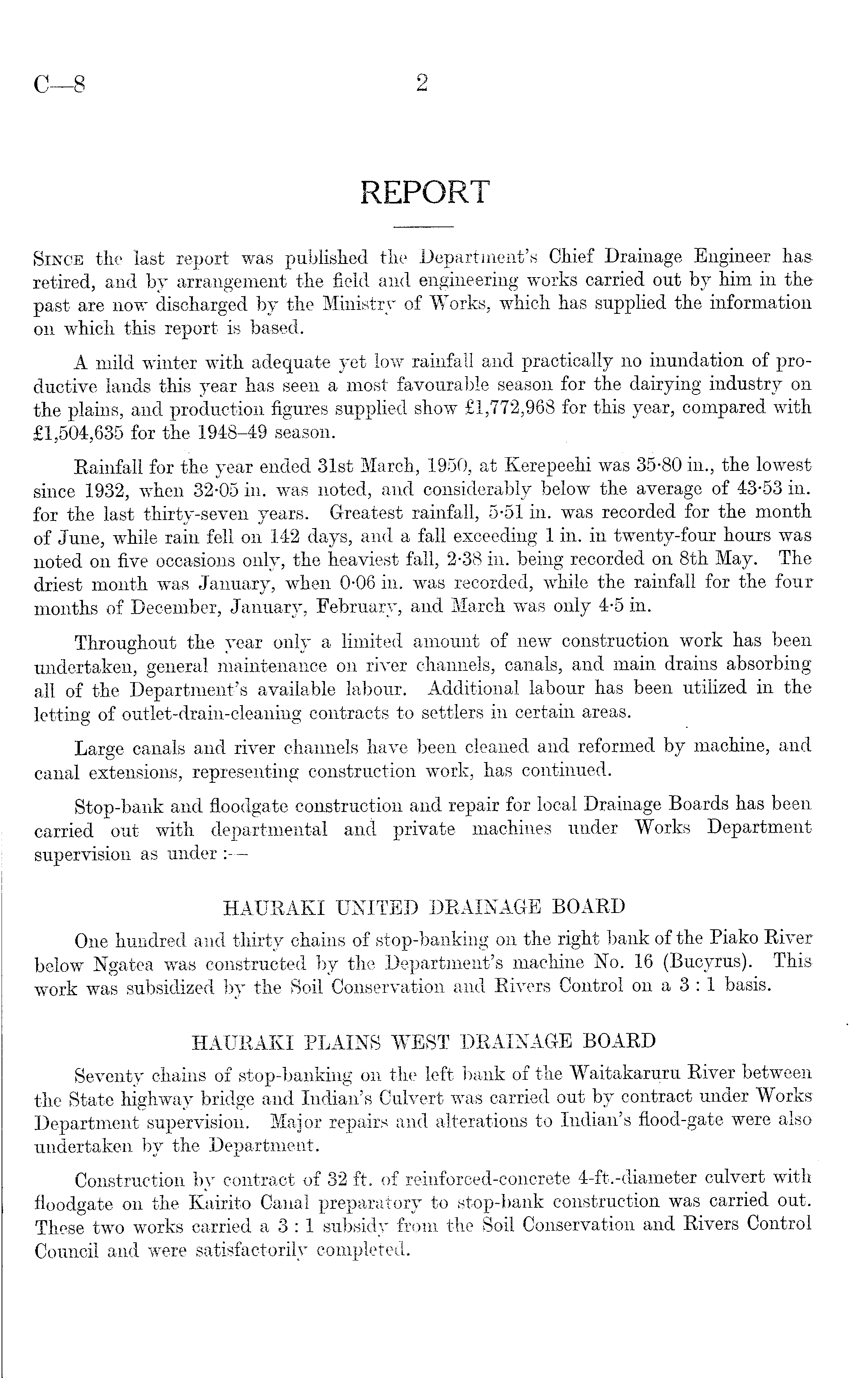 REPORT Since the last report was published the Department's Chief Drainage Engineer hasretired, and by arrangement the field and engineering works carried out by him in the past are now discharged by the Ministry of Works, which has supplied the information on which this report is based. A mild winter with adequate yet low rainfall and practically no inundation of productive lands this year has seen a most favourable season for the dairying industry on the plains, and production figures supplied show £1,772,968 for this year, compared with £1,504,635 for the 1948-49 season. Rainfall for the year ended 31st March, 1950, at Kerepeehi was 35-80 in., the lowest since 1932, when 32-05 in. was noted, and considerably below the average of 43-53 in. for the last thirty-seven years. Greatest rainfall, 5-51 in. was recorded for the month of June, while rain fell on 142 days, and a fall exceeding 1 in. in twenty-four hours was noted on five occasions only, the heaviest fall, 2-38 in. being recorded on Bth May. The driest month was January, when 0-06 in. was recorded, while the rainfall for the four months of December, January, February, and March was only 4-5 in. Throughout the year only a limited amount of new construction work has been undertaken, general maintenance on river channels, canals, and main drains absorbing all of the Department's available labour. Additional labour has been utilized in the letting of outlet-drain-cleaning contracts to settlers in certain areas. Large canals and river channels have been cleaned and reformed by machine, and canal extensions, representing construction work, has continued. Stop-bank and floodgate construction and repair for local Drainage Boards has been carried out with departmental and private machines under Works Department supervision as under : HAURAKI UNITED DRAINAGE BOARD One hundred and thirty chains of stop-banking on the right bank of the Piako River below Ngatea was constructed by the Department's machine No. 16 (Bucyrus). This work was subsidized by the Soil Conservation and Rivers Control on a3 :1 basis. HAURAKI PLAINS WEST DRAINAGE BOARD Seventy chains of stop-banking on the left bank of the Waitakaruru River between the State highway bridge and Indian's Culvert was carried out by contract under Works Department supervision. Major repairs and alterations to Indian's flood-gate were also undertaken by the Department. Construction by contract of 32 ft. of reinforced-concrete 4-ft.-diameter culvert with floodgate on the Kairito Canal preparatory to stop-bank construction was carried out. These two works carried a 3 :1 subsidy from the Soil Conservation and Rivers Control Council and were satisfactorily completed.