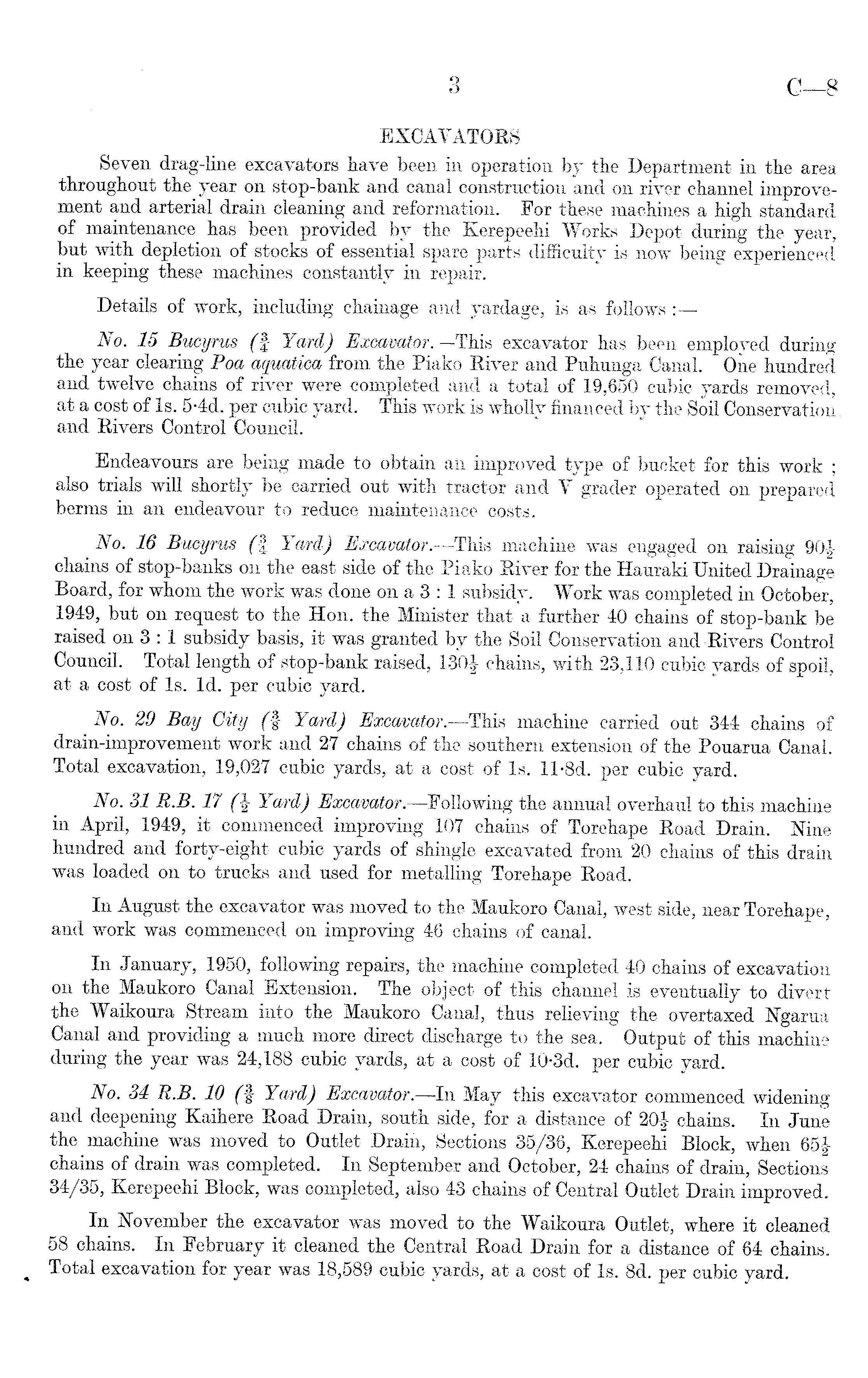 EXCAVATORS Seven drag-line excavators have been in operation by the Department in the area throughout the year on stop-bank and canal construction and on river channel improvement and arterial drain cleaning and reformation. For these machines a high standard of maintenance has been provided by the Kerepeehi Works Depot during the year, but with depletion of stocks of essential spare parts difficulty is now being experienced in keeping these machines constantly in repair. Details of work, including chainage and yardage, is as follows :—- No. 15 Bucyrus (f Yard) Excavator.—This excavator has been employed during the year clearing Poa aquatica from the Piako River and Puhunga Canal. One hundred and twelve chains of river were completed and a total of 19,650 cubic yards removed, at a cost of Is. 54d. per cubic yard. This work is wholly financed by the Soil Conservation and Rivers Control Council. Endeavours are being made to obtain an improved type of bucket for this work ; also trials will shortly be carried out with tractor and V grader operated on prepared berms in an endeavour to reduce maintenance costs. No. 16 Bucyrus (\ Yard) Excavator.—This machine was engaged on raising 90£ chains of stop-banks on the east side of the Piako River for the Hauraki United Drainage Board, for whom the work was done on a3 : 1 subsidy. Work was completed in October, 1949, but on request to the Hon. the Minister that a further 40 chains of stop-bank be raised on 3 : 1 subsidy basis, it was granted by the Soil Conservation and-Rivers Control Council. Total length of stop-bank raised, 130f chains, with 23,110 cubic yards of spoil, at a cost of Is. Id. per cubic yard. No. 29 Bay City (§ Yard) Excavator.—This machine carried out 344 chains of drain-improvement work and 27 chains of the southern extension of the Pouarua Canal. Total excavation, 19,027 cubic yards, at a cost of Is. 11-Bd. per cubic yard. No. 31 R.B. 17 (i Yard) Excavator.—Following the annual overhaul to this machine in April, 1949, it commenced improving 107 chains of Torehape Road Drain. Nine hundred and forty-eight cubic yards of shingle excavated from 20 chains of this drain was loaded on to trucks and used for metalling Torehape Road. In August the excavator was moved to the Maukoro Canal, west side, near Torehape, and work was commenced on improving 46 chains of canal. In January, 1950, following repairs, the machine completed 40 chains of excavation on the Maukoro Canal Extension. The object of this channel is eventually to divert the Waikoura Stream into the Maukoro Canal, thus relieving the overtaxed Ngarua Canal and providing a much more direct discharge to the sea. Output of this machine during the year was 24,188 cubic yards, at a cost of 10-3 d. per cubic yard. No. 34 R.B. 10 (§ Yard) Excavator.—ln May this excavator commenced widening and deepening Kaihere Road Drain, south side, for a distance of 20| chains. In June the machine was moved to Outlet Drain, Sections 35/36, Kerepeehi Block, when 65J chains of drain was completed. In September and October, 24 chains of drain, Sections 34/35, Kerepeehi Block, was completed, also 43 chains of Central Outlet Drain improved. In November the excavator was moved to the Waikoura Outlet, where it cleaned 58 chains. In February it cleaned the Central Road Drain for a distance of 64 chains. Total excavation for year was 18,589 cubic yards, at a cost of Is. Bd. per cubic yard.