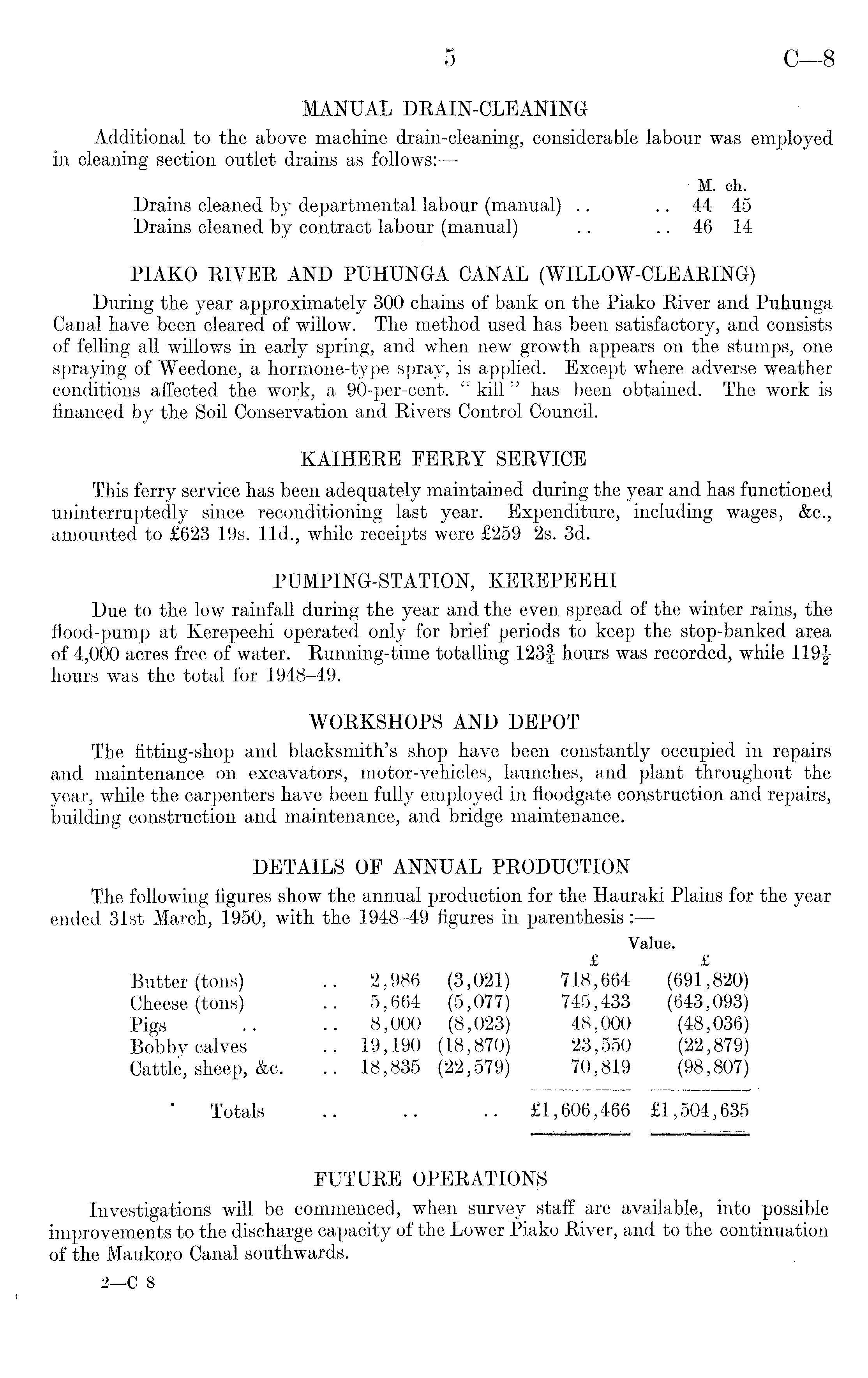 MANUAL DRAIN-CLEANING Additional to the above machine drain-cleaning, considerable labour was employed in cleaning section outlet drains as follows: M. oh. Drains cleaned by departmental labour (manual) .. .. 44 45 Drains cleaned by contract labour (manual) .. 46 14 PIAKO RIVER AND PUHUNGA CANAL (WILLOW-CLEARING) During the year approximately 300 chains of bank on the Piako River and Puhunga Canal have been cleared of willow. The method used has been satisfactory, and consists of felling all willows in early spring, and when new growth appears on the stumps, one spraying of Weedone, a hormone-type spray, is applied. Except where adverse weather conditions affected the work, a 90-per-cent. " kill" has been obtained. The work is financed by the Soil Conservation and Rivers Control Council. KAIHERE EERRY SERVICE This ferry service has been adequately maintained during the year and has functioned uninterruptedly since reconditioning last year. Expenditure, including wages, &c., amounted to £623 19s. lid., while receipts were £259 2s. 3d. PUMPING-STATION, KEREPEEHI Due to the low rainfall during the year and the even spread of the winter rains, the flood-pump at Kerepeehi operated only for brief periods to keep the stop-banked area of 4,000 acres free of water. Running-time totalling 123| hours was recorded, while 119£ hours was the total for 1948-49. WORKSHOPS AND DEPOT The fitting-shop and blacksmith's shop have been constantly occupied in repairs and maintenance on excavators, motor-vehicles, launches, and plant throughout the year, while the carpenters have been fully employed in floodgate construction and repairs, building construction and maintenance, and bridge maintenance. DETAILS OF ANNUAL PRODUCTION The following figures show the annual production for the Hauraki Plains for the year ended 31st March, 1950, with the 1948-49 figures in parenthesis:— Value. £ £ Butter (tons) .. 2,986 (3,021) 718,664 (691,820) Cheese (tons) .. 5,664 (5,077) 745,433 (643,093) Pigs .. .. 8,000 (8,023) 48,000 (48,036) Bobby calves .. 19,190 (18,870) 23,550 (22,879) Cattle, sheep, &c. .. 18,835 (22,579) 70,819 (98,807) Totals .. .. .. £1,606,466 £1,504,635 FUTURE OPERATIONS Investigations will be commenced, when survey staff are available, into possible improvements to the discharge capacity of the Lower Piako River, and to the continuation of the Maukoro Canal southwards.