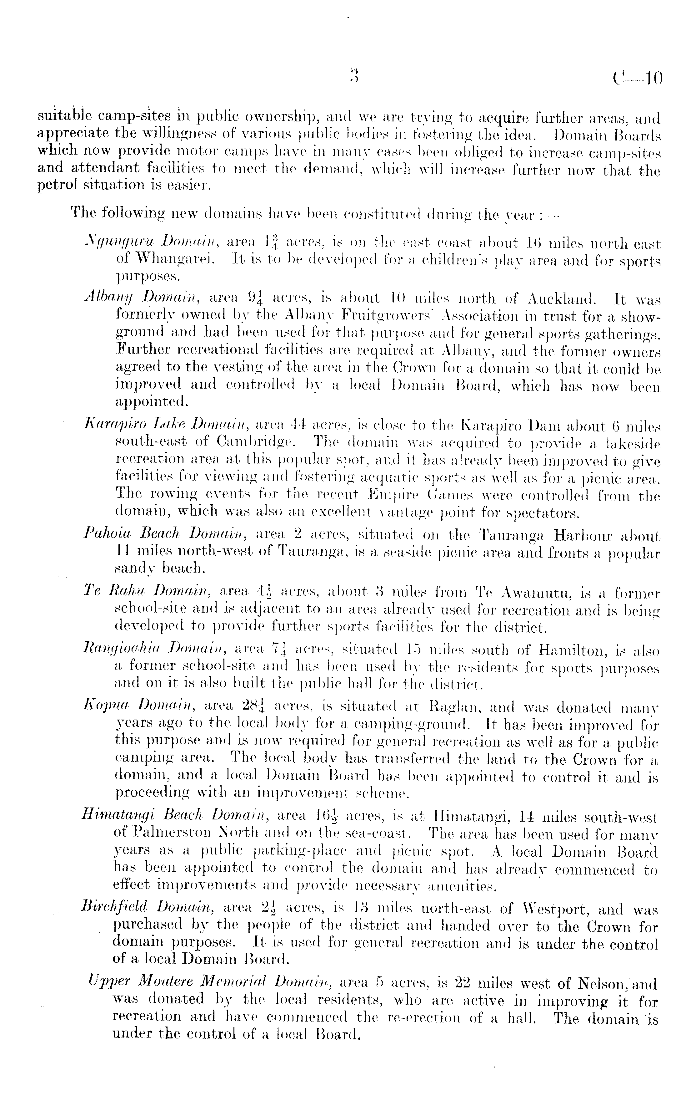 suitable camp-sites in public ownership, and we are trying to acquire further areas, and appreciate the willingness of various public bodies in fostering the idea. Domain Boards which now provide motor camps have in many cases been obliged to increase camp-sites and attendant facilities to meet the demand, which will increase further now that the petrol situation is easier. The following new domains have been constituted during the year : Ngunguru Domain, area If acres, is on the east coast about 16 miles north-east of Whangarei. It is to be developed for a children's play area and for sports purposes. Albany Domain, area 9| acres, is about 10 .miles north of Auckland. It was formerly owned by the Albany Fruitgrowers' Association in trust for a showground and had been used for that purpose and for general sports gatherings. Further recreational facilities are required at Albany, and the former owners agreed to the vesting of the area in the Crown for a domain so that it could be improved and controlled by a local Domain Board, which has now been appointed. Karapiro Lake Domain, area 44 acres, is close to the Karapiro Dam about 6 miles south-east of Cambridge. The domain was acquired to provide a lakeside recreation area at this popular spot, and it has already been improved to give facilities for viewing and fostering acquatic sports as well as for a picnic area. The rowing events for the recent Empire Games were controlled from the domain, which was also an excellent vantage point for spectators. Pahoia Beach Domain, area 2 acres, situated on the Tauranga Harbour about 11 miles north-west of Tauranga, is a seaside picnic area and fronts a popular sandy beach. Te Rahu Domain, area 4|- acres, about 3 miles from Te Awamutu, is a former school-site and is adjacent to an area already used for recreation and is being developed to provide further sports facilities for the district. Rangioahia Domain, area acres, situated 15 miles south of Hamilton, is also a former school-site and has been used by the residents for sports purposes and on it is also built the public hall for the district. Kopua Domain, area acres, is situated at Raglan, and was donated many years ago to the local body for a camping-ground. It has been improved for this purpose and is now required for general recreation as well as for a public camping area. The local body has transferred the land to the Crown for a domain, and a local Domain Board has been appointed to control it and is proceeding with an improvement scheme. Himatangi Beach Domain, area 16| acres, is at Himatangi, 14 miles south-west of Palmerston North and on the sea-coast. The area has been used for many years as a public parking-place and picnic spot. A local Domain Board has been appointed to control the domain and has already commenced to effect improvements and provide necessary amenities. Birchfield Domain, area 2| acres, is 13 miles north-east of Westport, and was : purchased by the people of the district and handed over to the Crown for domain purposes. It is used for general recreation and is under the control of a local Domain Board. Upper Moutere Memorial Domain, area 5 acres, is 22 miles west of Nelson, and' was donated by the local residents, who are active in improving it for recreation and have, commenced the re-erection of a hall. The domain is under the control of a local Board.