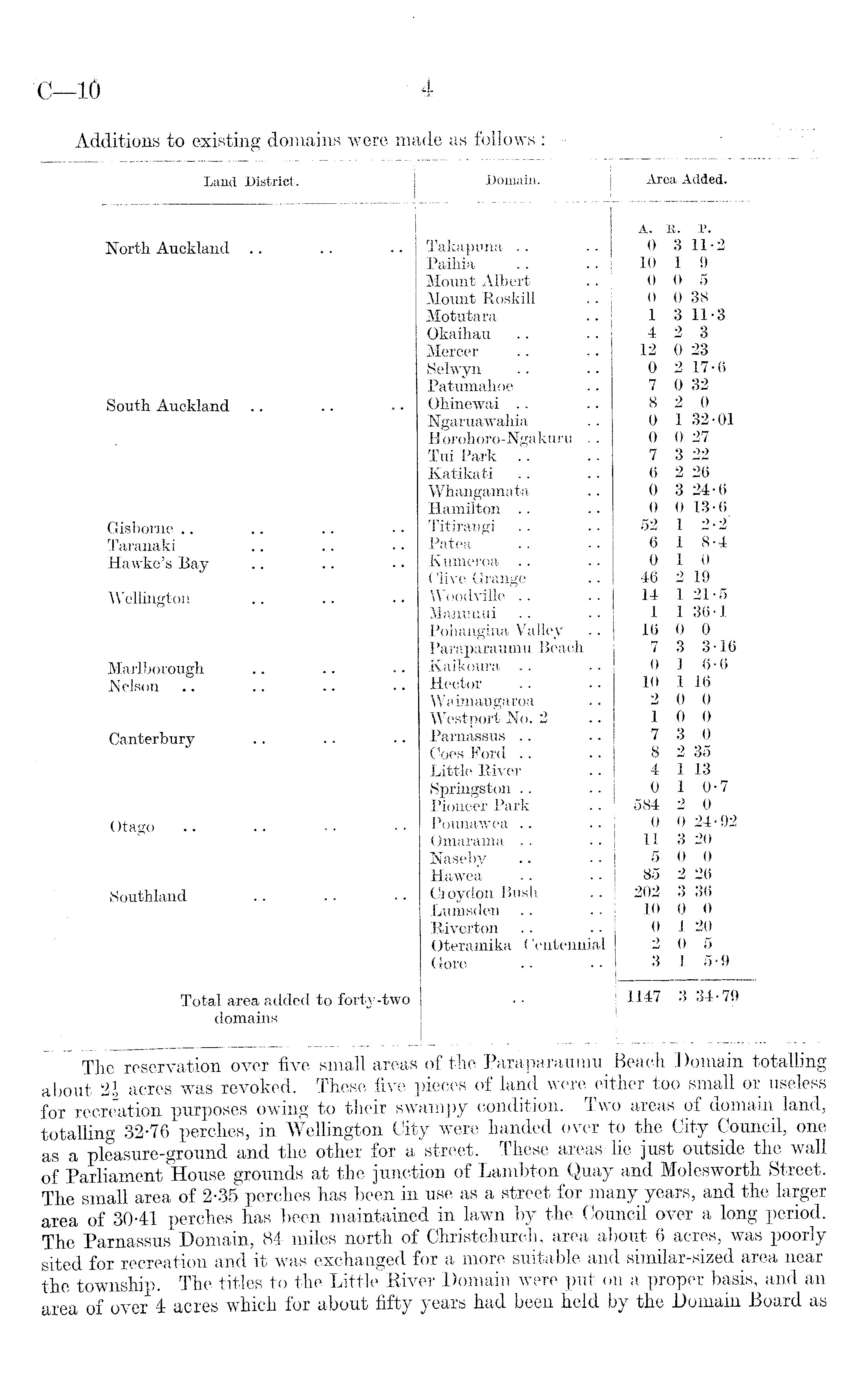 Land District. Domain. Area Added. A. K.. P. North Auckland Takapuna 0 3 11-2 Paihia 10 1 9 Mount Albert 0 0 5 Mount Roskill 0 0 38 Motutara 1 3 11-3 Okaihau 4 2 3 Mercer 12 0 23 Selwyn 0 2 17-6 Patumahoe 7 0 32 South Auckland Ohinewai 8 2 0 Ngaruawahia 0 1 32-01 Horohoro-Ngakuru .. 0 0 27 Tui Park 7 3 22 Katikati 6 2 26 Whangamata 0 3 24-6 Hamilton 0 0 13-6 Gisborne Titirangi 52 1 2-2' Taranaki Patea 6 1 8-4 Hawke's Bay Kumeroa 0 10 Clive Grange 46 2 19 Wellington Woodville 14 1 21-5 Manunui 1 1 361 Pohangina Valley 16 0 0 Paraparaumu Beach 7 3 3 16 Marlborough Kaikoura 0 1 6-6 Nelson Hector 10 1 16 Waimangaroa 2 0 0 Westport No. 2 1 0 0 Canterbury Parnassus 7 3 0 Coes Ford 8 2 35 Little River 4 1 13 Springston 0 1 0-7 Pioneer Park 584 2 0 Otago Pounawea 0 0 24-92 Omarama 11 3 20 Naseby 5 0 0 Hawea 85 2 26 Southland Cioydon Bush 202 3 36 Lumsden 10 0 0 Riverton 0 1 20 Oteramika Centennial 2 0 5 Gore 3 1 5-9 Total area added to forty-two 1147 3 34-79 domains
