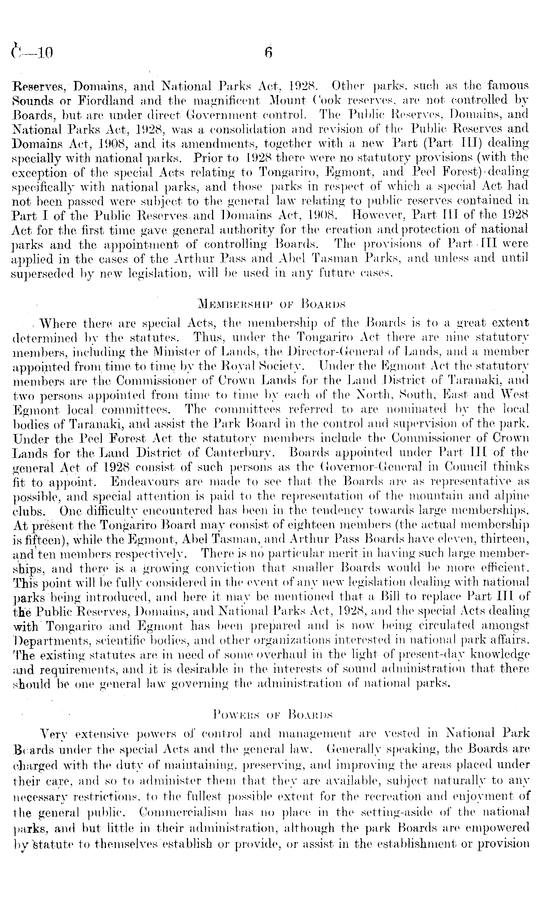 Reserves, Domains, and National Parks Act, 1928. Other parks, sucli as the famous Sounds or Fiordland and the magnificent Mount Gook reserves, are not controlled by Boards, but are under direct Government control. The Public Reserves, Domains, and National Parks Act, 1928, was a consolidation and revision of the Public Reserves and Domains Act, 1908, and its amendments, together with a new Part (Part III) dealing specially with national parks. Prior to 1928 there were no statutory provisions- (with the exception of the special Acts relating to Tongariro, Egmont, and Peel Forest) • dealing specifically with national parks, and those parks in respect of which a special Act had not been passed were subject to the general law relating to public reserves contained in Part lof the Public Reserves and Domains Act, 1908. However,. Part 111 of the 1928 Act-for the first time gave general authority for the creation and protection of national parks and the appointment of controlling Boards. The provisions of Part 111 were applied in the cases of the Arthur Pass and Abel Tasman Parks, and unless and until superseded by new legislation, will be used in any future cases. Membership of Boards - Where there are special Acts, the membership of the Boards is to a great extent determined by the statutes. Thus, under the Tongariro Act there are nine statutory members, including the Minister of Lands, the Director-General of Lands, and a member appointed from; time to time by the Royal Society. Under the Egmont Act the statutory members are the Commissioner of Crown Lands for the Land District of Taranaki, and two persons appointed from time to time by each of the North, South, East and West Egmont local committees. The committees referred to are nominated by the local bodies of Taranaki, and assist the Park Board in the control and supervision of the park. Under the Peel Forest Act the statutory members include the Commissioner of Crown Lands for the Land District of Canterbury. Boards appointed under Part 111 of the general Act of 1928 consist of such persons as the Governor-General in Council thinks fit to appoint. Endeavours are made to see that the Boards are as representative as possible, and special attention is paid to the representation of the mountain and alpine clubs. One difficulty encountered has been in the tendency towards large memberships. At present the Tongariro Board may consist of eighteen members (the actual membership is fifteen), while the Egmont, Abel Tasman, and Arthur Pass Boards have eleven, thirteen, anH ten members respectively. There is no particular merit in having such large memberships, and there is a growing conviction that smaller Boards would be more efficient. This point will l3e fully considered in the event of any new legislation dealing with national parks being introduced, and here it may be mentioned that a Bill to replace Part 111 of the Public Reserves, Domains, and National Parks Act, 1928, and the special Acts dealing with Tongariro and Egmont has been prepared and is now being circulated amongst Departments, scientific bodies, and other organizations interested in national park affairs. The existing statutes are in need of some overhaul in the light of present-day knowledge and requirements, and it is desirable in the interests of sound administration that there should be one general law governing the administration of national parks. Powers op Boards Very extensive powers of control and management are vested in National Park Beards under, the special Acts and the general law. Generally speaking, the Boards are charged with the duty of maintaining, preserving, and improving the areas placed under their care,, and so to administer them that they are available, subject naturally to any necessary restrictions, to the fullest possible extent for the recreation and enjoyment of the general public. Commercialism has no place in the setting-aside of the national parks, and but little in their administration, although the park Boards are empowered by statute to themselves establish or provide, or assist in the establishment or provision