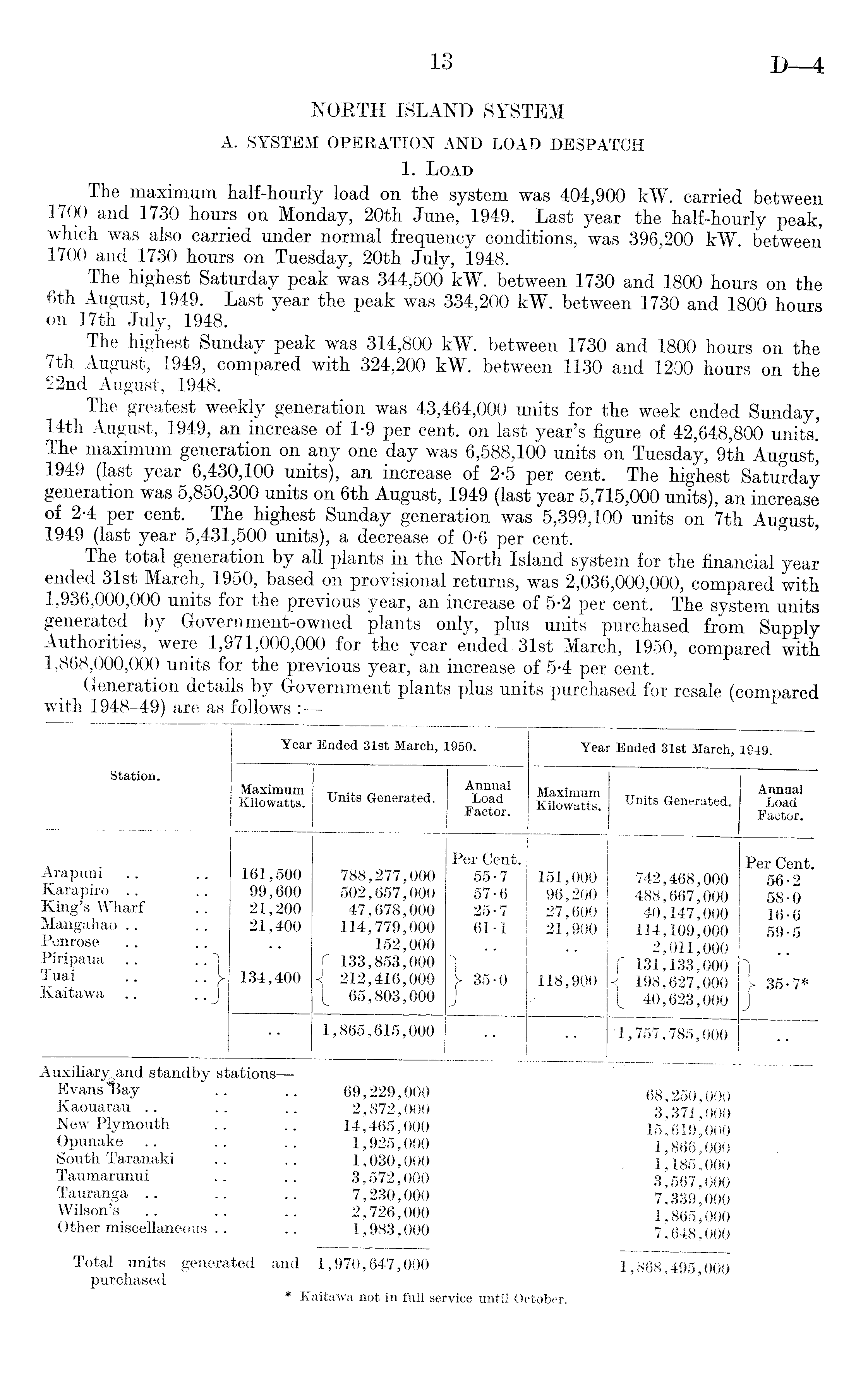 NORTH ISLAND SYSTEM A. SYSTEM OPERATION AND LOAD DESPATCH 1. Load The maximum half-hourly load on the system was 404,900 kW. carried between 1700 and 1730 hours on Monday, 20th June, 1949. Last year the half-hourly peak, which was also carried under normal frequency conditions, was 396,200 kW. between 1700 and 1730 hours on Tuesday, 20th July, 1948. The highest Saturday peak was 344,500 kW. between 1730 and 1800 hours on the 6th August, 1949. Last year the peak was 334,200 kW. between 1730 and 1800 hours on 17th July, 1948. The highest Sunday peak was 314,800 kW. between 1730 and 1800 hours on the 7th August, 1949, compared with 324,200 kW. between 1130 and 1200 hours on the 22nd August, 1948. The greatest weekly generation was 43,464,000 units for the week ended Sunday, 14th August, 1949, an increase of 1-9 per cent, on last year's figure of 42,648,800 units! The maximum generation on any one day was 6,588,100 units on Tuesday, 9th August, 1949 (last year 6,430,100 units), an increase of 2-5 per cent. The highest Saturday generation was 5,850,300 units on 6th August, 1949 (last year 5,715,000 units), an increase of 2-4 per cent. The highest Sunday generation was 5,399,100 units on 7th August, 1949 (last year 5,431,500 units), a decrease of 0-6 per cent. The total generation by all plants in the North Island system for the financial year ended 31st March, 1950, based on provisional returns, was 2,036,000,000, compared with 1,936,000,000 units for the previous year, an increase of 5-2 per cent. The system units generated by Government-owned plants only, plus units purchased from Supply Authorities, were 1,971,000,000 for the year ended . 31st March, 1950, compared with 1,868,000,000 units for the previous year, an increase of 5-4 per cent.
