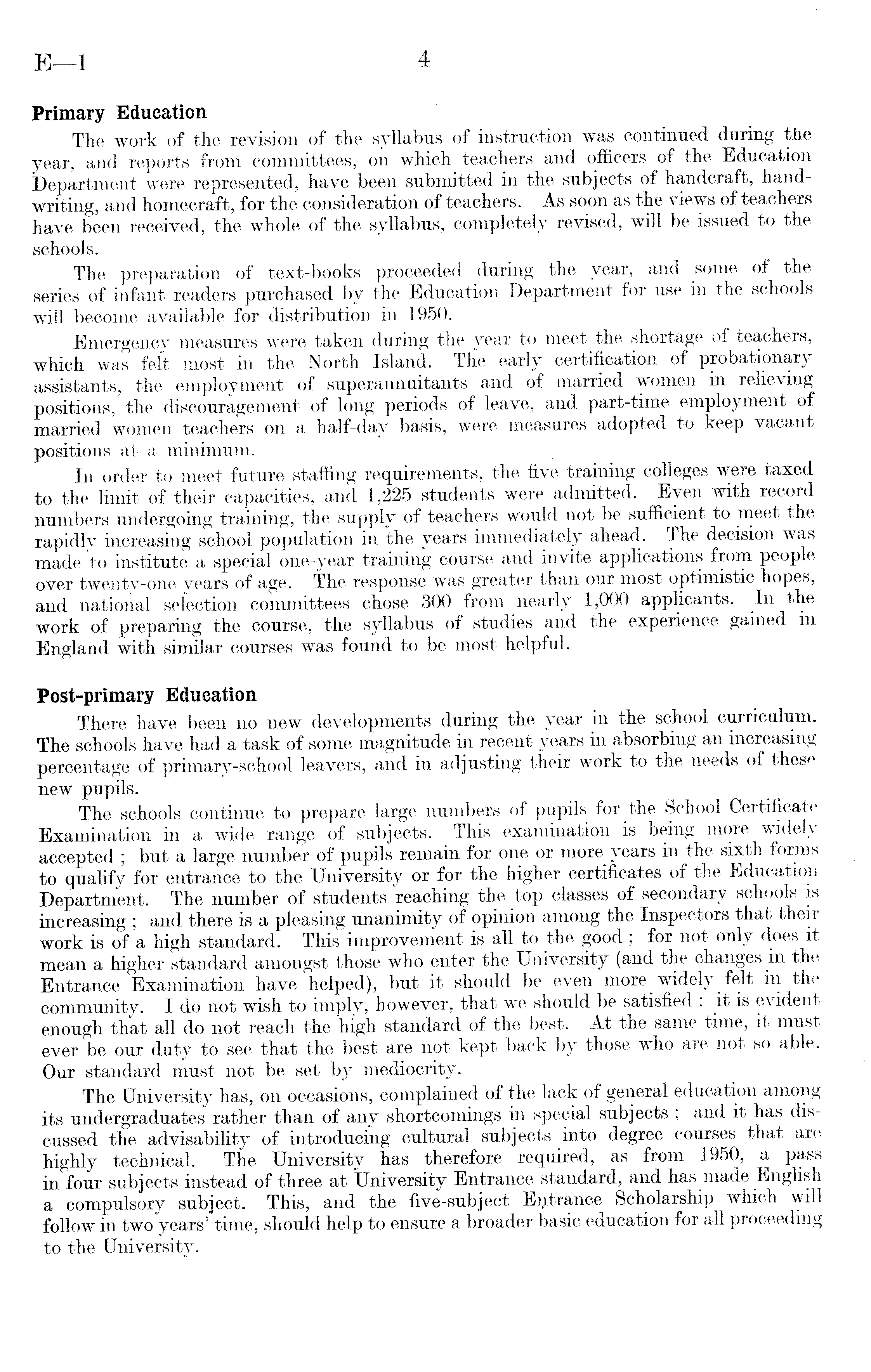 Primary Education The work of the revision of the syllabus of instruction was continued during the year, and reports from committees, on which teachers and officers of the Education Department were represented, have been submitted in the subjects of handcraft, handwriting, and homecraft, for the consideration of teachers. As soon as the views of teachers have been received, the whole of the syllabus, completely revised, will be issued to the schools. The preparation of text-books proceeded during the year, and some of the series of infant readers purchased by the Education Department for use in the schools will become available for distribution in 1950. Emergency measures were taken during the year to meet the shortage, of teachers, which was felt most in the North Island. The early certification of probationary assistants, the employment of superammitants and of married women in relieving positions,'the discouragement of long periods of leave, and part-time employment of married women teachers on a half-day basis, were measures adopted to keep vacant positions at a minimum. In order to meet future staffing requirements, the five training colleges were taxed to the limit of their capacities, and 1,225 students were admitted. Even with record numbers undergoing training, the supply of teachers would not be sufficient to meet the rapidly increasing school population in the years immediately ahead. The decision was made to institute a special one-year training course and invite applications from people over twenty-one years of age. The response was greater than our most optimistic hopes, and national selection committees chose 300 from nearly 1,000 applicants. In the work of preparing the course, the syllabus of studies and the experience gained m England with similar courses was found to be most helpful. Post-primary Education There have been no new developments during the year in the school curriculum. The schools have had a task of some magnitude in recent years in absorbing an increasing percentage of primary-school leavers, and in adjusting their work to the needs of these new pupils. The schools continue to prepare large numbers of pupils for the School Certificate Examination in a wide range of subjects. This examination is being more widely accepted ; but a large number of pupils remain for one or more years in the sixth forms to qualify for entrance to the University or for the higher certificates of the Education Department. The number of students reaching the top classes of secondary schools is increasing ; and there is a pleasing unanimity of opinion among the Inspectors that their work is of a high standard. This improvement is all to the good ; for not only does it mean a higher standard amongst those who enter the University (and the changes m the Entrance Examination have helped), but it should be even more widely felt m the community. Ido not wish to imply, however, that we should be satisfied ; it is evident enough that all do not reach the high standard of the best. At the same time, it must ever be our duty to see that the best are not kept back by those who are not so able. Our standard must not be set by mediocrity. The University has, on occasions, complained of the lack of general education among its undergraduates rather than of any shortcomings in special subjects ; and it has discussed the advisability of introducing cultural subjects into degree courses that are highly technical. The University has therefore required, as from 1950, a pass in four subjects instead of three at University Entrance standard, and has made English a compulsory subject. This, and the five-subject Entrance Scholarship which will follow in two years' time, should help to ensure a broader basic education for all proceeding to the University.