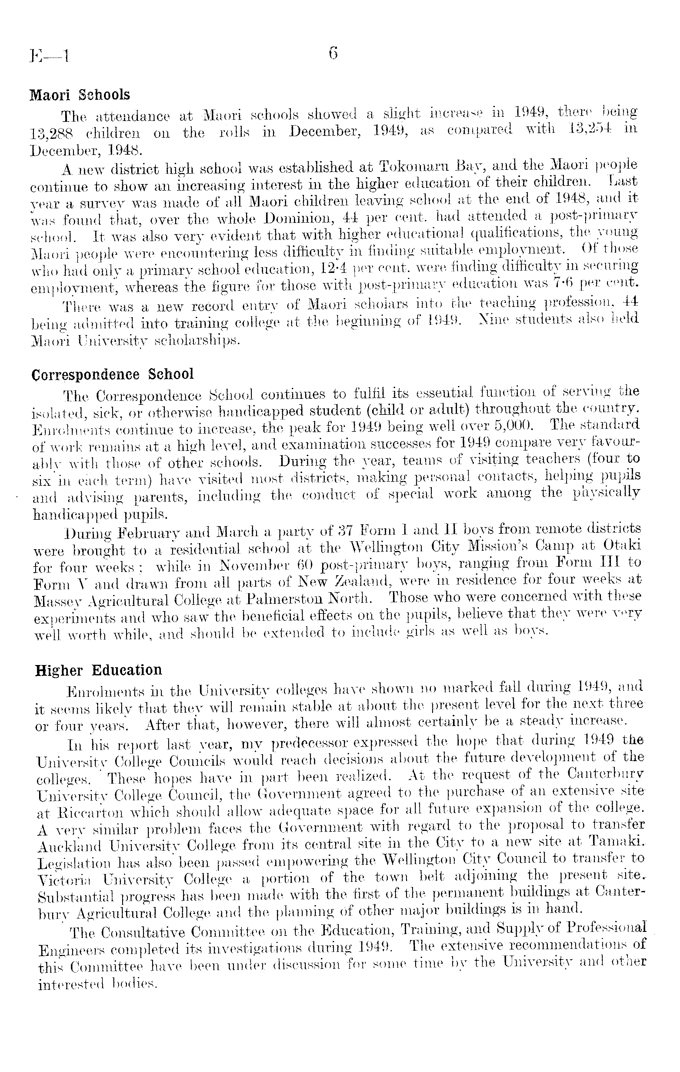 Maori Schools The attendance at Maori schools showed a slight increase in 1949, there being 13,288 children on the rolls in December, 1949, as compared with 13,254 m December, 1948. A new district high school was established at Tokomaru Bay, and the Maori people continue to show an increasing interest in the higher education of their children. Last year a survey was made of all Maori children leaving school at the end of 1948, and it was found that, over the whole Dominion, 44 per cent, had attended a post-primary school. It was also very evident that with higher educational qualifications, the young Maori people were encountering less difficulty in finding suitable employment. Of those who had only a primary school education, 12-4 per cent, were finding difficulty in securing employment, whereas the figure for those with post-primary education was 7-6 per cent. There was a new record entry of Maori scholars into the teaching profession, 44 being admitted into training college at the beginning of 1949. Nine students also held Maori University scholarships. Correspondence School The Correspondence School continues to fulfil its essential function of serving the isolated, sick, or otherwise handicapped student (child or adult) throughout the country. Enrolments continue to increase, the peak for 1949 being well over 5,000. The standard of work remains at a high level, and examination successes for 1949 compare very favourably with those of other schools. During the year, teams of visiting teachers (four to six in each term) have visited most districts, making personal contacts, helping pupils and advising parents, including the conduct of special work among the physically handicapped pupils. During February and March a party of 37 Form I and II boys from remote districts were brought to a residential school at the Wellington City Mission's Camp at Otaki for four weeks ; while in November 60 post-primary boys, ranging from Form 111 to Form V and drawn from all parts of New Zealand, were in residence for four weeks at Massey Agricultural College at Palmerston North. Those who were concerned with these experiments and who saw the beneficial effects on the pupils, believe that they were very well worth while, and should be extended to include girls as well as boys. Higher Education Enrolments in the University colleges have shown no marked fall during 1949, and it seems likely that they will remain stable at about the present level for the next threeor four years". After that, however, there will almost certainly be a steady increase. In his report last year, mv predecessor expressed the hope that during 1949 the University College Councils would reach decisions about the future development of the colleges. ' These hopes have in part been realized. At the request of the Canterbury University College Council, the Government agreed to the purchase of an extensive site at Riccarton which should allow adequate space for all future expansion of the college. A very similar problem faces the Government with regard to the proposal to transfer Auckland University College from its central site in the City to a new site at Tamaki. Legislation has also' been passed empowering the Wellington City Council to transfer toVictoria University College a portion of the town belt adjoining the present site. Substantial progress has been made with the first of the permanent buildings at Canterbury Agricultural College and the planning of other major buildings is in hand. The Consultative Committee on the Education, Training, and Supply of Professional Engineers completed its investigations during 1949. The extensive recommendations of this Committee have been under discussion for some time by the University and other interested bodies.