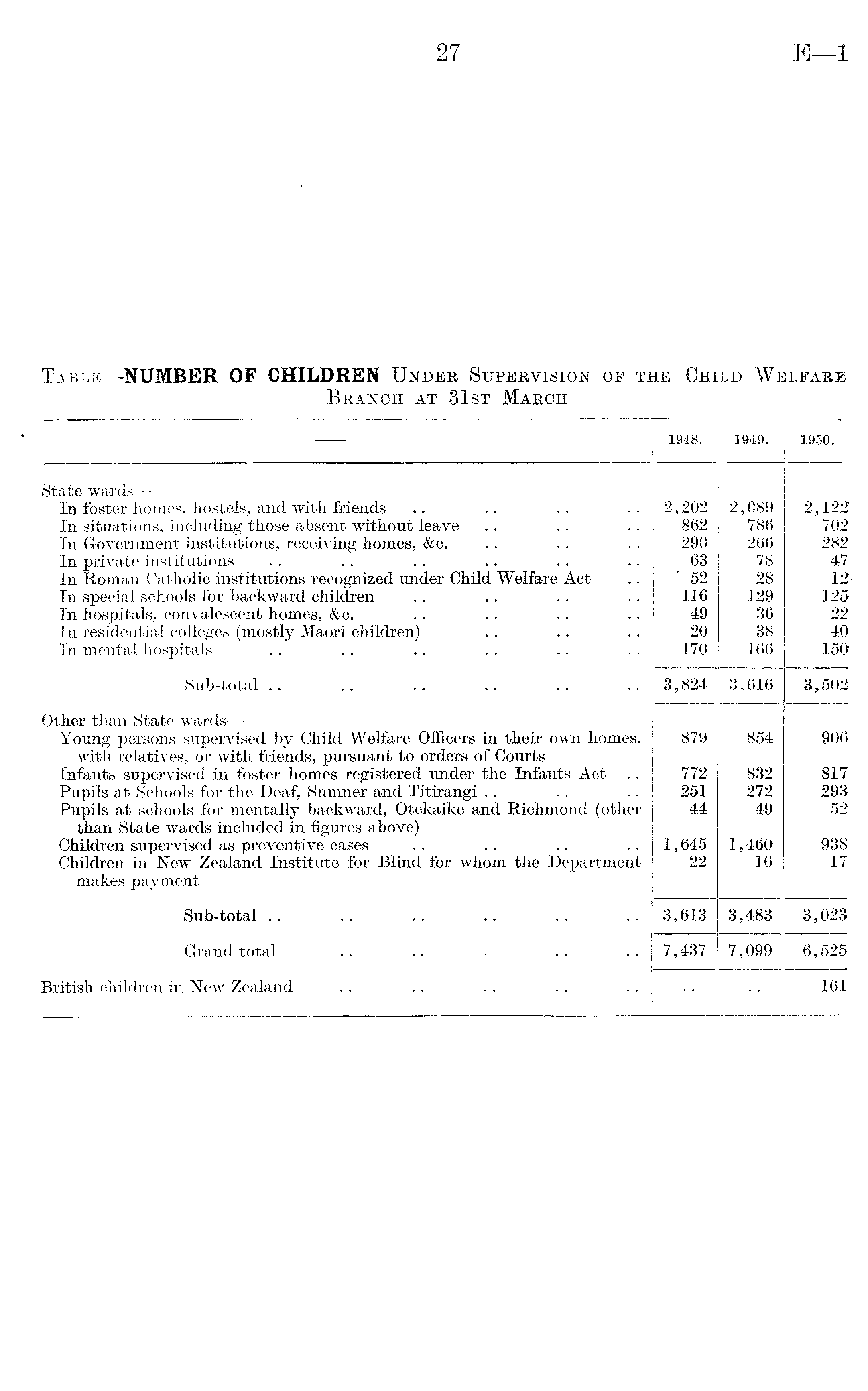 1948. 1949. 1950. State wards — In foster homes, hostels, and with friends 2,202 2,089 2,122 In situations, including those absent without leave 862 786 702 In Government institutions, receiving homes, &c. 290 266 282 In private institutions 63 78 47 In Roman Catholic institutions recognized under Child Welfare Act 52 28 12 In special schools for backward children .. .. 116 129 125 In hospitals, convalescent homes, &c. 49 36 22 In residential colleges (mostly Maori children) 20 38 40 In mental hospitals 170 166 150 Sub-total 3,824 3,616 3,502 Other than State wards — Young persons supervised by Child Welfare Officers in their own homes, 879 854 906 with relatives, or with friends, pursuant to orders of Courts Infants supervised in foster homes registered under the Infants Act 772 832 817 Pupils at Schools for the Deaf, Sumner and Titirangi 251 272 293 Pupils at schools for mentally backward, Otekaike and Richmond (other 44 49 52 than State wards included in figures above) Children supervised as preventive cases 1,645 1,460 938 Children in New Zealand Institute for Blind for whom the Department 22 16 17 makes payment Sub-total 3,613 3,483 3,023 Grand total 7,437 7,099 6,525 British children in New Zealand 161