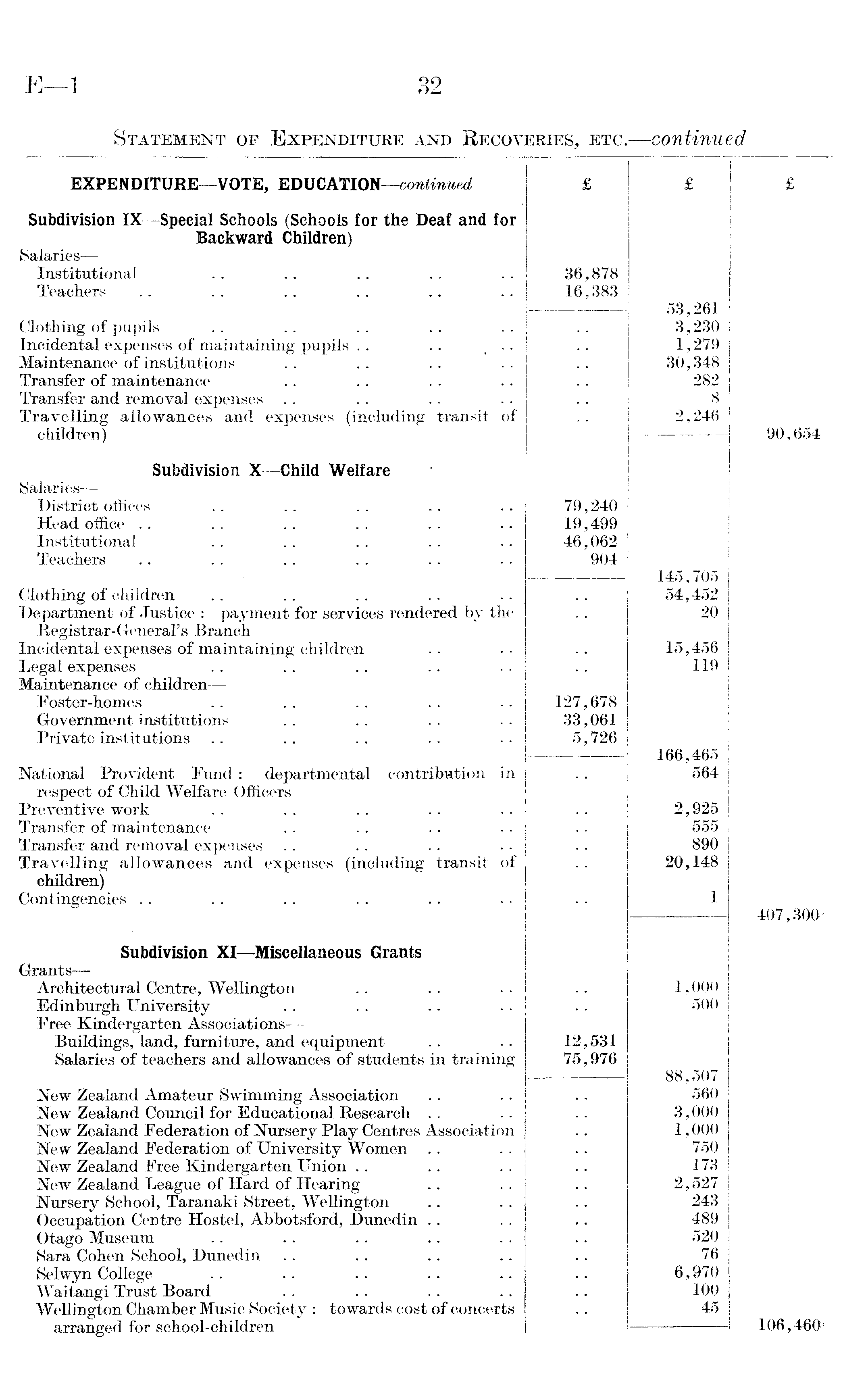 EXPENDITURE—VOTE, EDUCATION— continued £ £ £ Subdivision IX -Special Schools (Schools for the Deaf and for Backward Children) Salaries — Institutional 36,878 Teachers 16,383 53,261 Clothing of pupils 3^230 Incidental expenses of maintaining pupils . . . . 1,279 Maintenance of institutions . . .. 30,348 Transfer of maintenance 282 Transfer and removal expenses 8 Travelling allowances and expenses (including transit of 2,246 children) 90,654 Subdivision X—Child Welfare Salaries — District offices 79,240 Head office 19,499 Institutional 46,062 Teachers 904 145,705 Clothing of children 54^452 Department of Justice : payment for services rendered by the 20 Registrar-General's Branch Incidental expenses of maintaining children 15,456 Legal expenses 119 Maintenance of children— Foster-homes 127,678 Government institutions 33,061 Private institutions 5,726 166,465 National Provident Fund : departmental contribution in 564 respect of Child Welfare Officers Preventive work 2,925 Transfer of maintenance 555 Transfer and removal expenses 890 Travelling allowances and expenses (including transit of 20,148 children) Contingencies 1 407 300Subdivision XI—Miscellaneous Grants TtV i j *J\J\J' Grants — Architectural Centre, Wellington 1,000 Edinburgh University 500 Free Kindergarten Associations — Buildings, land, furniture, and equipment 12,531 Salaries of teachers and allowances of students in training 75,976 88 507 New Zealand Amateur Swimming Association '560 New Zealand Council for Educational Research 3,000 New Zealand Federation of Nursery Play Centres Association 1,000 New Zealand Federation of University Women 750 New Zealand Free Kindergarten Union 173 New Zealand League of Hard of Hearing 2,527 Nursery School, Taranaki Street, Wellington 243 Occupation Centre Hostel, Abbotsford, Dunedin 489 Otago Museum 520 Sara Cohen School, Dunedin 76 Selwyn College 6,970 Waitangi Trust Board 100 Wellington Chamber Music Society : towards cost of concerts 45 arranged for school-children 106,460*