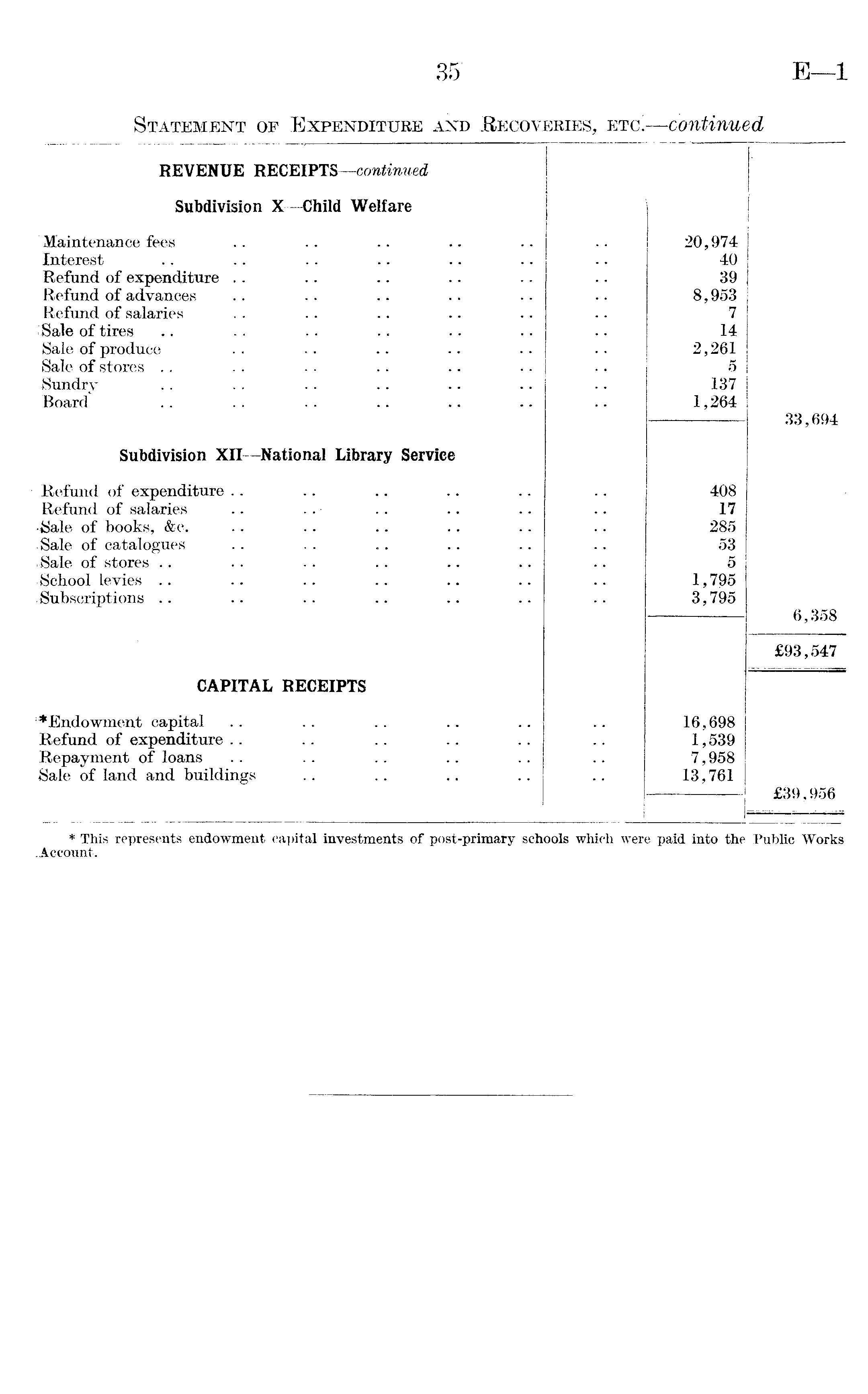 REVENUE RECEIPTS —continued Subdivision X—Child Welfare Maintenance fees Interest Refund of expenditure Refund of advances Refund of salaries Sale of tires Sale of produce Sale of stores Sundry .. .. .. .. .. Board .. .. .. .. .. 20,974 40 39 8,953 7 14 2,261 5 137 1,264 33,694 Subdivision XII—National Library Service Refund of expenditure Refund of salaries ■Sale of books, &c. .Sale of catalogues ■Sale of stores School levies Subscriptions 408 17 285 53 5 1,795 3,795 6,358 £93,547 CAPITAL RECEIPTS ■♦Endowment capital Refund of expenditure Repayment of loans Sale of land and buildings 16,698 1,539 7,958 13,761 £39,956 * This represents endowment capital investments of post-primary schools which were paid into the Public Works .Account.