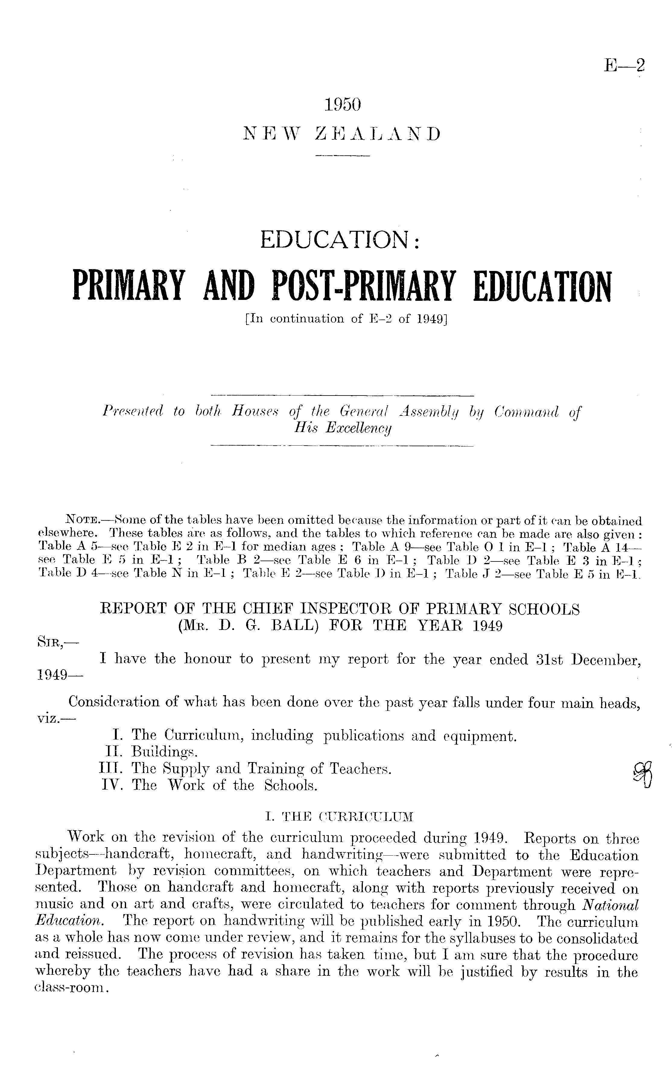 Note.-—Some of the tables have been omitted because the information or part of it can be obtained elsewhere. These tables are as follows, and the tables to which reference can be made are also given : Table A s—see Table E2 in E-l for median ages ; Table A 9—see Table 01 in E-l ; Table A 14— see Table E5 in E-l ; Table B 2—see Table E6 in E-l ; Table D 2—see Table E3 in E-l •; Table D 4—see Table Nin E-l ; Table E 2—see Table Din E-l ; Table J 2—see Table E5 in E-l. EEPOET OF THE CHIEF INSPECTOK OF PPJMAKY SCHOOLS (Mr. D. G. BALL) FOE THE YEAE 1949 Sir I have the honour to present my report for the year ended 31st December, 1949 Consideration of what has been done over the past year falls under four main heads, viz.— I. The Curriculum, including publications and equipment. 11. Buildings. 111. The Supply and Training of Teachers. £& IV. The Work of the Schools. I. THE CURRICULUM Work on the revision of the curriculum proceeded during 1949. Eeports on three subjects—handcraft, homecraft, and handwriting—were submitted to the Education Department by revision committees, on which teachers and Department were represented. Those on handcraft and homecraft, along with reports previously received on music and on art and crafts, were circulated to teachers for comment through National Education. The report on handwriting will be published early in 1950. The curriculum as a whole has now come under review, and it remains for the syllabuses to be consolidated and reissued. The process of revision has taken time, but lam sure that the procedure whereby the teachers have had a share in the work will be justified by results in the class-room.