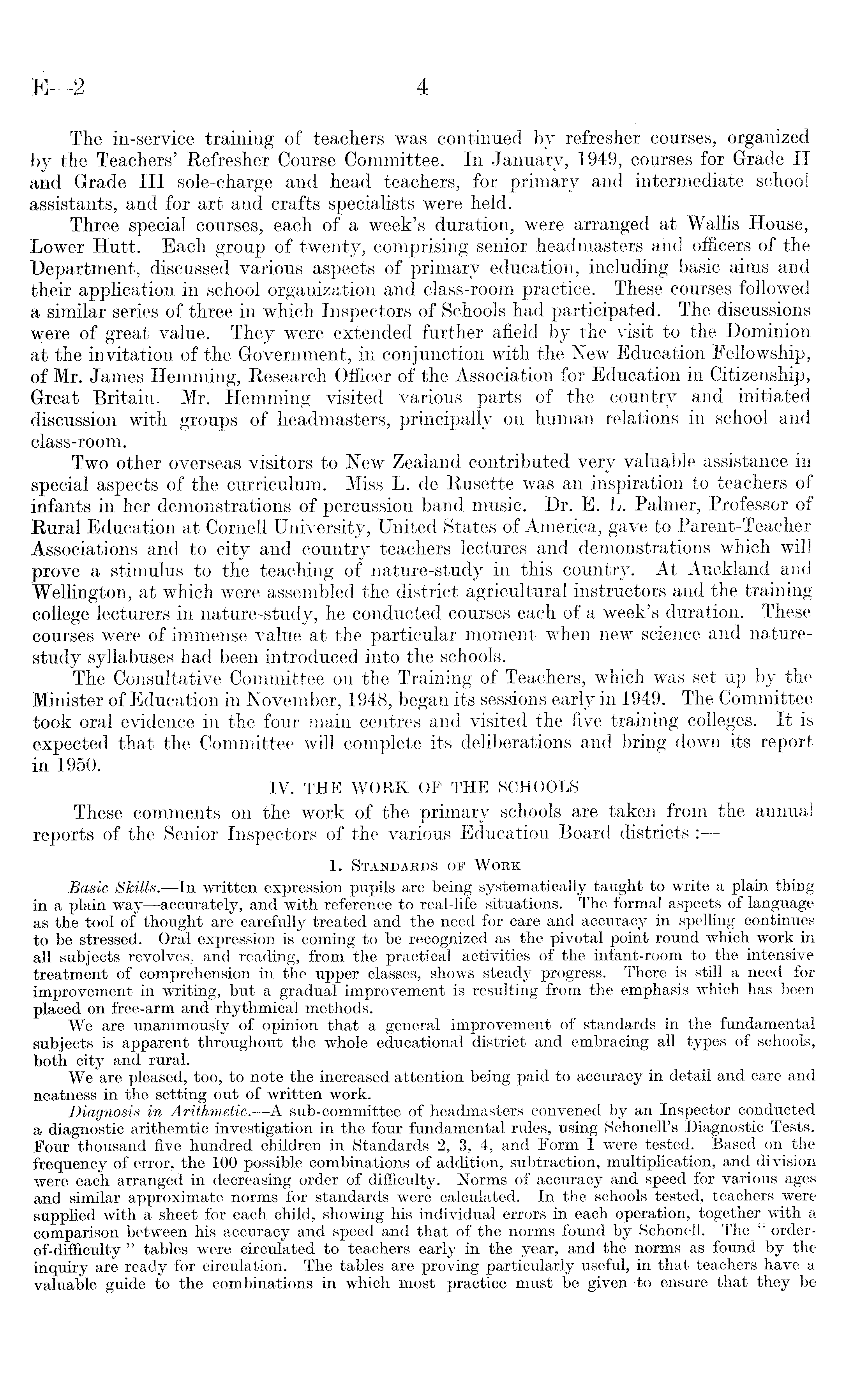 The in-service training of teachers was continued by refresher courses, organized by the Teachers' Refresher Course Committee. In January, 1949, courses for Grade II and Grade 111 sole-charge and head teachers, for primary and intermediate school assistants, and for art and crafts specialists were held. Three special courses, each of a week's duration, were arranged at Wallis House, Lower Hutt. Each group of twenty, comprising senior headmasters and officers of the Department, discussed various aspects of primary education, including basic aims and their application in school organization and class-room practice. These courses followed a similar series of three in which Inspectors of Schools had participated. The discussions were of great value. They were extended further afield by the visit to the Dominion at the invitation of the Government, in conjunction with the New Education Fellowship, of Mr. James Hemming, Research Officer of the Association for Education in Citizenship, Great Britain. Mr. Hemming visited various parts of the country and initiated discussion with groups of headmasters, principally on human relations in school and class-room. Two other overseas visitors to New Zealand contributed very valuable assistance in special aspects of the curriculum. Miss L. de Rusette was an inspiration to teachers of infants in her demonstrations of percussion band music. Dr. E. L. Palmer, Professor of Rural Education at Cornell University, United States of America, gave to Parent-Teacher Associations and to city and country teachers lectures and demonstrations which will prove a stimulus to the teaching of nature-study in this country. At Auckland and Wellington, at which were assembled the district agricultural instructors and the trainingcollege lecturers in nature-study, he conducted courses each of a week's duration. These courses were of immense value at the particular moment when new science and naturestudy syllabuses had been introduced into the schools. The Consultative Committee on the Training of Teachers, which was set up by the Minister of Education in November, 1948, began its sessions early in 1949. The Committee took oral evidence in the four main centres and visited the five training colleges. It is expected that the Committee will complete its deliberations and bring down its report in 1950. IV. THE WORK OF THE SCHOOLS These comments on the work of the primary schools are taken from the annual reports of the Senior Inspectors of the various Education Board districts : 1. Standards of Wobk Basic Skills. —ln written expression pupils are being systematically taught to write a plain thing in a plain way—accurately, and with reference to real-life situations. The formal aspects of language as the tool of thought are carefully treated and the need for care and accuracy in spelling continues to be stressed. Oral expression is coming to be recognized as the pivotal point round which work in all subjects revolves, and reading, from the practical activities of the infant-room to the intensive treatment of comprehension in the upper classes, shows steady progress. There is still a need for improvement in writing, but a gradual improvement is resulting from the emphasis which has been placed on free-arm and rhythmical methods. We are unanimously of opinion that a general improvement of standards in the fundamental subjects is apparent throughout the whole educational district and embracing all types of schools, both city and rural. We are pleased, too, to note the increased attention being paid to accuracy in detail and care and neatness in the setting out of written work. Diagnosis in Arithmetic. —A sub-committee of headmasters convened by an Inspector conducted a diagnostic arithemtic investigation in the four fundamental rules, using Schonell's Diagnostic Tests. Four thousand five hundred children in Standards 2, 3, 4, and Form I were tested. Based on the frequency of error, the 100 possible combinations of addition, subtraction, multiplication, and division were each arranged in decreasing order of difficulty. Norms of accuracy and speed for various ages and similar approximate norms for standards were calculated. In the schools tested, teachers were supplied with a sheet for each child, showing his individual errors in each operation, together with a comparison between his accuracy and speed and that of the norms found by Schonell. The " order-of-difficulty " tables were circulated to teachers early in the year, and the norms as found by the inquiry are ready for circulation. The tables are proving particularly useful, in that teachers have a valuable guide to the combinations in which most practice must be given to ensure that they be