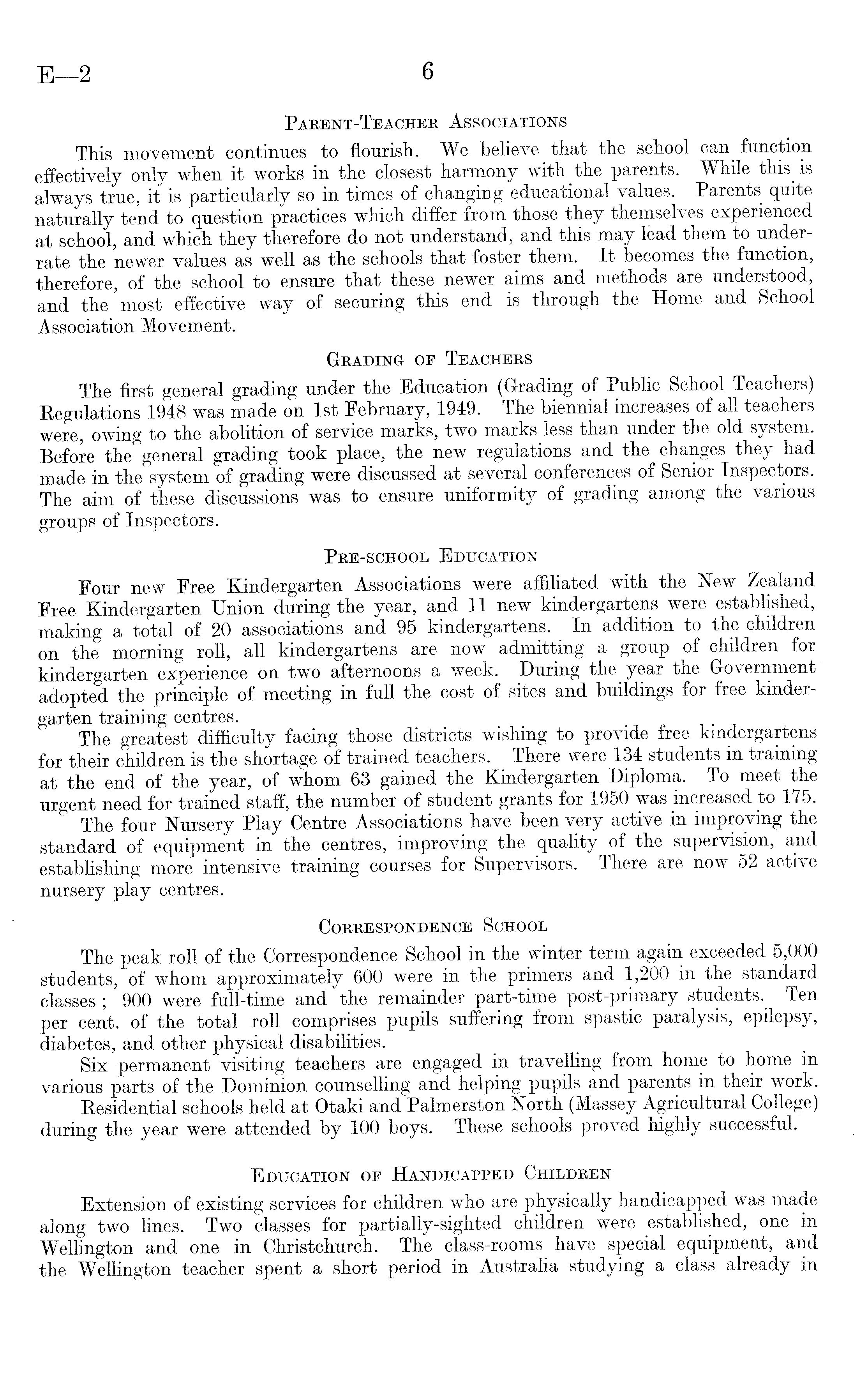Parent-Teacher Associations This movement continues to nourish. We believe that the school can function effectively only when it works in the closest harmony with the parents. While this is always true, it is particularly so in times of changing educational values. Parents quite naturally tend to question practices which differ from those they themselves experienced at school, and which they therefore do not understand, and this may lead them to underrate the newer values as well as the schools that foster them. It becomes the function, therefore, of the school to ensure that these newer aims and methods are understood, and the most effective way of securing this end is through the Home and School Association Movement. Grading of Teachers The first general grading under the Education (Grading of Public School Teachers) Eegulations 1948 was made on Ist February, 1949. The biennial increases of all teachers were, owing to the abolition of service marks, two marks less than under the old system. Before the general grading took place, the new regulations and the changes they had made in the system of grading were discussed at several conferences of Senior Inspectors. The aim of these discussions was to ensure uniformity of grading among the various groups of Inspectors. Pre-school Education Four new Free Kindergarten Associations were affiliated with the New Zealand Free Kindergarten Union during the year, and 11 new kindergartens were established, making a total of 20 associations and 95 kindergartens. In addition to the children on the morning roll, all kindergartens are now admitting a group of children for kindergarten experience on two afternoons a week. During the year the Government adopted the principle of meeting in full the cost of sites and buildings for free kindergarten training centres. The greatest difficulty facing those districts wishing to provide free kindergartens for their children is the shortage of trained teachers. There were 134 students in training at the end of the year, of whom 63 gained the Kindergarten Diploma. To meet the urgent need for trained staff, the number of student grants for 1950 was increased to 175. The four Nursery Play Centre Associations have been very active in improving the standard of equipment in the centres, improving the quality of the supervision, and establishing more intensive training courses for Supervisors. There are now 52 active nursery play centres. Correspondence School The peak roll of the Correspondence School in the winter term again exceeded 5,000 students, of whom approximately 600 were in the primers and 1,200 in the standard classes ; 900 were full-time and the remainder part-time post-primary students. Ten per cent, of the total roll comprises pupils suffering from spastic paralysis, epilepsy, diabetes, and other physical disabilities. Six permanent visiting teachers are engaged in travelling from home to home in various parts of the Dominion counselling and helping pupils and parents in their work. Residential schools held at Otaki and Palmerston North (Massey Agricultural College) during the year were attended by 100 boys. These schools proved highly successful. Education of Handicapped Children Extension of existing services for children who are physically handicapped was made along two lines. Two classes for partially-sighted children were established, one in Wellington and one in Christchurch. The class-rooms have special equipment, and the Wellington teacher spent a short period in Australia studying a class already in
