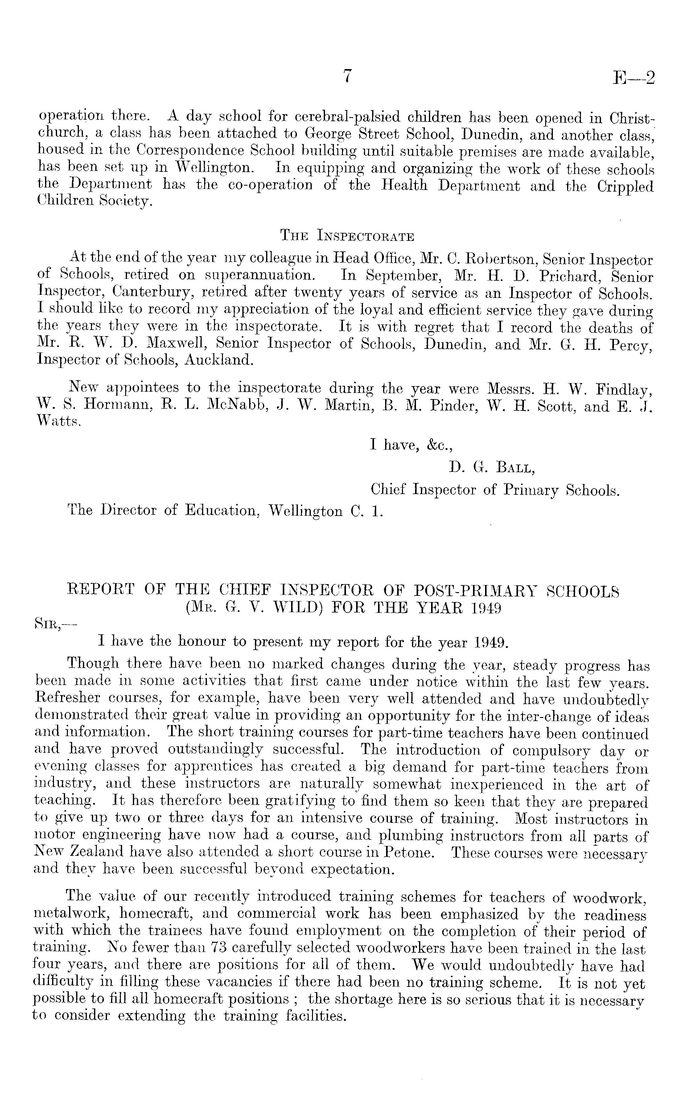 operation there. A day school for cerebral-palsied children has been opened in Christchurch, a class has been attached to George Street School, Dunedin, and another class, housed in the Correspondence School building until suitable premises are made available, has been set up in Wellington. In equipping and organizing the work of these schools the Department has the co-operation of the Health Department and the Crippled Children Society. The Inspectorate At the end of the year my colleague in Head Office, Mr. C. Robertson, Senior Inspector of Schools, retired on superannuation. In September, Mr. H. D. Prichard, Senior Inspector, Canterbury, retired after twenty years of service as an Inspector of Schools. I should like to record my appreciation of the loyal and efficient service they gave during the years they were in the inspectorate. It is with regret that I record the deaths of Mr. E. W. D. Maxwell, Senior Inspector of Schools, Dunedin, and Mr. G. H. Percy, Inspector of Schools, Auckland. New appointees to the inspectorate during the year were Messrs. H. W. Findlay, W. S. Hormann, R. L. McNabb, J. W. Martin, B. M. Pinder, W. H. Scott, and E. J. Watts. I have, &c, D. G. Ball, Chief Inspector of Primary Schools. The Director of Education, Wellington C. 1. REPORT OF THE CHIEF INSPECTOR OF POST-PRIMARY SCHOOLS (Mr. G. V. WILD) FOR THE YEAR 1949 Sir I have the honour to present my report for the year 1949. Though there have been no marked changes during the year, steady progress has been made in some activities that first came under notice within the last few years. Refresher courses, for example, have been very well attended and have undoubtedly demonstrated their great value in providing an opportunity for the inter-change of ideas and information. The short training courses for part-time teachers have been continued and have proved outstandingly successful. The introduction of compulsory day or evening classes for apprentices has created a big demand for part-time teachers from industry, and these instructors are naturally somewhat inexperienced in the art of teaching. It has therefore been gratifying to find them so keen that they are prepared to give up two or three days for an intensive course of training. Most instructors in motor engineering have now had a course, and plumbing instructors from all parts of New Zealand have also attended a short course in Petone. These courses were necessary and they have been successful beyond expectation. The value of our recently introduced training schemes for teachers of woodwork, metalwork, homecraft, and commercial work has been emphasized by the readiness with which the trainees have found employment on the completion of their period of training. No fewer than 73 carefully selected woodworkers have been trained in the last four years, and there are positions for all of them. We would undoubtedly have had difficulty in filling these vacancies if there had been no training scheme. It is not yet possible to fill all homecraft positions ; the shortage here is so serious that it is necessary to consider extending the training facilities.