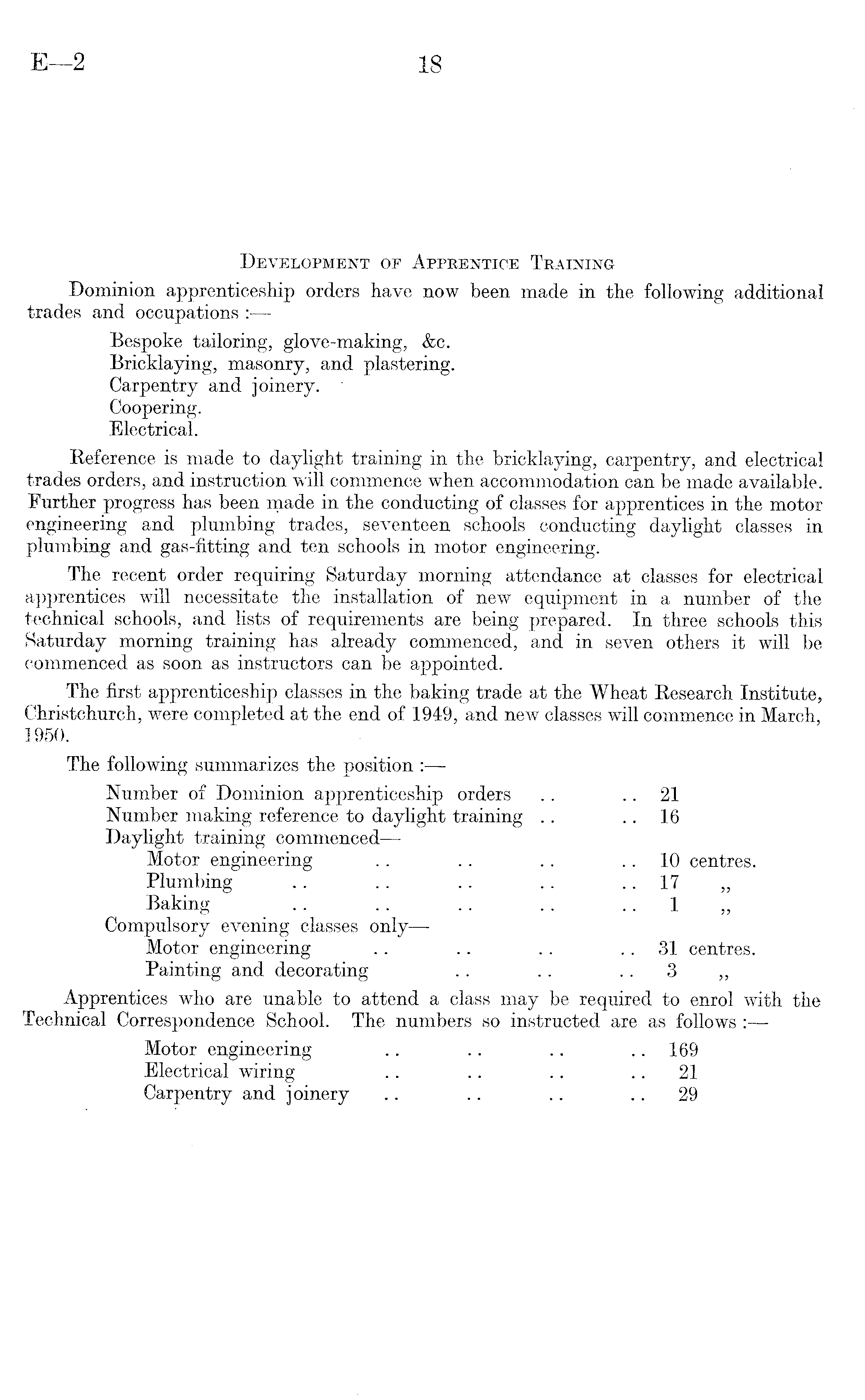 Development of Appeentice Training Dominion apprenticeship orders have now been made in the following additional trades and occupations : Bespoke tailoring, glove-making, &c. Bricklaying, masonry, and plastering. Carpentry and joinery. Coopering. Electrical. Reference is made to daylight training in the bricklaying, carpentry, and electrical trades orders, and instruction will commence when accommodation can be made available. Further progress has been made in the conducting of classes for apprentices in the motor engineering and plumbing trades, seventeen schools conducting daylight classes in plumbing and gas-fitting and ten schools in motor engineering. The recent order requiring Saturday morning attendance at classes for electrical apprentices will necessitate the installation of new equipment in a number of the technical schools, and lists of requirements are being prepared. In three schools this Saturday morning training has already commenced, and in seven others it will be commenced as soon as instructors can be appointed. The first apprenticeship classes in the baking trade at the Wheat Research Institute, Christchurch, were completed at the end of 1949, and new classes will commence in March, 1950. The following summarizes the position : Number of Dominion apprenticeship orders .. .. 21 Number making reference to daylight training .. .. 16 Daylight training commenced —■ Motor engineering . . .. .. 10 centres. Plumbing .. . . .. .. .. 17 Baking . . . . .. .. .. 1 „ Compulsory evening classes only— Motor engineering .. .. .. 31 centres. Painting and decorating .. . . .. 3 „ Apprentices who are unable to attend a class may be required to enrol with the Technical Correspondence School. The numbers so instructed are as follows : Motor engineering .. .. .. 169 Electrical wiring .. .. .. 21 Carpentry and joinery .. .. .. 29