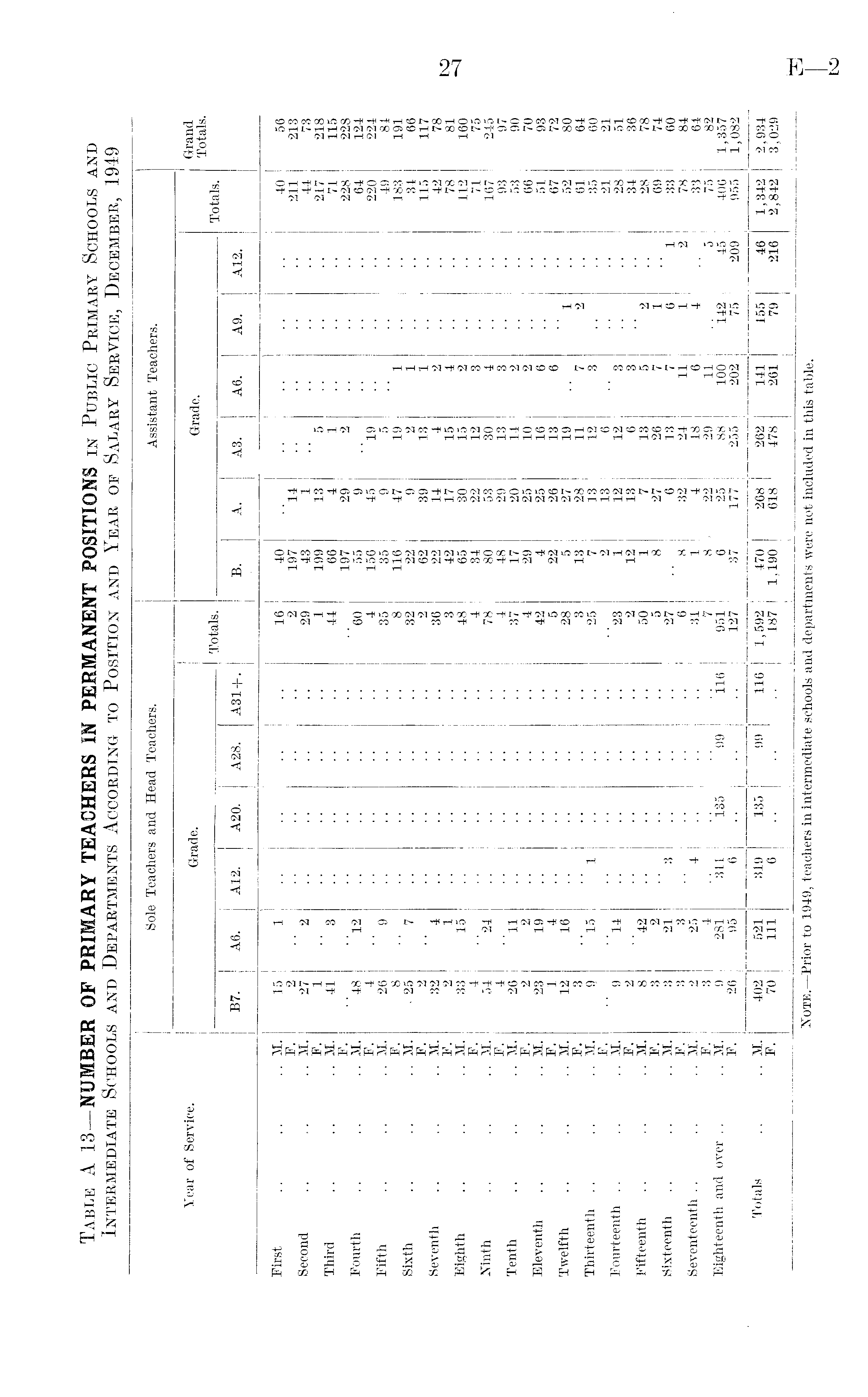 Year of Service. Sole Teachers and Head Teachers. Assistant Teachers. Grand Totals. Grade. Totals. Grade. Totals. B7. A6. A12. A20. A28. A31 + . B. A. A3. A6. A9. A12. First .. M. 15 1 /; !. 16 40 40 56 F. 2 2 197 14 211 213 Second .. M. 27 2 29 43 1 44 73 Third F. 1 1 199 13 5 217 218 . . M. 41 3 44 66 4 1 71 115 F. 197 29 2 228 228 Fourth . . M. ' *48 ' 12 ' '60 55 9 64 124 Fifth F. 4 4 156 45 19 220 224 .. M. 26 9 35 35 9 5 49 84 F. 8 8 116 47 19 1 183 191 Sixth . . M. • 25 7 32 22 9 2 1 34 66 F. 2 2 62 39 13 1 115 117 Seventh .. M. 32 4 36 22 14 4 2 42 78 F. 2 1 3 42 17 15 4 78 81 Eighth .. M. 33 15 48 65 30 15 2 112 160 F. 4 4 34 22 12 3 71 75 Ninth . . M. 54 ' '24 78 80 53 30 4 167 245 F. 4 4 48 29 13 3 93 97 Tenth .. M. 26 ''ll 37 17 20 14 2 53 90 F. 2 2 4 29 25 10 2 66 70 Eleventh .. M. 23 19 42 4 25 16 6 51 93 F. 1 4 5 22 26 13 6 67 72 Twelfth . . M. 12 16 28 5 27 19 1 52 80 Thirteenth F. 3 3 13 28 11 7 2 61 64 .. M. 9 15 1 25 7 13 12 3 35 60 F. 2 13 6 21 21 Fourteenth .. M. 9 14 ' *23 1 12 12 3 28 51 F. 2 2 12 13 6 3 34 36 Fifteenth . . M. 8 ' *42 50 1 7 13 5 2 28 78 F. 3 2 5 8 27 26 7 1 69 74 Sixteenth .. M. 3 21 3 27 6 18 7 6 1 33 60 F. 3 3 6 8 32 24 11 1 2 78 84 Seventeenth .. M. 2 25 4 31 1 4 18 6 4 33 64 F. 3 4 7 8 22 29 11 5 75 82 Eighteenth and over .. .. M. 9 281 311 i.35 ' '99 il6 951 6 25 88 100 'l42 45 406 1,357 F. 26 95 6 127 37 177 255 202 75 209 955 1,082 Totals .. M. F. 402 70 521 111 319 6 135 99 116 1,592 187 470 1,190 268 618 262 478 141 261 155 79 46 216 1,342 2,842 2,934 3,029