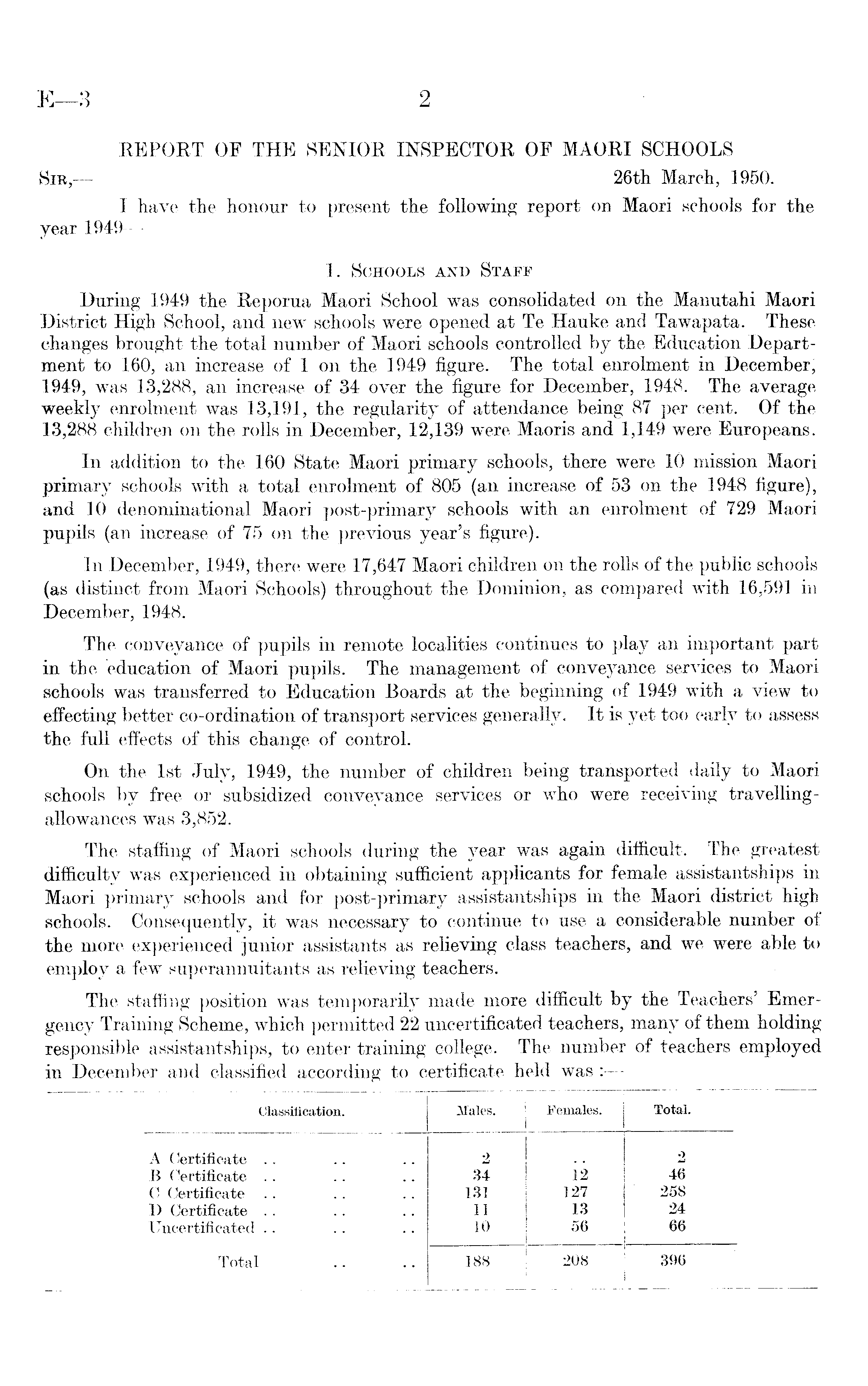 REPORT OF THE SENIOR INSPECTOR OF MAORI SCHOOLS Sir, — 26th March, 1950. I have the honour to present the following report on Maori schools for the year 1949 1. Schools and Staff During 1949 the Reporua Maori School was consolidated on the Manutahi Maori District High School, and new schools were opened at Te Hauke and Tawapata. These changes brought the total number of Maori schools controlled by the Education Department to 160, an increase of 1 on the 1949 figure. The total enrolment in December, 1949, was 13,288, an increase of 34 over the figure for December, 1948. The average weekly enrolment was 13,191, the regularity of attendance being 87 per cent. Of the 13,288 children on the rolls in December, 12,139 were Maoris and 1,149 were Europeans. In addition to the 160 State Maori primary schools, there were 10 mission Maori primary schools with a total enrolment of 805 (an increase of 53 on the 1948 figure), and 10 denominational Maori post-primary schools with an enrolment of 729 Maori pupils (an increase of 75 on the previous year's figure). In December, 1949, there were 17,647 Maori children on the rolls of the public schools (as distinct from Maori Schools) throughout the Dominion, as compared with 16,591 in December, 1948. The conveyance of pupils in remote localities continues to play an important part in the education of Maori pupils. The management of conveyance services to Maori schools was transferred to Education Boards at the beginning of 1949 with a view to effecting better co-ordination of transport services generally. It is yet too early to assess the full effects of .this change of control. On the Ist July, 1949, the number of children being transported daily to Maori schools by free or subsidized conveyance services or who were receiving travellingallowances was 3,852. The staffing of Maori schools during the year was again difficult. The greatest difficulty was experienced in obtaining sufficient applicants for female assistantships in Maori primary schools and for post-primary assistantships in the Maori district high schools. Consequently, it was necessary to continue to use a considerable number of the more experienced junior assistants as relieving class teachers, and we were able to employ a few superannuitants as relieving teachers. The staffing position was temporarily made more difficult by the Teachers' Emergency Training Scheme, which permitted 22 uncertificated teachers, many of them holding responsible assistantships, to enter training college. The number of teachers employed in December and classified according to certificate held was :