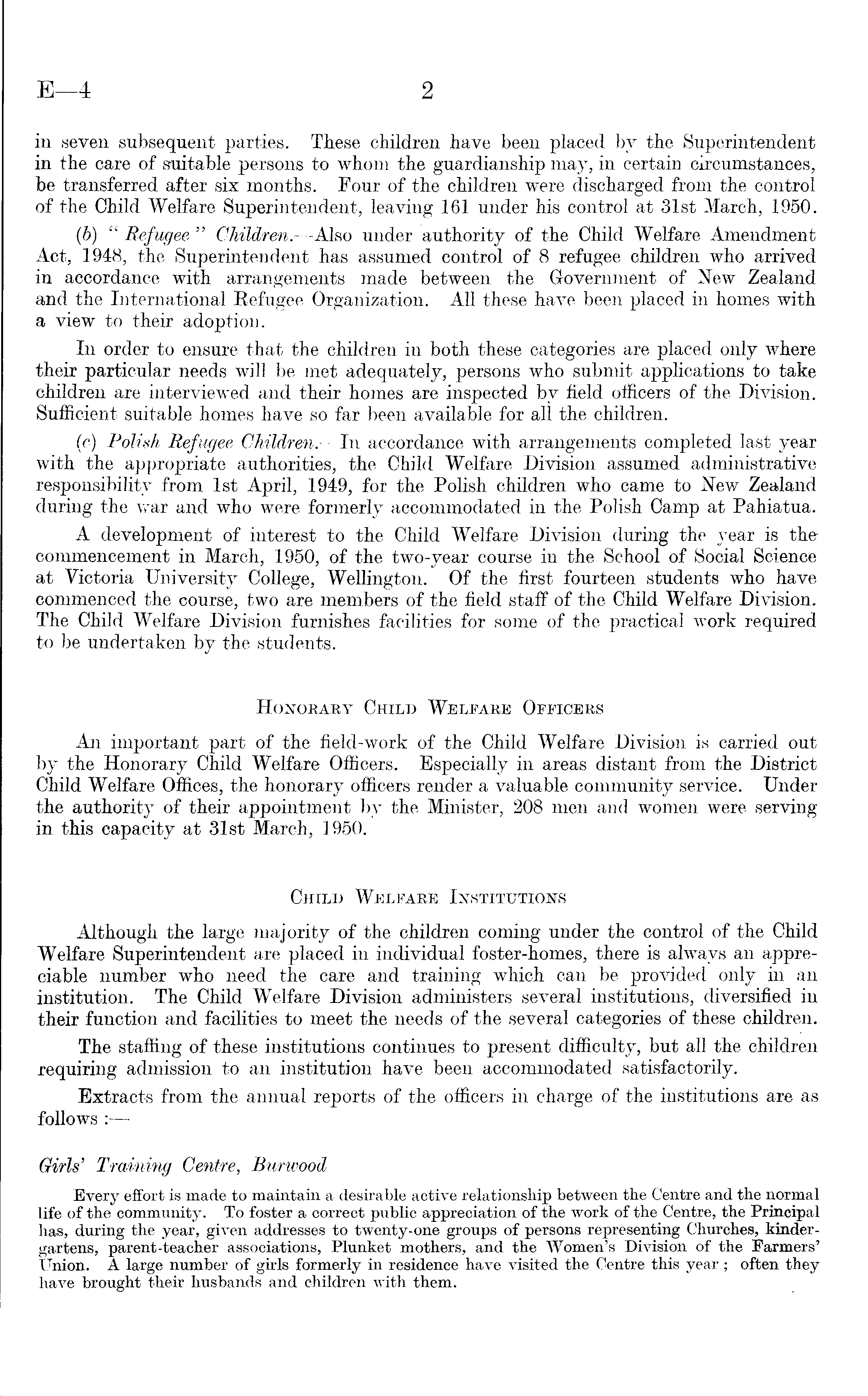 in seven subsequent parties. These children have been placed by the Superintendent in the care of suitable persons to whom the guardianship may, in certain circumstances, be transferred after six months. Pour of the children were discharged from the control of the Child Welfare Superintendent, leaving 161 under his control at 31st March, 1950. (b) " Refugee " Children. —Also under authority of the Child Welfare Amendment Act, 1948, the Superintendent has assumed control of 8 refugee children who arrived in accordance with arrangements made between the Government of New Zealand and the International Refugee Organization. All these have been placed in homes with a view to their adoption. In order to ensure that the children in both these categories are placed only where their particular needs will be met adequately, persons who submit applications to take children are interviewed and their homes are inspected by field officers of the Division. Sufficient suitable homes have so far been available for all the children. (c) Polish Refugee Children. —In accordance with arrangements completed last year with the appropriate authorities, the Child Welfare Division assumed administrative responsibility from Ist April, 1949, for the Polish children who came to New Zealand during the war and who were formerly accommodated in the Polish Camp at Pahiatua. A development of interest to the Child Welfare Division during the year is the commencement in March, 1950, of the two-year course in the School of Social Science at Victoria University College, Wellington. Of the first fourteen students who have commenced the course, two are members of the field staff of the Child Welfare Division. The Child Welfare Division furnishes facilities for some of the practical work required to be undertaken by the students. Honorary Child Welfare Officers An important part of the field-work of the Child Welfare Division is carried out by the Honorary Child Welfare Officers. Especially in areas distant from the District Child Welfare Offices, the honorary officers render a valuable community service. Under the authority of their appointment by the Minister, 208 men and women were serving in this capacity at 31st March, 1950. Child Welfare Institutions Although the large majority of the children coming under the control of the Child Welfare Superintendent are placed in individual foster-homes, there is always an appreciable number who need the care and training which can be provided only in an institution. The Child W T elfare Division administers several institutions, diversified in their function and facilities to meet the needs of the several categories of these children. The staffing of these institutions continues to present difficulty, but all the children requiring admission to an institution have been accommodated satisfactorily. Extracts from the annual reports of the officers in charge of the institutions are as follows : Girls' Training Centre, Burwood Every effort is made to maintain a desirable active relationship between the Centre and the normal life of the community. To foster a correct public appreciation of the work of the Centre, the Principal has, during the year, given addresses to twenty-one groups of persons representing Churches, kindergartens, parent-teacher associations, Plunket mothers, and the Women's Division of the Farmers' Union. A large number of girls formerly in residence have visited the Centre this year; often they have brought their husbands and children with them.