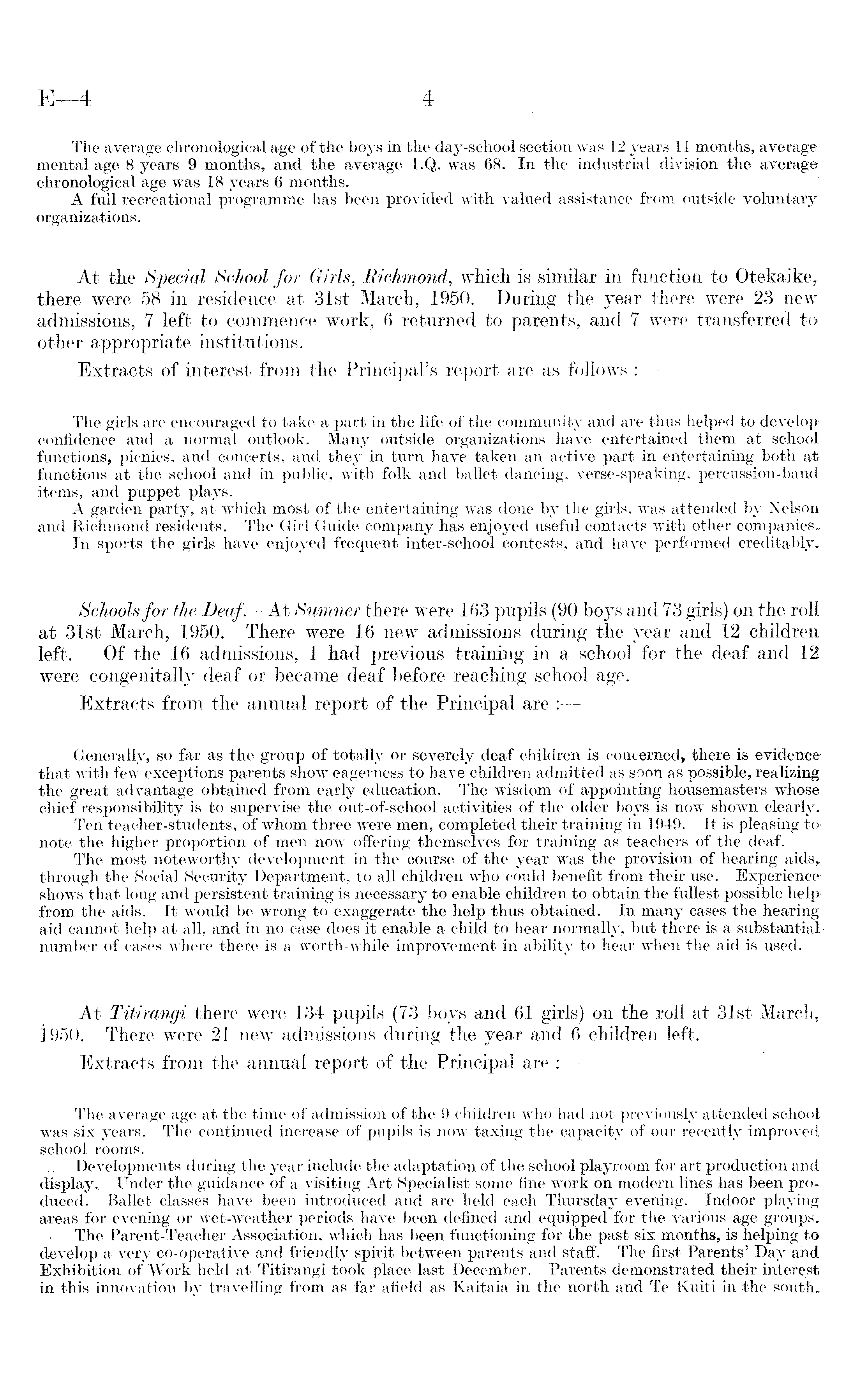 The average chronological age of the boys in the day-school section was 12 years 11 months, average mental age 8 years 9 months, and the average I.Q. was 68. In the industrial division the average chronological age was 18 years 6 months. A full recreational programme, lias been provided with valued assistance from outside voluntary organizations. At the Special School for Girls, Richmond, which is similar in function to Otekaike T there were 58 in residence at 31st March, 1950. During the year there were 23 new admissions, 7 left to commence work, 6 returned to parents, and 7 were transferred to other appropriate institutions. Extracts of interest from the Principal's report are as follows :- - The girls are encouraged to take a part in the life of the community and are thus helped to develop confidence and a normal outlook. Many outside organizations have entertained them at school functions, picnics, and concerts, and they in turn have taken an active part in entertaining both at functions at the school and in public, with folk and ballet dancing, verse-speaking, percussion-band items, and puppet plays. A garden party, at which most of the entertaining was done by the girls, was attended by Nelson and Richmond residents. The Girl Guide company has enjoyed useful contacts with other companies. In sports the girls have enjoyed frequent inter-school contests, and have performed creditably. Schools for the Deaf.—At Sumner there were 163 pupils (90 boys and 73 girls) on the roll at 31st March, 1950. There were 16 new admissions during the year and 12 children left. Of the 16 admissions, 1 had previous training in a school for the deaf and 12 were congenitally deaf or became deaf before reaching school age. Extracts from the annual report of the Principal are : Generally, so far as the group of totally or severely deaf children is concerned, there is evidence that with few exceptions parents show eagerness to have children admitted as soon as possible, realizing the great advantage obtained from early education. The wisdom of appointing housemasters whose chief responsibility is to supervise the out-of-school activities of the older boys is now shown clearly. Ten teacher-students, of whom three were men, completed their training in 1949. It is pleasing to note the higher proportion of men now offering themselves for training as teachers of the deaf. The most noteworthy development in the course of the year was the provision of hearing aids,, through the Social Security Department, to all children who could benefit from their iise. Experience shows that long and persistent training is necessary to enable children to obtain the fullest possible help from the aids. It would be wrong to exaggerate the help thus obtained. In many cases the hearing aid cannot help at all, and in no case does it enable a child to hear normally, but there is a substantial number of cases where there is a worth-while improvement in ability to hear when the aid is used. At Titirangi there were 134 pupils (73 boys and 61 girls) on the roll at 31st March,, 1950. There were 21 new admissions during the year and 6 children left. Extracts from the annual report of the Principal are : The average age at the time of admission of the 9 children who had not previously attended school was six years. The continued increase of pupils is now taxing the capacity of our recently improved school rooms. ~ Developments during the year include the adaptation of the school playroom for art production and display. Under the guidance of a visiting Art Specialist some fine work on modern lines has been produced. Ballet classes have been introduced and are held each Thursday evening. Indoor playing areas for evening or wet-weather periods have been defined and equipped for the various age groups. The Parent-Teacher Association, which has been functioning for the past six months, is helping to develop a very co-operative and friendly spirit between parents and staff. The first Parents' Day and Exhibition of Work held at Titirangi took place last December. Parents demonstrated their interest in this innovation by travelling from as far afield as Kaitaia in the north and Te Kuiti in the south.