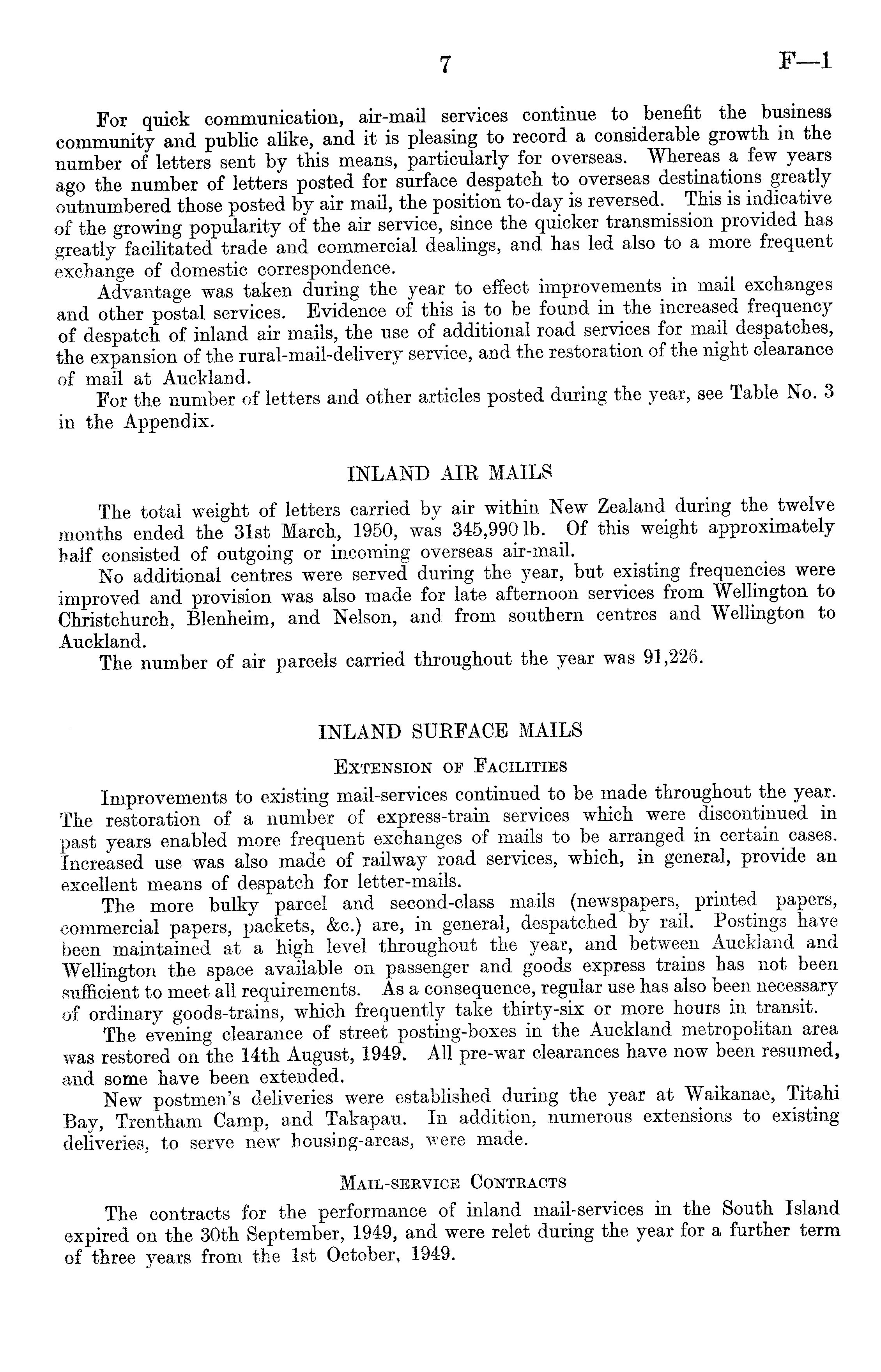 For quick communication, air-mail services continue to benefit the business community and public alike, and it is pleasing to record a considerable growth in the number of letters sent by this means, particularly for overseas. Whereas a few years ago the number of letters posted for surface despatch to overseas destinations greatly outnumbered those posted by air mail, the position to-day is reversed. This is indicative of the growing popularity of the air service, since the quicker transmission provided has greatly facilitated trade and commercial dealings, and has led also to a more frequent exchange of domestic correspondence. Advantage was taken during the year to effect improvements m mail exchanges and other postal services. Evidence of this is to be found in the increased frequency of despatch of inland air mails, the use of additional road services for mail despatches, the expansion of the rural-mail-delivery service, and the restoration of the night clearance of mail at Auckland. ii x T For the number of letters and other articles posted during the year, see lable No. 6 in the Appendix. INLAND AIR MAILS The total weight of letters carried by air within New Zealand during the twelve months ended the 31st March, 1950, was 345,9901b. Of this weight approximately half consisted of outgoing or incoming overseas air-mail. No additional centres were served during the year, but existing frequencies were improved and provision was also made for late afternoon services from Wellington to Christchurch, Blenheim, and Nelson, and from southern centres and Wellington to Auckland. The number of air parcels carried throughout the year was 91,226. INLAND SURFACE MAILS Extension of Facilities Improvements to existing mail-services continued to be made throughout the year. The restoration of a number of express-train services which were discontinued in past years enabled more frequent exchanges of mails to be arranged in certain cases. Increased use was also made of railway road services, which, in general, provide an excellent means of despatch for letter-mails. The more bulky parcel and second-class mails (newspapers, prmted papers, commercial papers, packets, &c.) are, in general, despatched by rail. Postings have been maintained at a high level throughout the year, and between Auckland and Wellington the space available on passenger and goods express trains has not been sufficient to meet all requirements. As a consequence, regular use has also been necessary of ordinary goods-trains, which frequently take thirty-six or more hours in transit. The evening clearance of street posting-boxes in the Auckland metropolitan area was restored on the 14th August, 1949. All pre-war clearances have now been resumed, and some have been extended. New postmen's deliveries were established during the year at Waikanae, Titahi Bay, Trentham Camp, and Takapau. In addition, numerous extensions to existing deliveries, to serve new housing-areas, were made. Mail-service Contracts The contracts for the performance of inland mail-services in the South Island expired on the 30th September, 1949, and were relet during the year for a further term of three years from the Ist October, 1949.