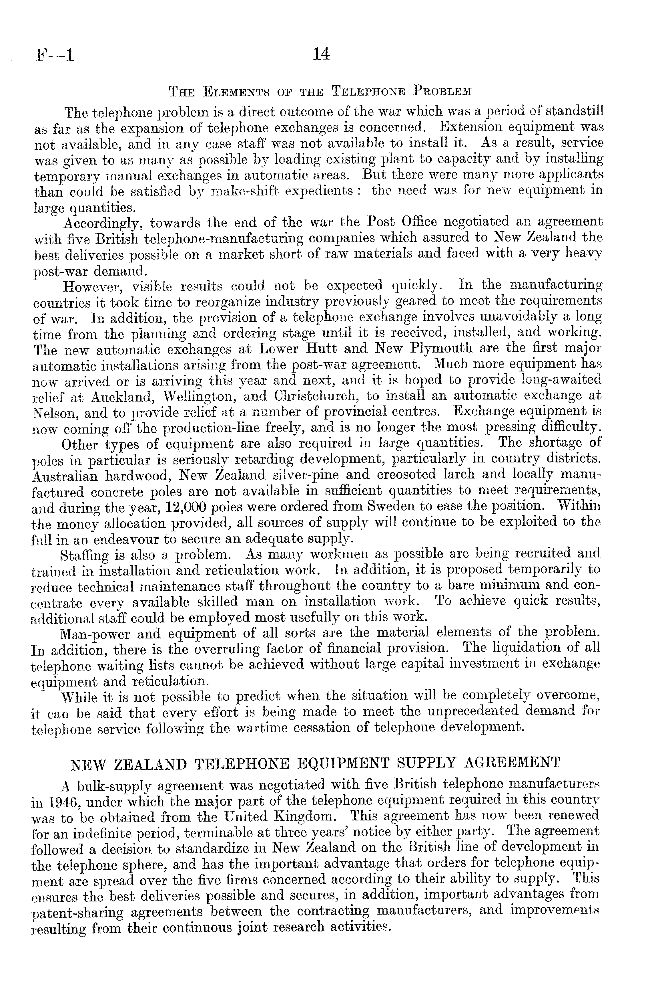 The Elements of the Telephone Problem The telephone problem is a direct outcome of the war which was a period of standstill as far as the expansion of telephone exchanges is concerned. Extension equipment was not available, and in any case staff was not available to install it. As a result, service was given to as many as possible by loading existing plant to capacity and by installing temporary manual exchanges in automatic areas. But there were many more applicants than could be satisfied by make-shift expedients : the need was for new equipment in large quantities. Accordingly, towards the end of the war the Post Office negotiated an agreement with five British telephone-manufacturing companies which assured to New Zealand the best deliveries possible on a market short of raw materials and faced with a very heavy post-war demand. However, visible results could not be expected quickly. In the manufacturing countries it took time to reorganize industry previously geared to meet the requirements of war. In addition, the provision of a telephone exchange involves unavoidably a long time from the planning and ordering stage until it is received, installed, and working. The new automatic exchanges at Lower Hutt and New Plymouth are the first major automatic installations arising from the post-war agreement. Much more equipment has now arrived or is arriving this year and next, and it is hoped to provide long-awaited relief at Auckland, Wellington, and Christchurch, to install an automatic exchange at Nelson, and to provide relief at a number of provincial centres. Exchange equipment is now coming off the production-line freely, and is no longer the most pressing difficulty. Other types of equipment are also required in large quantities. The shortage of poles in particular is seriously retarding development, particularly in country districts. Australian hardwood, New Zealand silver-pine and creosoted larch and locally manufactured concrete poles are not available in sufficient quantities to meet requirements, and during the year, 12,000 poles were ordered from Sweden to ease the position. Within the money allocation provided, all sources of supply will continue to be exploited to the full in an endeavour to secure an adequate supply. Staffing is also a problem. As many workmen as possible are being recruited and trained in installation and reticulation work. In addition, it is proposed temporarily to reduce technical maintenance staff throughout the country to a bare minimum and concentrate every available skilled man on installation work. To achieve quick results, additional staff could be employed most usefully on this work. Man-power and equipment of all sorts are the material elements of the problem. In addition, there is the overruling factor of financial provision. The liquidation of all telephone waiting lists cannot be achieved without large capital investment in exchange equipment and reticulation. While it is not possible to predict when the situation will be completely overcome, it can be said that every effort is being made to meet the unprecedented demand for telephone service following the wartime cessation of telephone development. NEW ZEALAND TELEPHONE EQUIPMENT SUPPLY AGREEMENT A bulk-supply agreement was negotiated with five British telephone manufacturers in 1946, under which the major part of the telephone equipment required in this country was to be obtained from the United Kingdom. This agreement has now been renewed for an indefinite period, terminable at three years' notice by either party. The agreement followed a decision to standardize in New Zealand on the British line of development in the telephone sphere, and has the important advantage that orders for telephone equipment are spread over the five firms concerned according to their ability to supply. This ensures the best deliveries possible and secures, in addition, important advantages from patent-sharing agreements between the contracting manufacturers, and improvements resulting from their continuous joint research activities.