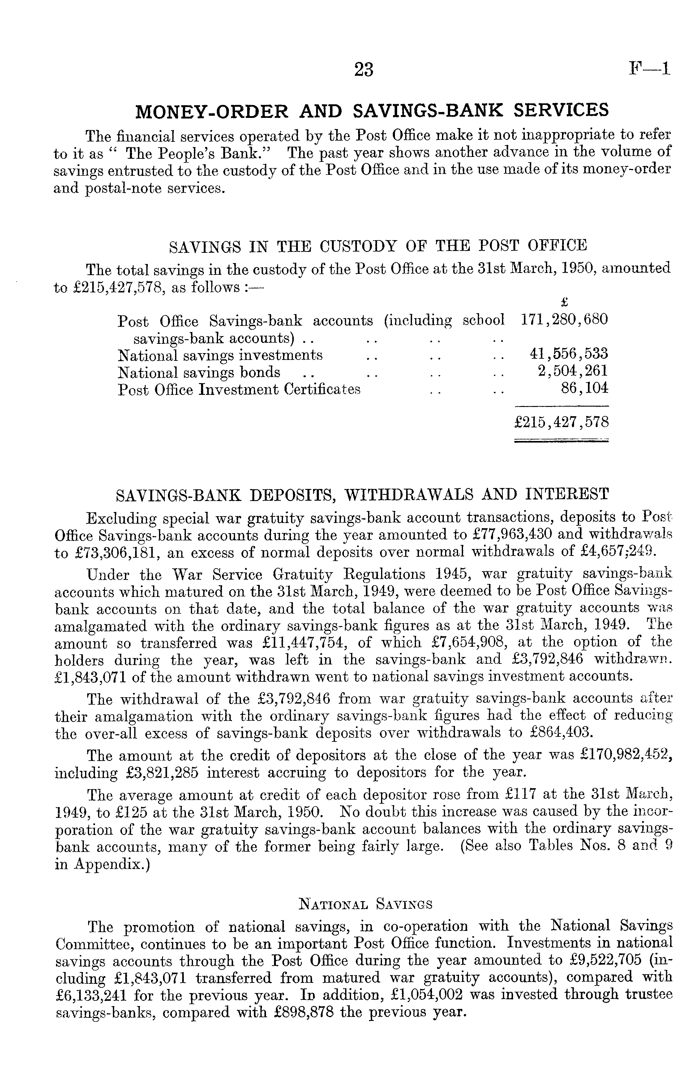 MONEY-ORDER AND SAVINGS-BANK SERVICES The financial services operated by the Post Office make it not inappropriate to refer to it as " The People's Bank." The past year shows another advance in the volume of savings entrusted to the custody of the Post Office and in the use made of its money-order and postal-note services. SAYINGS IN THE CUSTODY OF THE POST OFFICE The total savings in the custody of the Post Office at the 31st March, 1950, amounted to £215,427,578, as follows : £ Post Office Savings-bank accounts (including school 171,280,680 savings-bank accounts) National savings investments .. .. .. 41,556,533 National savings bonds .. .. .. .. 2,504,261 Post Office Investment Certificates .. .. 86,104 £215,427,578 SAVINGS-BANK DEPOSITS, WITHDRAWALS AND INTEREST Excluding special war gratuity savings-bank account transactions, deposits to Post Office Savings-bank accounts during the year amounted to £77,963,430 and withdrawals to £73,306,181, an excess of normal deposits over normal withdrawals of £4,657^249. Under the War Service Gratuity Regulations 1945, war gratuity savings-bank accounts which matured on the 31st March, 1949, were deemed to be Post Office Savingsbank accounts on that date, and the total balance of the war gratuity accounts was amalgamated with the ordinary savings-bank figures as at the 31st March, 1949. The amount so transferred was £11,447,754, of which £7,654,908, at the option of the holders during the year, was left in the savings-bank and £3,792,846 withdrawn. £1,843,071 of the amount withdrawn went to national savings investment accounts. The withdrawal of the £3,792,846 from war gratuity savings-bank accounts after their amalgamation with the ordinary savings-bank figures had the effect of reducing the over-all excess of savings-bank deposits over withdrawals to £864,403. The amount at the credit of depositors at the close of the year was £170,982,452, including £3,821,285 interest accruing to depositors for the year. The average amount at credit of each depositor rose from £ll7 at the 31st March, 1949, to £125 at the 31st March, 1950. No doubt this increase was caused by the incorporation of the war gratuity savings-bank account balances with the ordinary savingsbank accounts, many of the former being fairly large. (See also Tables Nos. 8 and 9 in Appendix.) National Savings The promotion of national savings, in co-operation with the National Savings Committee, continues to be an important Post Office function. Investments in national savings accounts through the Post Office during the year amounted to £9,522,705 (including £1,843,071 transferred from matured war gratuity accounts), compared with £6,133,241 for the previous year. Id addition, £1,054,002 was invested through trustee savings-banks, compared with £898,878 the previous year.