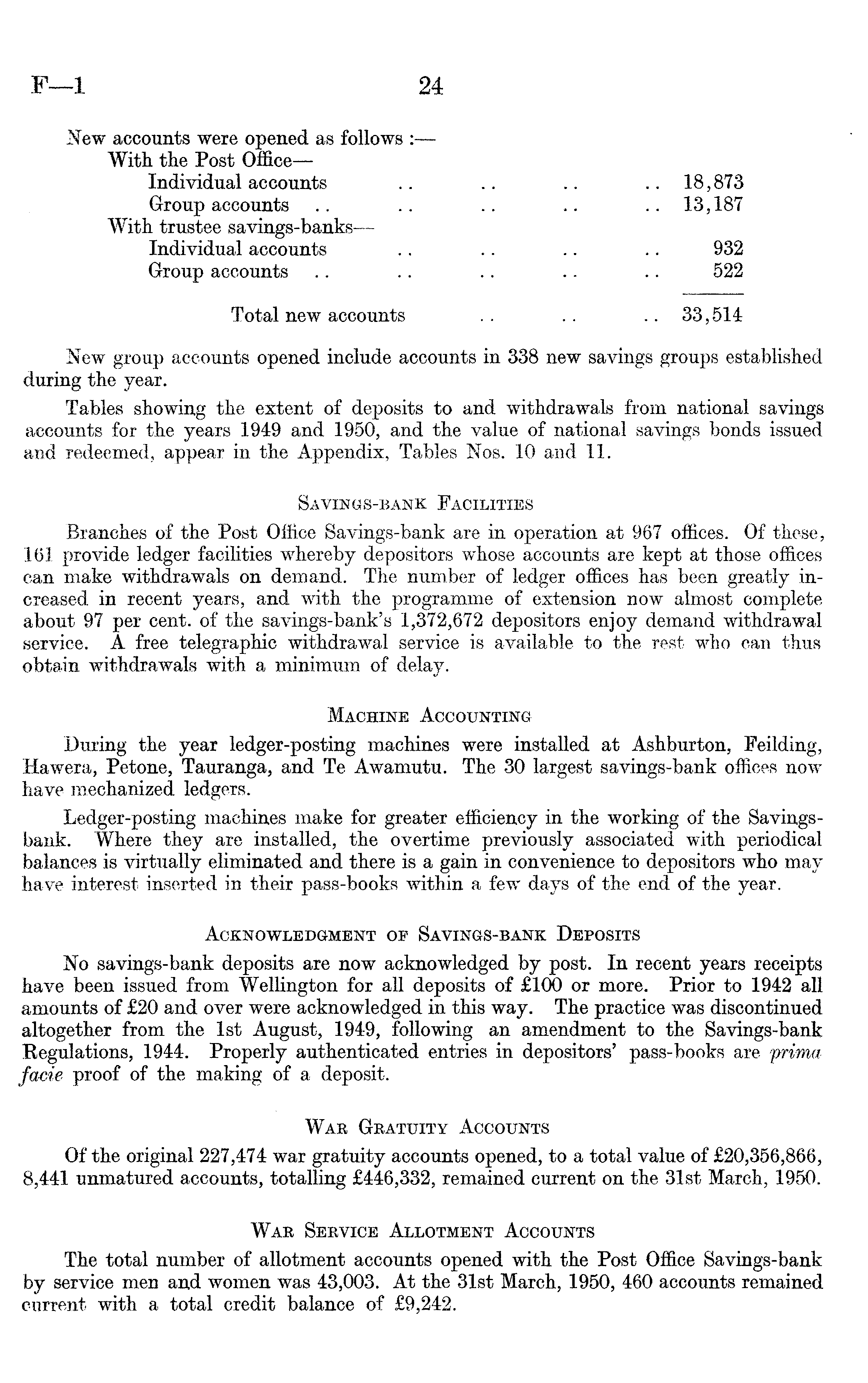 New accounts were opened as follows : With the Post Office— Individual accounts .. .. .. 18,873 Group accounts .. .. .. .. .. 13,187 With trustee savings-banks— Individual accounts .. .. .. .. 932 Group accounts .. .. .. .. .. 522 Total new accounts .. .. .. 33,514 New group accounts opened include accounts in 338 new savings groups established during the year. Tables showing the extent of deposits to and withdrawals from national savings accounts for the years 1949 and 1950, and the value of national savings bonds issued and redeemed, appear in the Appendix, Tables Nos. 10 and 11. Savings-bank Facilities Branches of the Post Office Savings-bank are in operation at 967 offices. Of these, 161 provide ledger facilities whereby depositors whose accounts are kept at those offices can make withdrawals on demand. The number of ledger offices has been greatly increased in recent years, and with the programme of extension now almost complete about 97 per cent, of the savings-bank's 1,372,672 depositors enjoy demand withdrawal service. A free telegraphic withdrawal service is available to the rest who can thus obtain withdrawals with a minimum of delay. Machine Accounting During the year ledger-posting machines were installed at Ashburton, Feilding, Hawera, Petone, Tauranga, and Te Awamutu. The 30 largest savings-bank offices now have mechanized ledgers. Ledger-posting machines make for greater efficiency in the working of the Savingsbank. Where they are installed, the overtime previously associated with periodical balances is virtually eliminated and there is a gain in convenience to depositors who may have interest inserted in their pass-books within a few days of the end of the year. Acknowledgment of Savings-bank Deposits No savings-bank deposits are now acknowledged by post. In recent years receipts have been issued from Wellington for all deposits of £lOO or more. Prior to 1942 all amounts of £2O and over were acknowledged in this way. The practice was discontinued altogether from the Ist August, 1949, following an amendment to the Savings-bank Regulations, 1944. Properly authenticated entries in depositors' pass-books are prima facie proof of the making of a deposit. War Gratuity Accounts Of the original 227,474 war gratuity accounts opened, to a total value of £20,356,866, 8,441 unmatured accounts, totalling £446,332, remained current on the 31st March, 1950. War Service Allotment Accounts The total number of allotment accounts opened with the Post Office Savings-bank by service men and women was 43,003. At the 31st March, 1950, 460 accounts remained current with a total credit balance of £9,242.