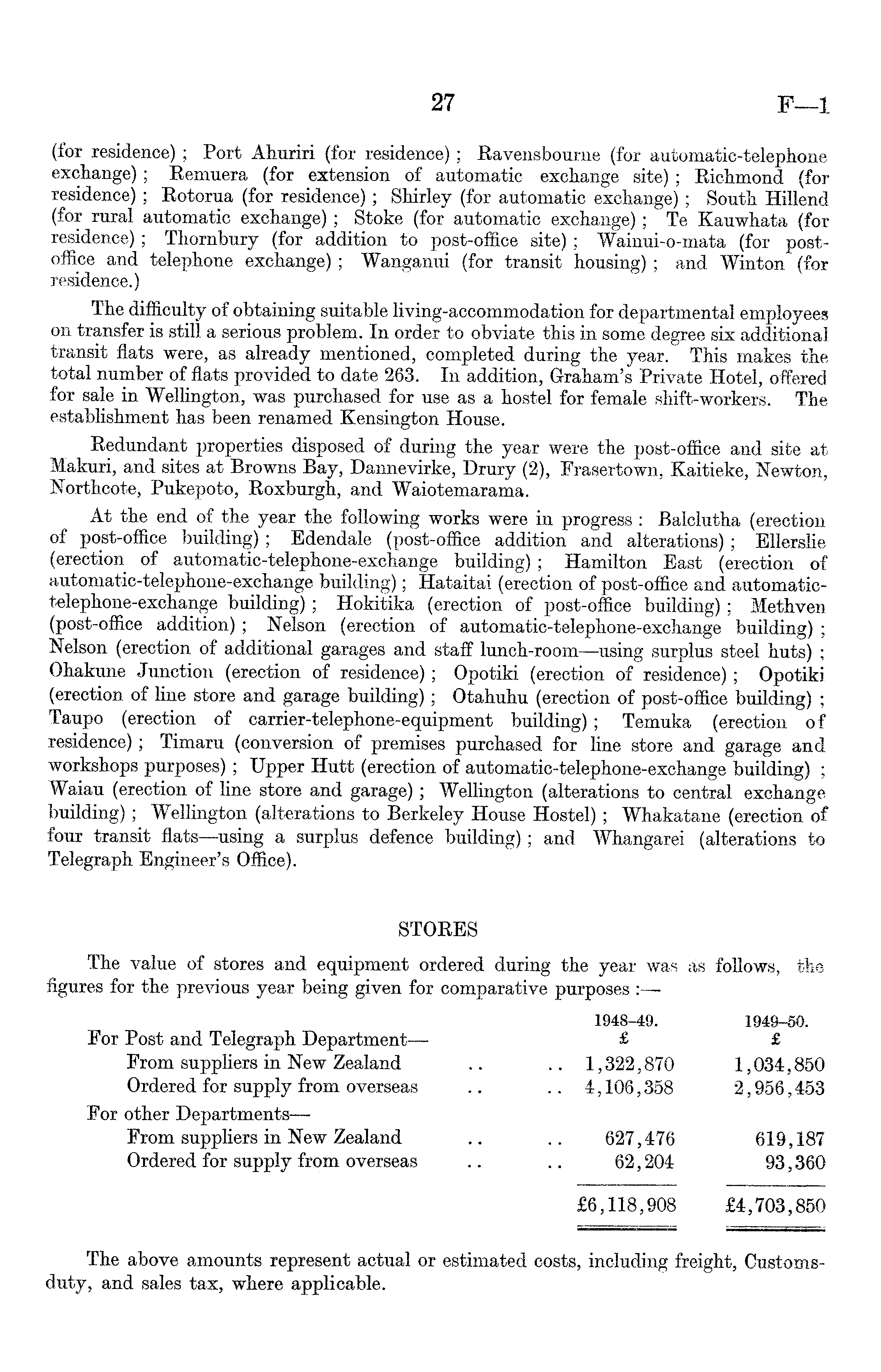 (for residence) ; Port Ahuriri (for residence); Ravensbourne (for automatic-telephone exchange) ; Remuera (for extension of automatic exchange site); Richmond (for residence) ; Rotorua (for residence); Shirley (for automatic exchange); South Hillend (for rural automatic exchange) ; Stoke (for automatic exchange) ; Te Kauwhata (for residence) ; Thornbury (for addition to post-office site) ; Wainui-o-mata (for postoffice and telephone exchange); Wanganui (for transit housing) ; and Winton (for residence.) The difficulty of obtaining suitable living-accommodation for departmental employees on transfer is still a serious problem. In order to obviate this in some degree six additional transit flats were, as already mentioned, completed during the year. This makes the total number of flats provided to date 263. In addition, Graham's Private Hotel, offered for sale in Wellington, was purchased for use as a hostel for female shift-workers. The establishment has been renamed Kensington House. Redundant properties disposed of during the year were the post-office and site at Makuri, and sites at Browns Bay, Dannevirke, Drury (2), Frasertown, Kaitieke, Newton, Northcote, Pukepoto, Roxburgh, and Waiotemarama. At the end of the year the following works were in progress : Balclutha (erection of post-office building); Bdendale (post-office addition and alterations); Ellerslie (erection of automatic-telephone-exchange building) ; Hamilton East (erection of automatic-telephone-exchange building); Hataitai (erection of post-office and automatic-telephone-exchange building); Hokitika (erection of post-office building); Methven (post-office addition) ; Nelson (erection of automatic-telephone-exchange building) ; Nelson (erection of additional garages and staff lunch-room—using surplus steel huts) ; Ohakune Junction (erection of residence); Opotiki (erection of residence); Opotiki (erection of line store and garage building) ; Otahuhu (erection of post-office building) ; Taupo (erection of carrier-telephone-equipment building); Temuka (erection of residence); Timaru (conversion of premises purchased for line store and garage and workshops purposes); Upper Hutt (erection of automatic-telephone-exchange building) ; Waiau (erection of line store and garage); Wellington (alterations to central exchange building); Wellington (alterations to Berkeley House Hostel); Whakatane (erection of four transit flats—using a surplus defence building); and Whangarei (alterations to Telegraph Engineer's Office). STORES The value of stores and equipment ordered during the year was as follows, the figures for the previous year being given for comparative purposes 1948-49. 1949-50. For Post and Telegraph Department— £ £ From suppliers in New Zealand .. .. 1,322,870 1,034,850 Ordered for supply from overseas .. .. 4,106,358 2,956,453 For other Departments— From suppliers in New Zealand .. .. 627,476 619,187 Ordered for supply from overseas .. .. 62,204 93,360 £6,118,908 £4,703,850 The above amounts represent actual or estimated costs, including freight, Customsduty, and sales tax, where applicable.
