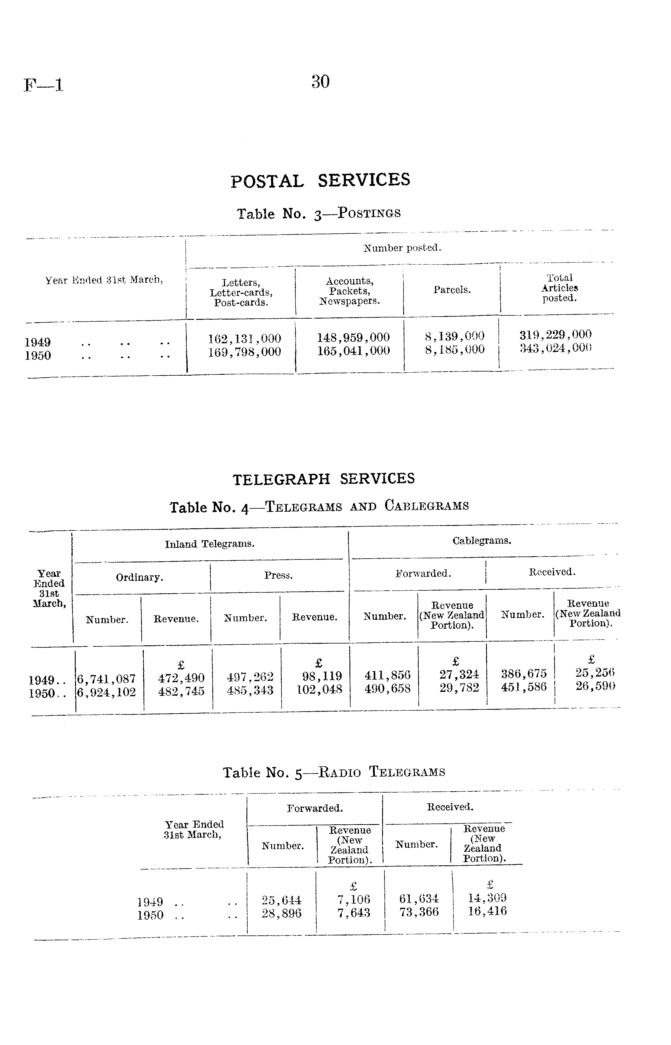 Year Ended 31st March, Inland Telegrams. Cablegrams. Ordinary. Press. Forwarded. Received. Number. Revenue. Number. Revenue. Number. Revenue (New Zealand Portion). Number. Revenue j(New Zealand Portion). 1949.. 1950.. 6,741,087 6,924,102 £ 472,490 482,745 497,262 485,343 £ 98,119 102,048 411,856 490,658 £ 27,324 29,782 1 386,675 451,586 £ | 25,256 | 26,590