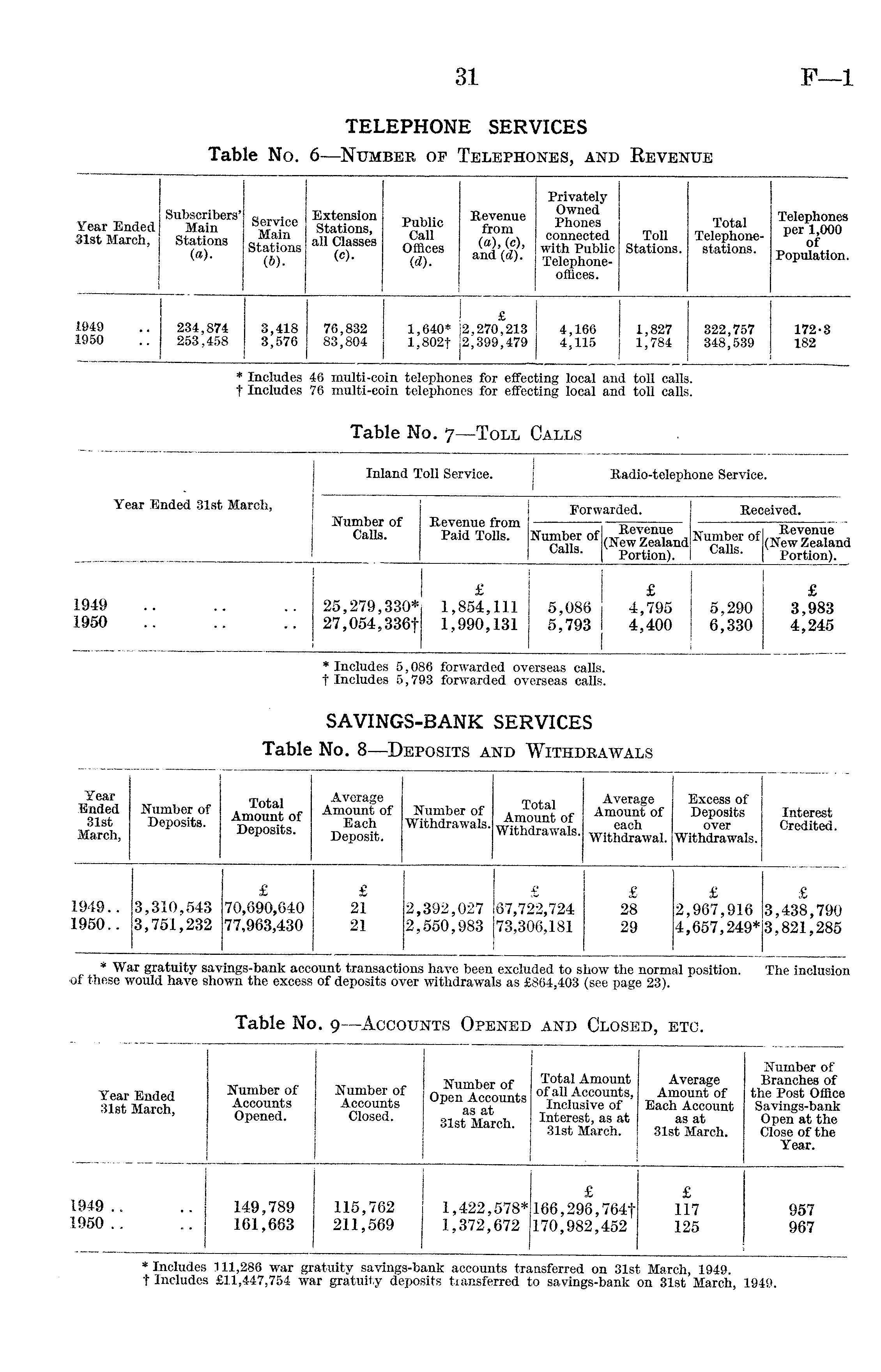 Year Ended 31st March, Inland Toll Service. Radio-telephone Service. Number of Calls. Revenue from Paid Tolls. Forwarded. Received. Number of Calls. Revenue (New Zealand Portion). Number of Calls. Revenue (New Zealand Portion). 1949 1950 f 25,279,330* 27,054,336f £ 1,854,111 1,990,131 5,086 5,793 £ 4,795 I 4,400 5,290 6,330 £ 3,983 4,245 * Includes 5,086 forwarded overseas calls, t Includes 5,793 forwarded overseas calls.