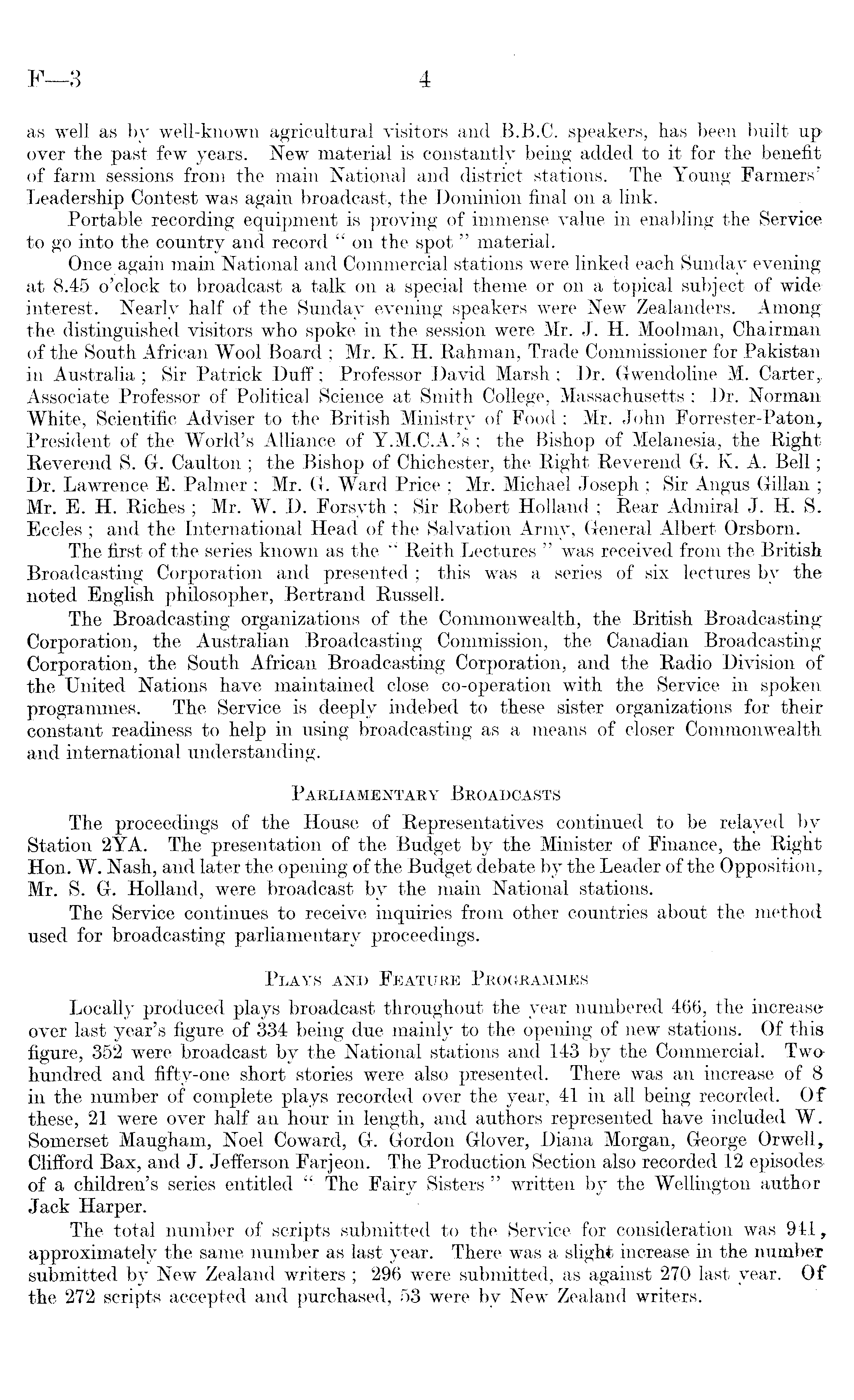 as well as by well-known agricultural visitors and 8.8.C. speakers, has been built up over the past few years. New material is constantly being added to it for the benefit of farm sessions from the main National and district stations. The Young Farmers' Leadership Contest was again broadcast, the Dominion final on a link. Portable recording equipment is proving of immense value in enabling the Service to go into the country and record " on the spot " material. Once again main National and Commercial stations were linked each Sunday evening at 8.45 o'clock to broadcast a talk on a special theme or on a topical subject of wide interest. Nearly half of the Sunday evening speakers were New Zealanders. Among the distinguished visitors who spoke in the session were Mr. J. H. Moolman, Chairman of the South African Wool Board ; Mr. K. H. Rahman, Trade Commissioner for Pakistan in Australia ; Sir Patrick Duff; Professor David Marsh ; Dr. Gwendoline M. Carter r Associate Professor of Political Science at Smith College, Massachusetts ; Dr. Norman White, Scientific Adviser to the British Ministry of Food ; Mr. John Forrester-Paton, President of the World's Alliance of Y.M.C.A.'s ; the Bishop of Melanesia, the Right Reverend S. G. Caulton ; the Bishop of Chichester, the Right Reverend G. K. A. Bell; Dr. Lawrence E. Palmer ; Mr. G. Ward Price ; Mr. Michael Joseph ; Sir Angus Gillan ; Mr. E. H. Riches ; Mr. W. D. Forsyth ; Sir Robert Holland ; Rear Admiral J. H. S. Eccles ; and the International Head of the Salvation Army, General Albert Orsborn. The first of the series known as the " Reith Lectures " was received from the British Broadcasting Corporation and presented ; this was a series of six lectures by the noted English philosopher, Bertrand Russell. The Broadcasting organizations of the Commonwealth, the British Broadcasting Corporation, the Australian Broadcasting Commission, the Canadian Broadcasting Corporation, the South African Broadcasting Corporation, and the Radio Division of the United Nations have maintained close co-operation with the Service in spoken programmes. The Service is deeply indebed to these sister organizations for their constant readiness to help in using broadcasting as a means of closer Commonwealth and international understanding. Parliamentary Broadcasts The proceedings of the House of Representatives continued to be relayed by Station 2YA. The presentation of the Budget by the Minister of Finance, the Right Hon. W. Nash, and later the opening of the Budget debate by the Leader of the Opposition,, Mr. S. G. Holland, were broadcast by the main National stations. The Service continues to receive inquiries from other countries about the method used for broadcasting parliamentary proceedings. Plays and Feature Programmes Locally produced plays broadcast throughout the year numbered 466, the increase over last year's figure of 334 being due mainly to the opening of new stations. Of this figure, 352 were broadcast by the National stations and 143 by the Commercial. Twohundred and fifty-one short stories were also presented. There was an increase of 8 in the number of complete plays recorded over the year, 41 in all being recorded. Of these, 21 were over half an hour in length, and authors represented have included W. Somerset Maugham, Noel Coward, G. Gordon Glover, Diana Morgan, George Orwell, Clifford Bax, and J. Jefferson Farjeon. The Production Section also recorded 12 episodes of a children's series entitled " The Fairy Sisters " written by the Wellington author Jack Harper. The total number of scripts submitted to the Service for consideration was 941, approximately the same number as last year. There was a slight increase in the number submitted by New Zealand waiters ; 296 were submitted, as against 270 last year. Of the 272 scripts accepted and purchased, 53 were by New Zealand writers.