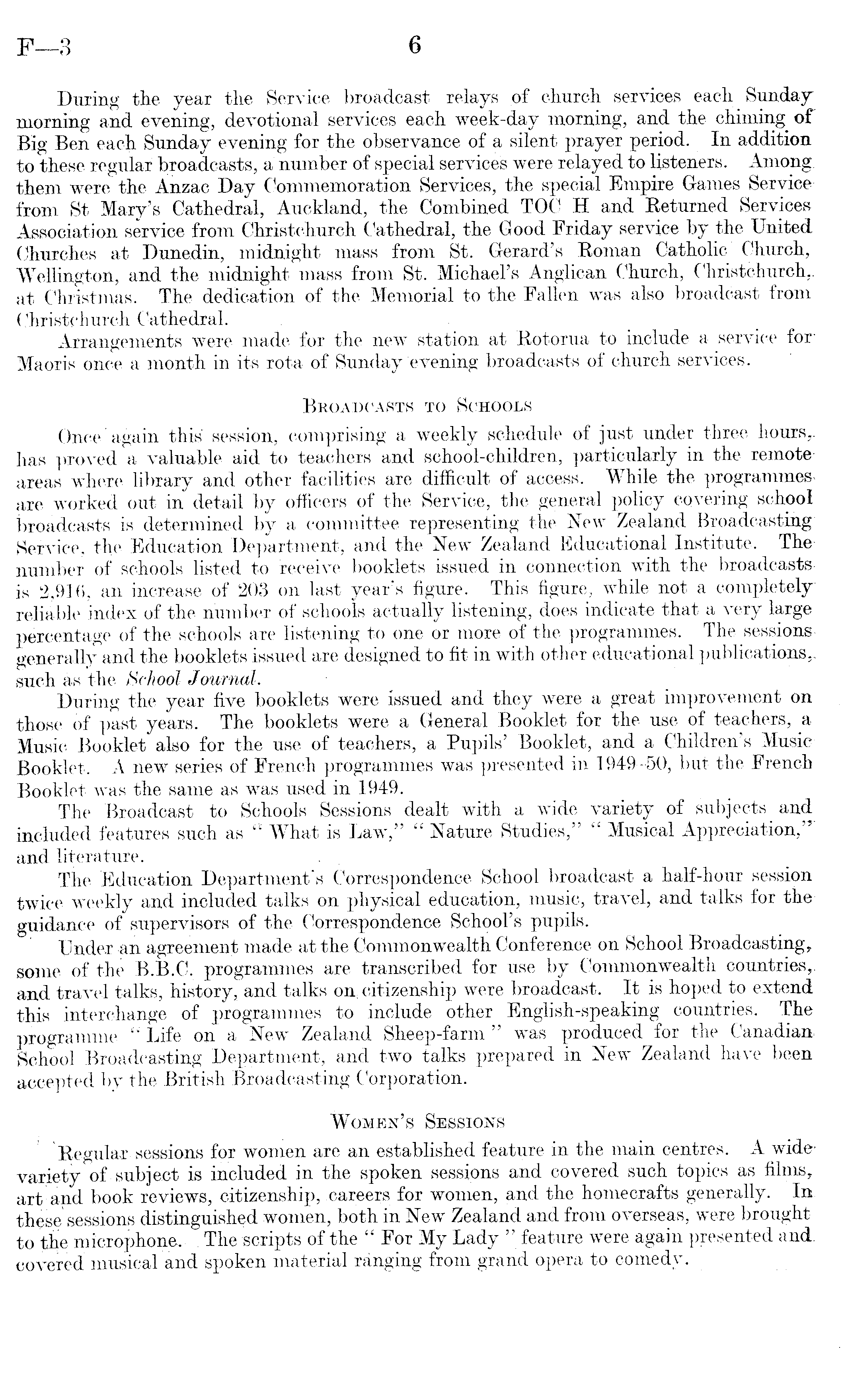 During the year the Service broadcast relays of church, services each Sunday morning and evening, devotional services each week-day morning, and the chiming of Big Ben each Sunday evening for the observance of a silent prayer period. In addition to these regular broadcasts, a number of special services were relayed to listeners. Among; them were the Anzac Day Commemoration Services, the special Empire Games Service from St Mary's Cathedral, Auckland, the Combined TOC H and Returned Services Association service from Christchurch Cathedral, the Good Friday service by the United Churches at Dune.din, midnight mass from St. Gerard's Roman Catholic Church, Wellington, and the midnight mass from St. Michael's Anglican Church, Christchurch,. at Christmas. The dedication of the Memorial to the Fallen was also broadcast from Christchurch Cathedral. Arrangements were made for the new station at Rotorua to include a service for Maoris once a month in its rota of Sunday evening broadcasts of church services. Broadcasts to Schools Once again this session, comprising a weekly schedule of just under three hours,, has proved a valuable aid to teachers and school-children, particularly in the remoteareas where library and other facilities are difficult of access. While the programmesare worked out in detail by officers of the Service, the general policy covering school broadcasts is determined by a committee representing the New Zealand Broadcasting: Service, the Education Department, and the New Zealand Educational Institute. The number of schools listed to receive booklets issued in connection with the broadcastsis 2,916, an increase of 203 on last year's figure. This figure, while not a completelyreliable index of the number of schools actually listening, does indicate that a very large percentage of the schools are listening to one or more of the programmes. The sessions generally and the booklets issued are designed to fit in with other educational publications,, such as the School Journal. During the year five booklets were issued and they were a great improvement on those of past years. The booklets were a General Booklet for the use of teachers, a Music Booklet also for the use of teachers, a Pupils' Booklet, and a Children's Music Booklet. A new series of French programmes was presented in 1949-50, but the French Booklet was the same as was used in 1949. The Broadcast to . Schools Sessions dealt with a wide variety of subjects and included features such as" What is Law," " Nature Studies," " Musical Appreciation,"" and literature. The Education Department's Correspondence School broadcast a half-hour session twice weekly and included talks on physical education, music, travel, and talks for the guidance of supervisors of the Correspondence School's pupils. Under an agreement made at the Commonwealth Conference on School Broadcasting, some of the 8.8.C. programmes are transcribed for use by Commonwealth countries,, and travel talks, history, and talks on, citizenship were broadcast. It is hoped to extend this interchange of programmes to include other English-speaking countries. The programme. " Life on a New Zealand Sheep-farm " was produced for the Canadian. School Broadcasting Department, and two talks prepared in New Zealand have been accepted by the British Broadcasting Corporation. Women's Sessions Regular-sessions for women are an established feature in the main centres. A widevariety of subject is included in the spoken sessions and covered such topics as films, art and book reviews, citizenship, .careers for women, and the homecrafts generally. In these sessions distinguished women, both in New Zealand and from overseas, were brought to the microphone.. The scripts of the ". For My Lady " feature were again presented and. covered musical and spoken material ranging from grand opera to comedy.