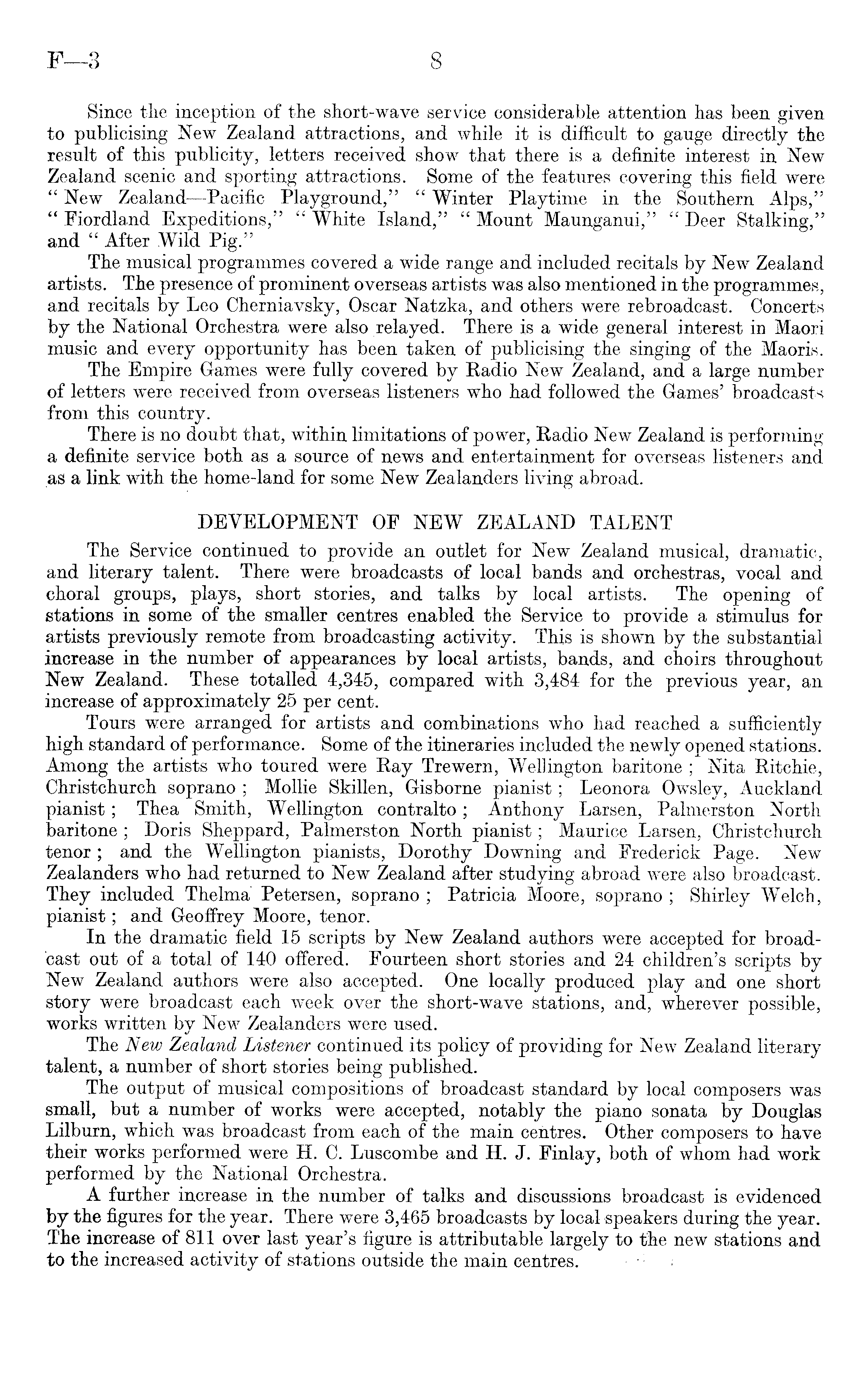 Since the inception of the short-wave service considerable attention has been given to publicising New Zealand attractions, and while it is difficult to gauge directly the result of this publicity, letters received show that there is a definite interest in New Zealand scenic and sporting attractions. Some of the features covering this field were " New Zealand —Pacific Playground," " Winter Playtime in the Southern Alps," " Fiordland Expeditions," " White Island," " Mount Maunganui," " Deer Stalking," and " After Wild Pig." The musical programmes covered a wide range and included recitals by New Zealand artists. The presence of prominent overseas artists was also mentioned in the programmes, and recitals by Leo Cherniavsky, Oscar Natzka, and others were rebroadcast. Concerts by the National Orchestra were also .relayed. There is a wide general interest in Maori music and every opportunity has been taken of publicising the singing of the Maoris. The Empire Games were fully covered by Radio New Zealand, and a large number of letters were received from overseas listeners who had followed the Games' broadcasts from this country. There is no doubt that, within limitations of power, Radio New Zealand is performing a definite service both as a source of news and entertainment for overseas listeners and as a link with the home-land for some New Zealanders living abroad. DEVELOPMENT OF NEW ZEALAND TALENT The Service continued to provide an outlet for New Zealand musical, dramatic, and literary talent. There were broadcasts of local bands and orchestras, vocal and choral groups, plays, short stories, and talks by local artists. The opening of stations in some of the smaller centres enabled the Service to provide a stimulus for artists previously remote from broadcasting activity. This is shown by the substantial increase in the number of appearances by local artists, bands, and choirs throughout New Zealand. These totalled 4,345, compared with 3,484 for the previous year, an increase of approximately 25 per cent. Tours were arranged for artists and combinations who had reached a sufficiently high standard of performance. Some of the itineraries included the newly opened stations. Among the artists who toured were Ray Trewern, Wellington baritone ; Nita Ritchie, Christchurch soprano ; Mollie Skillen, Gisborne pianist; Leonora Owsley, Auckland pianist; Thea Smith, Wellington contralto; Anthony Larsen, Palmerston North baritone ; Doris Sheppard, Palmerston North pianist; Maurice Larsen, Christchurch tenor ; and the Wellington pianists, Dorothy Downing and Frederick Page. New Zealanders who had returned to New Zealand after studying abroad were also broadcast. They included Thelma' Petersen, soprano ; Patricia Moore, soprano ; Shirley Welch, pianist; and Geoffrey Moore, tenor. In the dramatic field 15 scripts by New Zealand authors were accepted for broadcast out of a total of 140 offered. Fourteen short stories and 24 children's scripts by New Zealand authors were also accepted. One locally produced play and one short story were broadcast each week over the short-wave stations, and, wherever possible, works written by New Zealanders were used. The New Zealand Listener continued its policy of providing for New Zealand literary talent, a number of short stories being published. The output of musical compositions of broadcast standard by local composers was small, but a number of works were accepted, notably the piano sonata by Douglas Lilburn, which was broadcast from each of the main centres. Other composers to have their works performed were H. C. Luscombe and H. J. Finlay, both of whom had work performed by the National Orchestra. A further increase in the number of talks and discussions broadcast is evidenced by the figures for the year. There were 3,465 broadcasts by local speakers during the year. The increase of 811 over last year's figure is attributable largely to the new stations and to the increased activity of stations outside the main centres. • -
