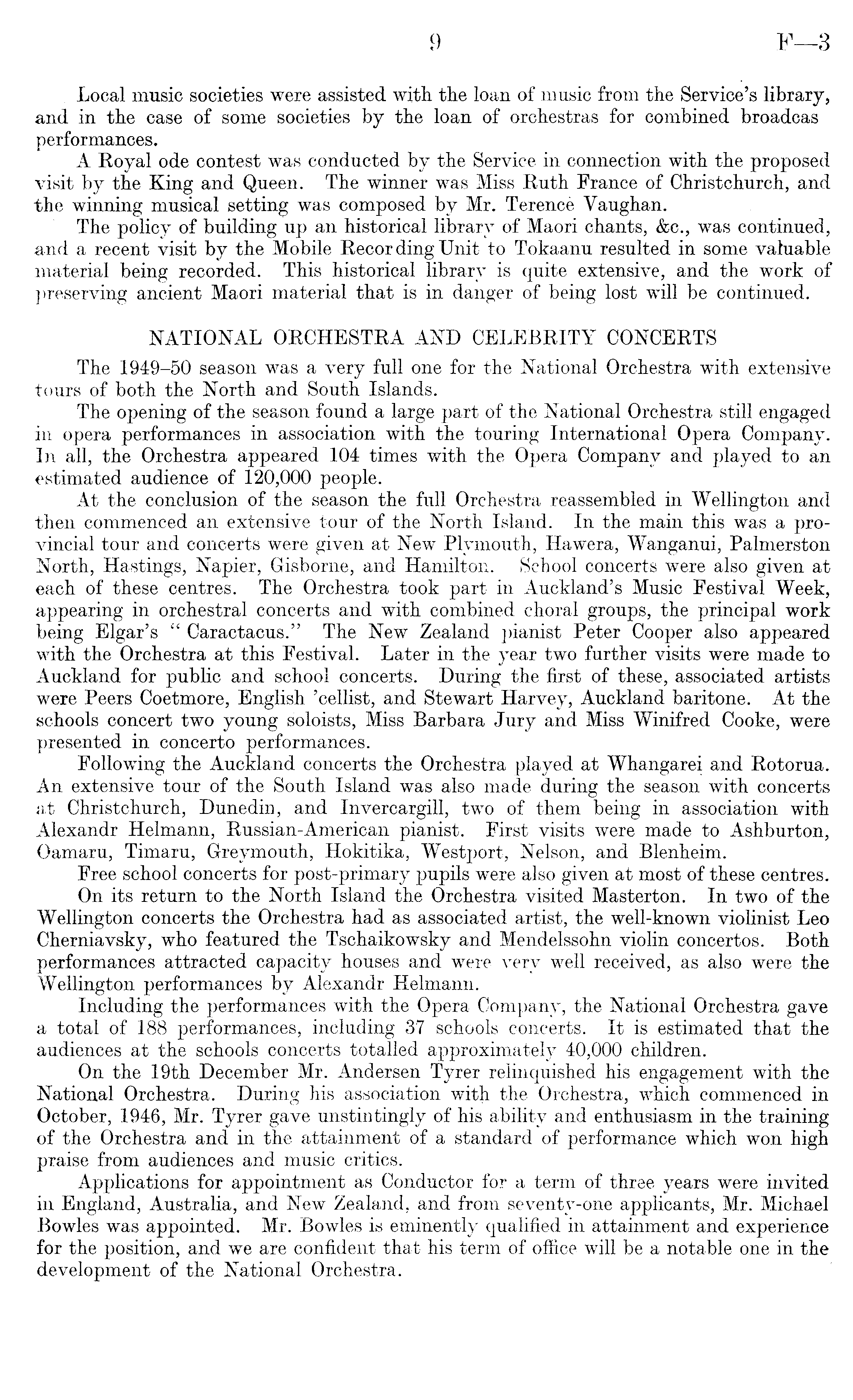 Local music societies were assisted with the loan of music from the Service's library, and in the case of some societies by the loan of orchestras for combined broadcas performances. A Royal ode contest was conducted by the Service in connection with the proposed visit by the King and Queen. The winner was Miss Ruth France of Christchurch, and the winning musical setting was composed by Mr. Terence Vaughan. The policy of building up an historical library of Maori chants, &c., was continued, and a recent visit by the Mobile Recor ding Unit to Tokaanu resulted in some valuable material being recorded. This historical library is quite extensive, and the work of preserving ancient Maori material that is in danger of being lost will be continued. NATIONAL ORCHESTRA AND CELEBRITY CONCERTS The 1949-50 season was a very full one for the National Orchestra with extensive tours of both the North and South Islands. The opening of the season found a large part of the National Orchestra still engaged in opera performances in association with the touring International Opera Company. In all, the Orchestra appeared 104 times with the Opera Company and played to an estimated audience of 120,000 people. At the conclusion of the season the full Orchestra reassembled in Wellington and then commenced an extensive tour of the North Island. In the main this was a provincial tour and concerts were given at New Plymouth, Hawera, Wanganui, Palmerston North, Hastings, Napier, Gisborne, and Hamilton. School concerts were also given at each of these centres. The Orchestra took part in Auckland's Music Festival Week, appearing in orchestral concerts and with combined choral groups, the principal work being Elgar's " Caractacus." The New Zealand pianist Peter Cooper also appeared with the Orchestra at this Festival. Later in the year two further visits were made to Auckland for public and school concerts. During the first of these, associated artists were Peers Coetmore, English 'cellist, and Stewart Harvey, Auckland baritone. At the schools concert two young soloists, Miss Barbara Jury and Miss Winifred Cooke, were presented in concerto performances. Following the Auckland concerts the Orchestra played at Whangarei and Rotorua. An extensive tour of the South Island was also made during the season with concerts at Christchurch, Dunedin, and Invercargill, two of them being in association with Alexandr Helmann, Russian-American pianist. First visits were made to Ashburton, Oamaru, Timaru, Greymouth, Hokitika, Westport, Nelson, and Blenheim. Free school concerts for post-primary pupils were also given at most of these centres. On its return to the North Island the Orchestra visited Masterton. In two of the Wellington concerts the Orchestra had as associated artist, the well-known violinist Leo Cherniavsky, who featured the Tschaikowsky and Mendelssohn violin concertos. Both performances attracted capacity houses and were very well received, as also were the Wellington performances by Alexandr Helmann. Including the performances with the Opera Company, the National Orchestra gave a total of 188 performances, including 37 schools concerts. It is estimated that the audiences at the schools concerts totalled approximately 40,000 children. On the 19th December Mr. Andersen Tyrer relinquished his engagement with the National Orchestra. During his association with the Orchestra, which commenced in October, 1946, Mr. Tyrer gave unstintingly of his ability and enthusiasm in the training of the Orchestra and in the attainment of a standard of performance which won high praise from audiences and music critics. Applications for appointment as Conductor for a term of three years were invited in England, Australia, and New Zealand, and from seventy-one applicants, Mr. Michael Bowles was appointed. Mr. Bowles is eminently qualified in attainment and experience for the position, and we are confident that his term of office will be a notable one in the development of the National Orchestra.