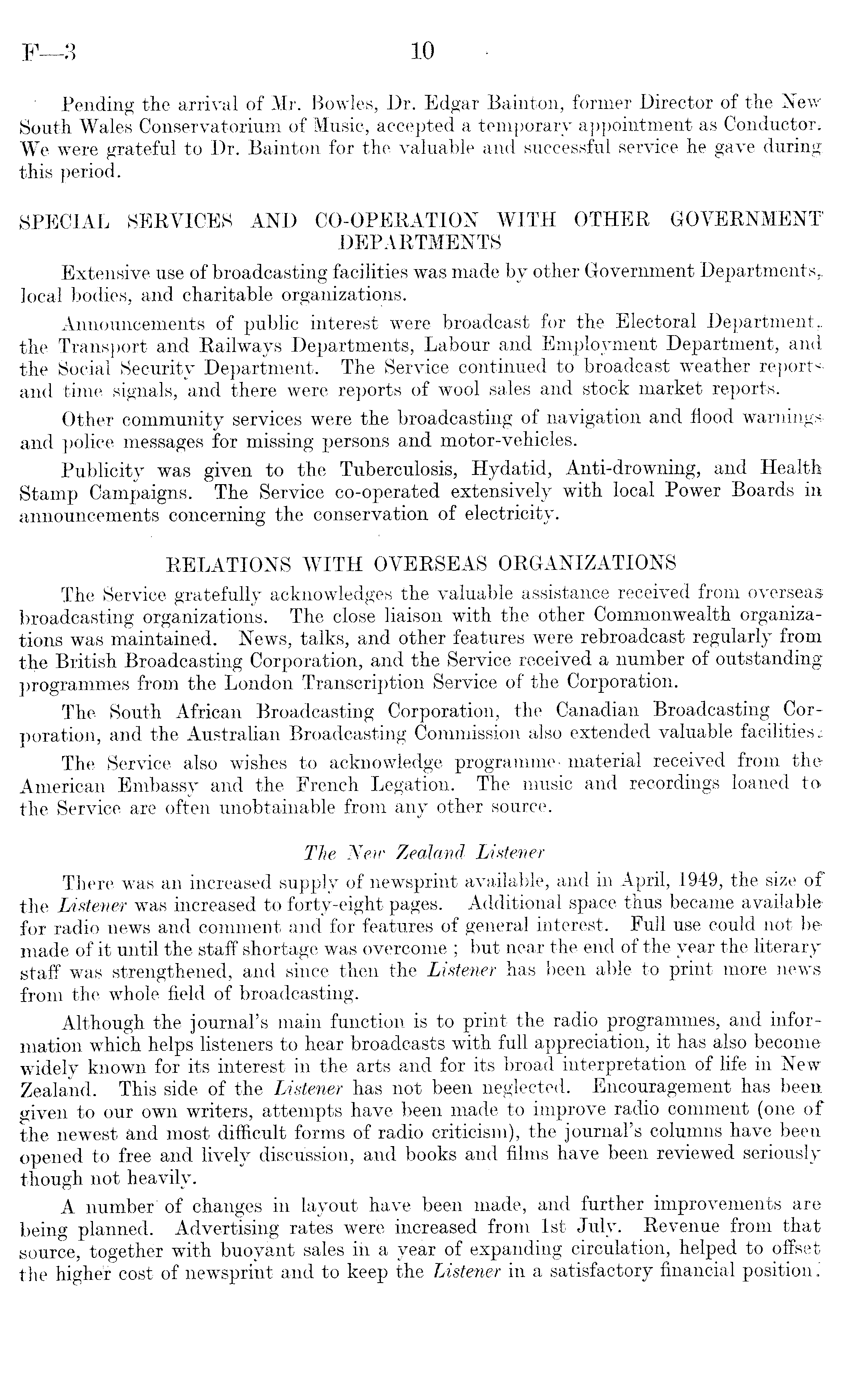 Pending the arrival of Mr. Bowles, Dr. Edgar Bainton, former Director of the New South Wales Conservatorium of Music, accepted a temporary appointment as Conductor; We were grateful to Dr. Bainton for the valuable and successful service he gave during, this period. SPECIAL SERVICES AND CO-OPERATION WITH OTHER GOVERNMENT' DEPARTMENTS Extensive use of broadcasting facilities was made by other Government Departments,, local bodies, and charitable organizations. Announcements of public interest were broadcast for the Electoral Department,, the Transport and Railways Departments, Labour and Employment Department, and the Social Security Department. The Service continued to broadcast weather reportsand time signals, and there were reports of wool sales and stock market reports. Other community services were the broadcasting of navigation and flood warnings, and police messages for missing persons and motor-vehicles. Publicity was given to the Tuberculosis, Hydatid, Anti-drowning, and Health Stamp Campaigns. The Service co-operated extensively with local Power Boards in announcements concerning the conservation of electricity. RELATIONS WITH OVERSEAS ORGANIZATIONS The Service gratefully acknowledges the valuable assistance received from overseas broadcasting organizations. The close liaison with the other Commonwealth organizations was maintained. News, talks, and other features were rebroadcast regularly from the British Broadcasting Corporation, and the Service received a number of outstanding programmes from the London Transcription Service of the Corporation, The South African Broadcasting Corporation, the Canadian Broadcasting Corporation, and the Australian Broadcasting Commission also extended valuable facilities; The Service also wishes to acknowledge programme- material received from the American Embassy and the French Legation. The music and recordings loaned to the Service are often unobtainable from any other source. The New Zealand Listener There was an increased supply of newsprint available, and in April, 1949, the size of the Listener was increased to forty-eight pages. Additional space thus became available for radio news and comment and for features of general interest. Full use could not be made of it until the staff shortage was overcome ; but near the end of the year the literary staff was strengthened, and since then the Listener has been able to print more news from the whole field of broadcasting. Although the journal's main function is to print the radio programmes, and information which helps listeners to hear broadcasts with full appreciation, it has also become widely known for its interest in the arts and for its broad interpretation of life in New Zealand. This side of the Listener has not been neglected. Encouragement has been given to our own writers, attempts have been made to improve radio comment (one of the newest and most difficult forms of radio criticism), the journal's columns have been opened to free and lively discussion, and books and films have been reviewed seriously though not heavily. A number of changes in layout have been made, and further improvements are being planned. Advertising rates were increased from Ist July. Revenue from that source, together with buoyant sales in a year of expanding circulation, helped to offset the higher cost of newsprint and to keep the Listener in a satisfactory financial position.