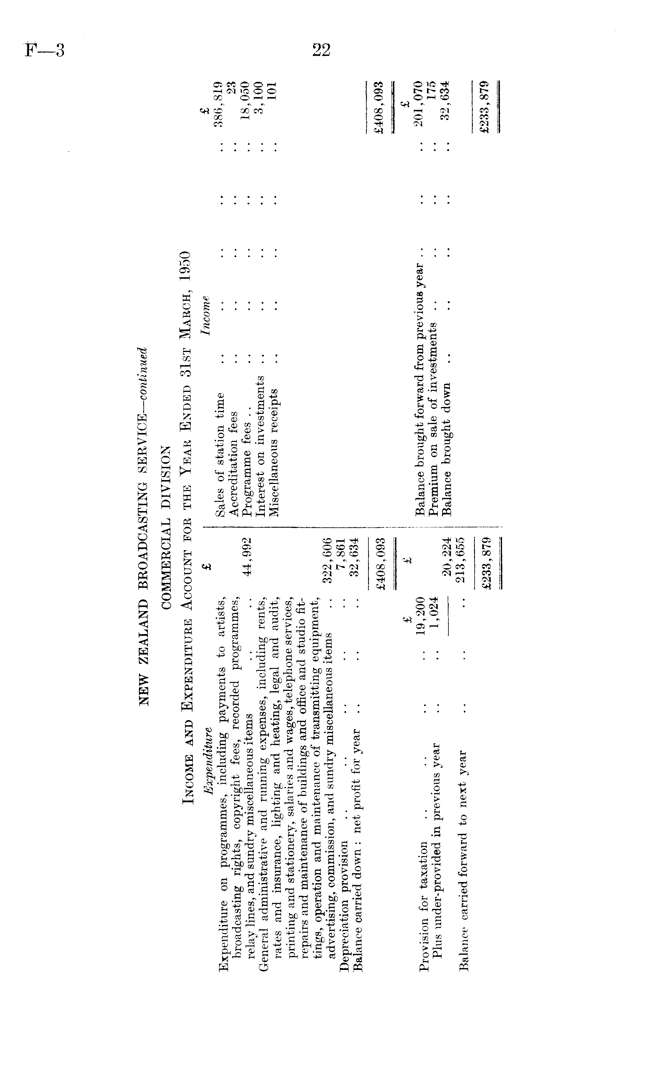 NEW ZEALAND BROADCASTING SERVICE— continued COMMERCIAL DIVISION Income and Expenditure Account for the Year Ended 31st March, 1950 Expenditure £ Income £ Expenditure on programmes, including payments to artists, Sales of station time .. .. .. .. .. 386,819 broadcasting rights, copyright fees, recorded programmes, Accreditation fees .. .. .. .. .. 23 relay lines, and sundry miscellaneous items .. .. 44,992 Programme fees .. .. .. .. •• .. 18,050 General administrative and running expenses, including rents, Interest on investments .. .. .. .. .. 3,100 rates and insurance, lighting and heating, legal and audit, Miscellaneous receipts .. .. .. .. .. 101 printing and stationery, salaries and wages, telephone services, repairs and maintenance of buildings and office and studio fittings, operation and maintenance of transmitting equipment, advertising, commission, and sundry miscellaneous items . . 322, 606 Depreciation provision .. .. • • • • • • 7,861 Balance carried down : net profit for year .. .. . • 32,634 £408,093 £408,093 £ £ £ Provision for taxation .. .. .. ..19,200 Balance brought forward from previous year .. .. .. 201,070 Plus under-provided in previous year .. .. 1,024 Premium on sale of investments .. .. .. .. 175 20,224 Balance brought down .. .. .. .. .. 32,634 Balance carried forward to next year .. .. •• 213,655 £233,879 £233,879