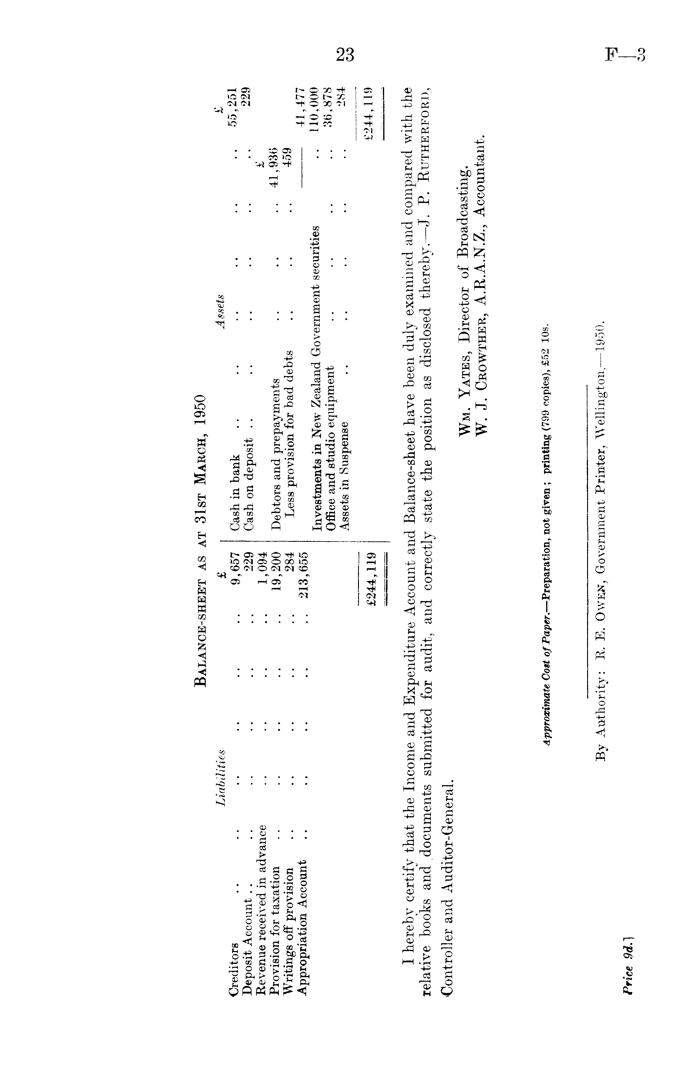 Balance-sheet as at 31st March, 1950 Liabilities £ Assets £ Creditors .. .. .. .. .. .. 9,657 Cash in bank .. .. .. •• •• •• 55,251 Deposit Account .. .. .. .. .. .. 229 Cash on deposit .. .. .. • • • • • • 229 Revenue received in advance .. .. .. .. 1,094 £ Provision for taxation .. .. .. .. .. 19,200 Debtors and prepayments .. .. •• 41,936 Writings off provision .. .. .. .. .. 284 Less provision for bad debts .. .. .. 459 Appropriation Account .. .. .. .. .. 213,655 41,477 Investments in New Zealand Government securities .. 110, 000 Office and studio equipment .. .. .. •• 36,878 Assets in Suspense .. .. . • • • • • 284 , 119 I hereby certify that the Income and Expenditure Account and Balance-sheet have been duly examined and compared with the relative books and documents submitted for audit, and correctly state the position as disclosed thereby.— J. P. Rutherford, Controller and Auditor-General. Wm. Yates, Director of Broadcasting. W. J. Crowther, A.R.A.N.Z., Accountant.