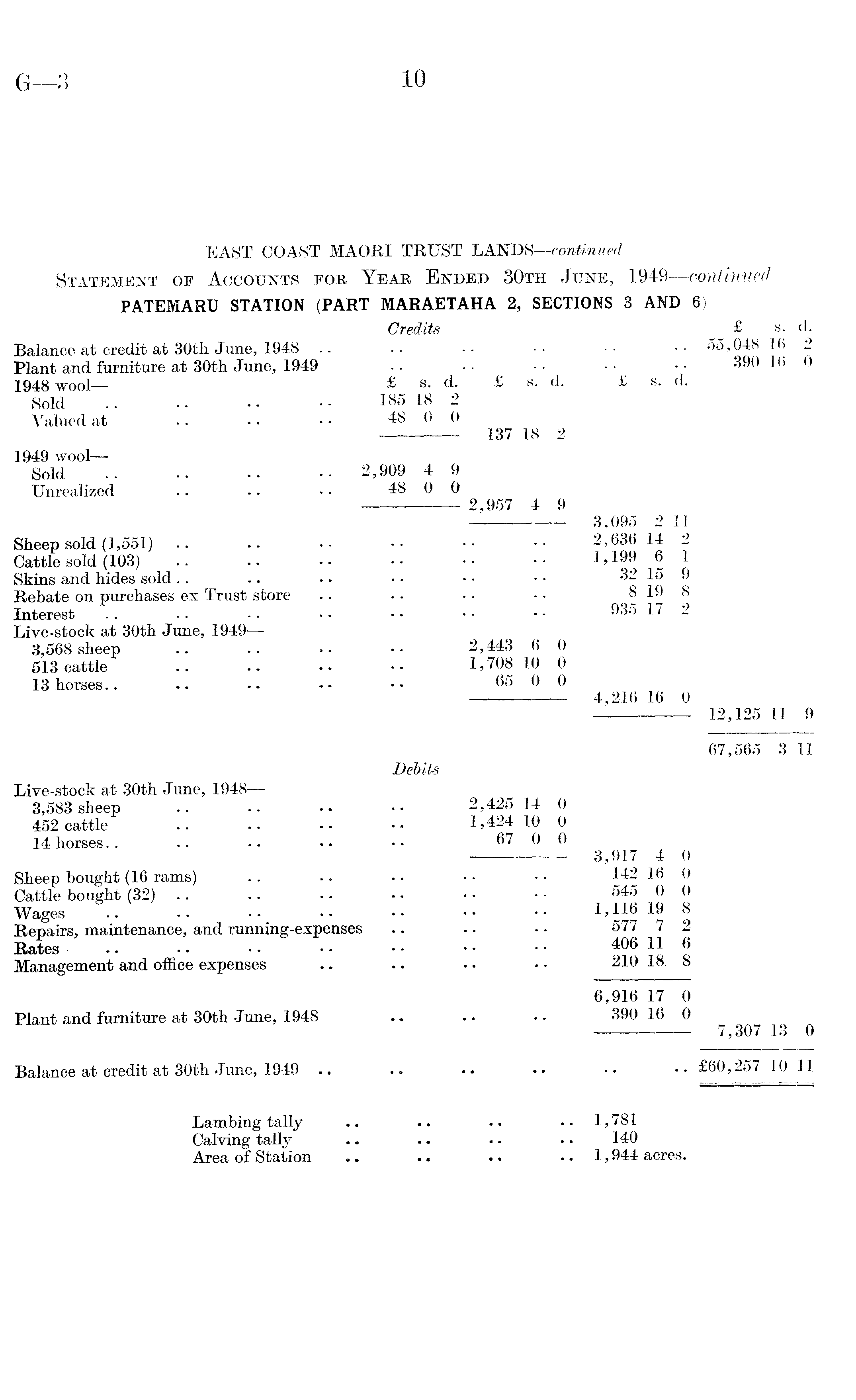 EAST COAST MAORI TRUST LANDS —continued Statement of Accounts for Year Ended 30th June, 1949—continued PATEMARU STATION (PART MARAETAHA 2, SECTIONS 3 AND 6) Credits £ s. d. Balance at credit at 30th June, 1948 .. .. -- •• •• 55,048 16 2 Plant and furniture at 30th June, 1949 .. • • • - 390 16 0 1948 wool— £ s. d. £ s. d. £ s. d. Sold 185 18 2 Valued at .. . • • • 48 0 0 137 18 2 1949 wool — Sold 2,909 4 9 Unrealized .. .. • • 48 0 0 2,957 4 9 3,095 2 11 Sheep sold (1,551) .. .. •• •• •• •• 2,636 14 2 Cattle sold (103) , 6 r ! Skins and hides sold.. .. .. - - • • • • 3w 15 9 Rebate on purchases ex Trust store .. •• • - •• 8198 Interest .. •• •• •• •• •• 935 17 2 Live-stock at 30th June, 1949 3,568 sheep .. .. •• 2,443 6 0 513 cattle 1,708 10 0 13 horses.. .. .. •• •• 65 0 0 4,216 16 0 12,125 11 9 67,565 3 11 Debits Live-stock at 30th June, 1948 — 3,583 sheep .. .. .. 2,425 14 0 452 cattle .. ... -• 1,424 10 0 14 horses.. .. • • • • • • 67 0 0 3,917 4 0 Sheep bought (16 rams) .. .. . • • • • • 142 16 0 Cattle bought (32) 2 Wages .. -• •• •• •• •• 1,116 19 8 Repairs, maintenance, and running-expenses .. .. • • 577 7 2 Rates 406 11 6 Management and office expenses .. .. .. • • 210 18 8 6,916 17 0 Plant and furniture at 30th June, 1948 .. .. .. 390 16 0 7,307 13 0 Balance at credit at 30th June, 1949 .. .. .. •• •• •• £60,257 10 11 Lambing tally .. .. .. .. 1,781 Calving tally .. .. .. • • 140 Area of Station .. •. .. .. 1,944 acres.