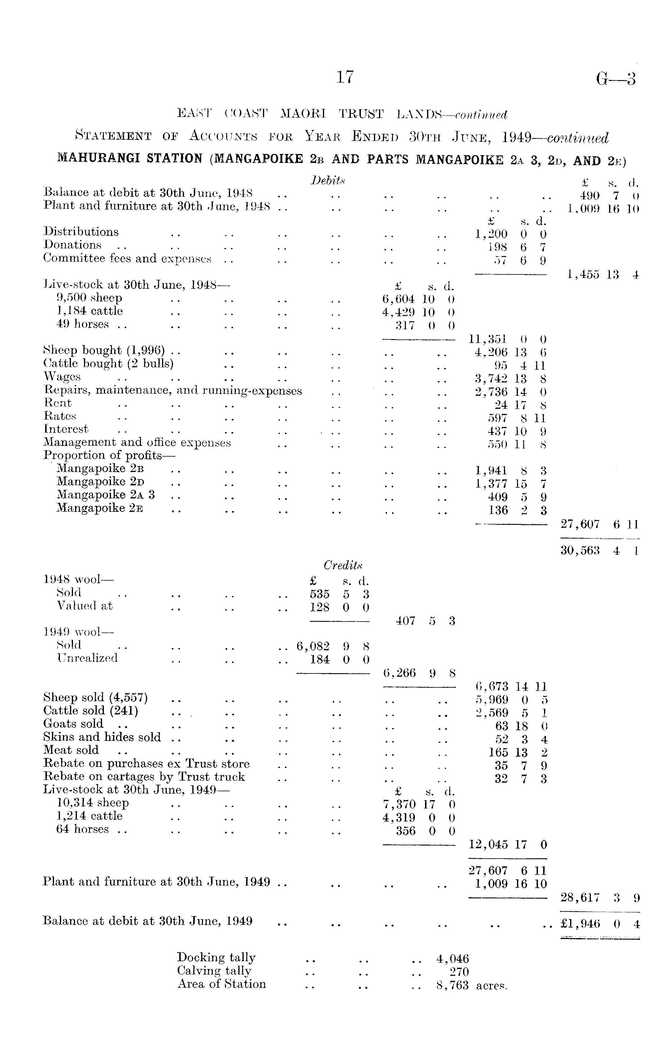 EAST COAST MAORI TRUST LANDS —continued Statement op Accounts for Year Ended 30th June, 1949 —continued MAHURANGI STATION (MANGAPOIKE 2B AND PARTS MANGAPOIKE 2a 3, 2D, AND 2B) Debits ' £ s. d. Balance at debit at 30th June, 1948 .. .. .. .. .. .. 490 7 0 Plant and furniture at 30th June, 1948 .. .. .. .. .. .. 1,009 16 10 £ s. d. Distributions 4 .. .. .. .. * .. 1,200 0 0 Donations .. .. .. .. .. .. .. 198 6 7 Committee fees and expenses .. .. .. .. .. 57 6 "9 2 455 13 4 Live-stock at 30th June, 1948 £ s. d. 9,500 sheep .. .. .. .. 6,604 10 0 1,184 cattle .. .. .. .. 4,429 10 0 49 horses .. .. .. .. .. 317 0 0 11,351 0 0 Sheep bought (1,996) .. ~ .. .. .. .. 4,206 13 6 Cattle bought (2 bulls) .. .. .. .. .. 95 4 11 Wages .. .. .. .. .. .. .. 3,742 13 8 Repairs, maintenance, and running-expenses .. .. .. 2,736 14 0 Rent .. .. .. .. .. .. .. ' 24 17 8 Rates .. .. .. .. .. .. .. 597 8 11 Interest .. .. .. .. .. 437 10 9 Management and office expenses .. .. .. .. 550 11 8 Proportion of profits— Mangapoike 2b .. .. .. .. .. .. 1 } 941 8 3 Mangapoike 2b .. .. .. .. .. .. 1,377 15 7 Mangapoike 2a 3 .. .. .. .. .. .. 409 5 9 Mangapoike 2b .. .. .. .. .. .. 136 2 3 27,607 6 11 30,563 4 1 Credits 1948 wool — £ s . d. Sold .. .. .. .. 535 5 3 Valued at .. .. .. 128 0 0 407 5 3 1949 wool— Sold .. .. .. .. 6,082 9 8 Unrealized .. .. .. 184 0 0 6,266 9 8 6,673 14 11 Sheep sold (4,557) .. .. .. .. .. .. 5,969 0 5 Cattle sold (241) ... .. .. .. .. .. 2,569 5 1 Goats sold .. .. .. .. .. .. .. 63 18 0 Skins and hides sold .. .. .. .. .. .. 52 3 4 Meat sold .. .. .. .. .. .. . . 165 13 2 Rebate on purchases ex Trust store .. . . .. . . 35 7 9 Rebate on cartages by Trust truck .. .. .. .. 32 7 3 Live-stock at 30th June, 1949 — £ s. d. 10,314 sheep .. .. .. .. 7,370 17 0 1,214 cattle .. .. .. .. 4,319 0 0 64 horses .. .. .. .. .. 356 0 0 12,045 17 0 27,607 6 11 Plant and furniture at 30th June, 1949 .. .. .. .. 1,009 16 10 28,617 3 9 Balance at debit at 30th June, 1949 .. .. .. .. .. .. £1 946 0 4 Docking tally .. .. .. 4,046 Calving tally .. .. .. 270 Area of Station .. .. .. 8,763 acres.