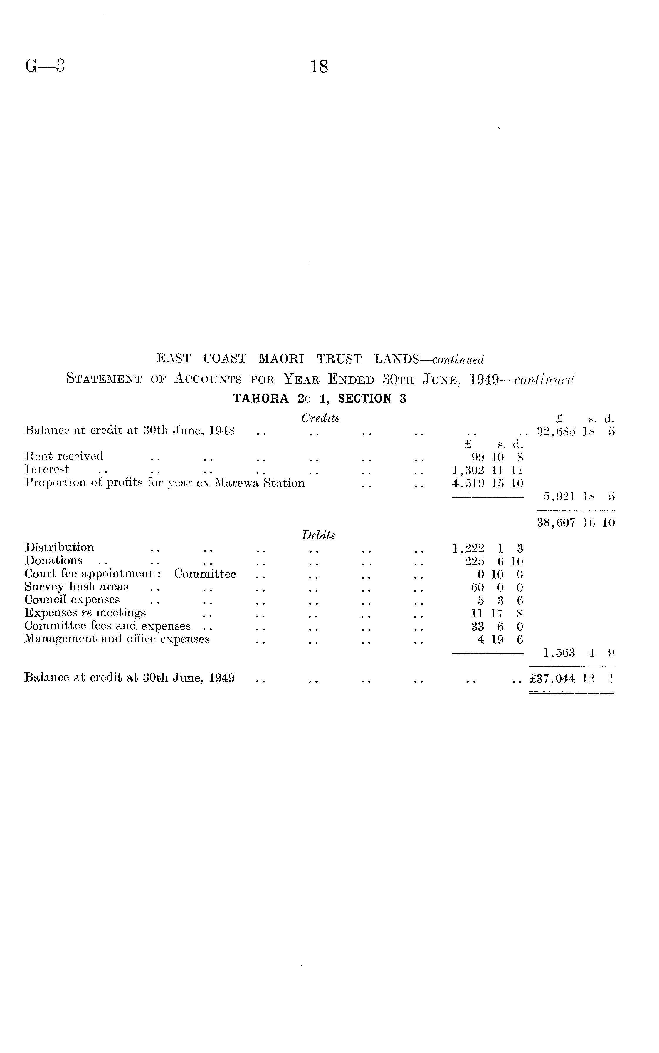 EAST COAST MAORI TRUST LANDS—continued Statement op Accounts for Year Ended 30th June, 1949—continued TAHORA 2c 1, SECTION 3 Credits £ s. d. Balance at credit at 30th June, 1948 .. .. .. .. .. .. 32,685 18 5 £ s. d. Rent received .. .. .. .. .. .. 99 10 8 Interest .. .. .. .. .. .. .. 1,302 11 11 Proportion of profits for year ex Marewa Station .. .. 4,519 15 10 5,921 18 5 38,607 16 10 Debits Distribution .. .. .. .. .. .. 1,222 1 3 Donations .. .. .. .. .. .. .. 225 6 10 Court fee appointment: Committee .. .. .. .. 010 0 Survey bush areas .. .. .. .. .. .. 60 0 0 Council expenses .. .. ~ .. .. .. 536 Expenses re meetings .. .. .. .. .. 11 17 8 Committee fees and expenses .. .. .. .. .. 33 6 0 Management and office expenses .. .. .. .. 4 19 6 1,563 4 9 Balance at credit at 30th June, 1949 .. .. .. .. .. .. £37,044 12 1