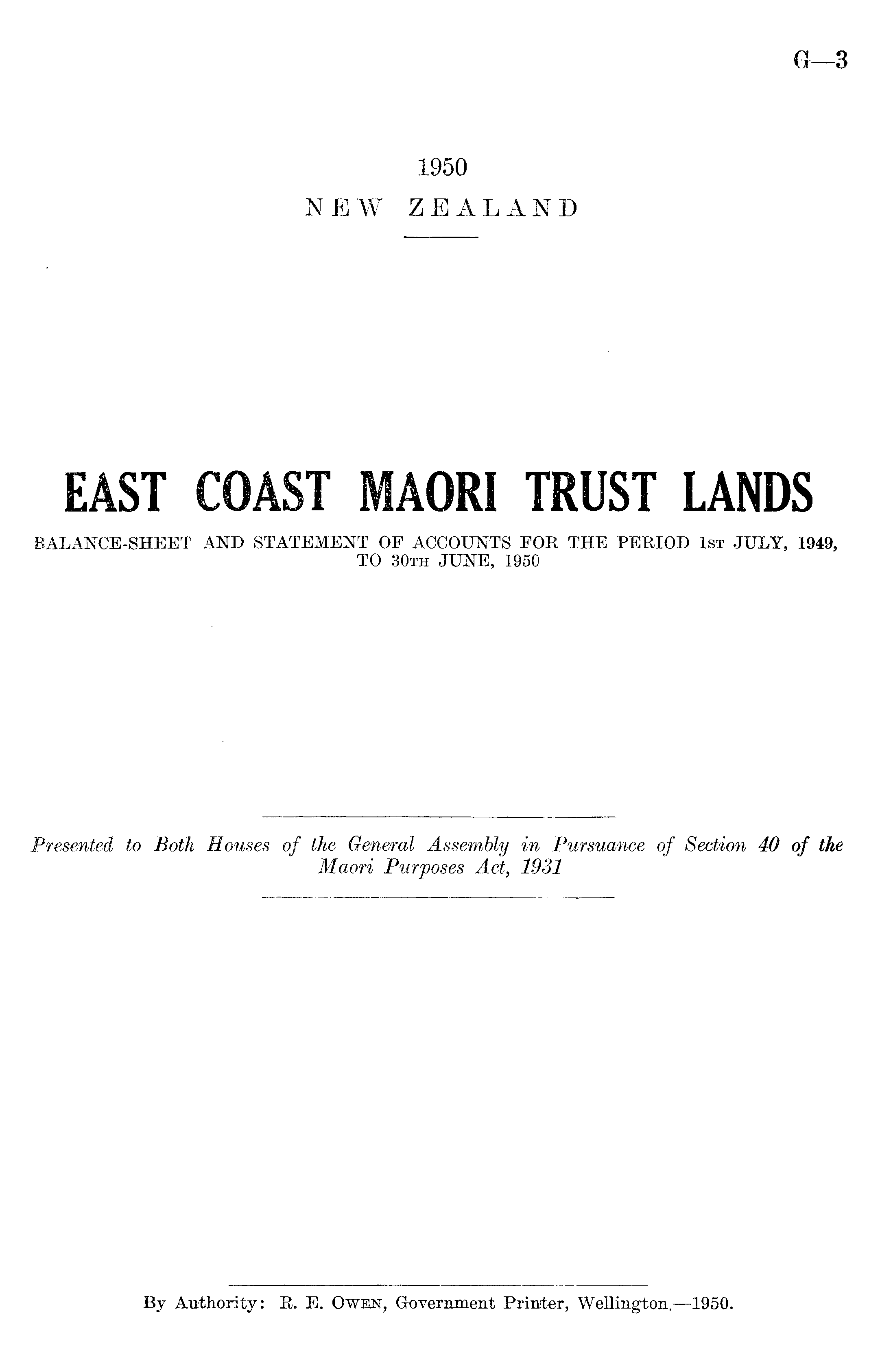 EAST COAST MAORI TRUST LANDS BALANCE-SHEET AND STATEMENT OF ACCOUNTS FOR THE PERIOD 1st JULY, 1949, TO 30th JUNE, 1950