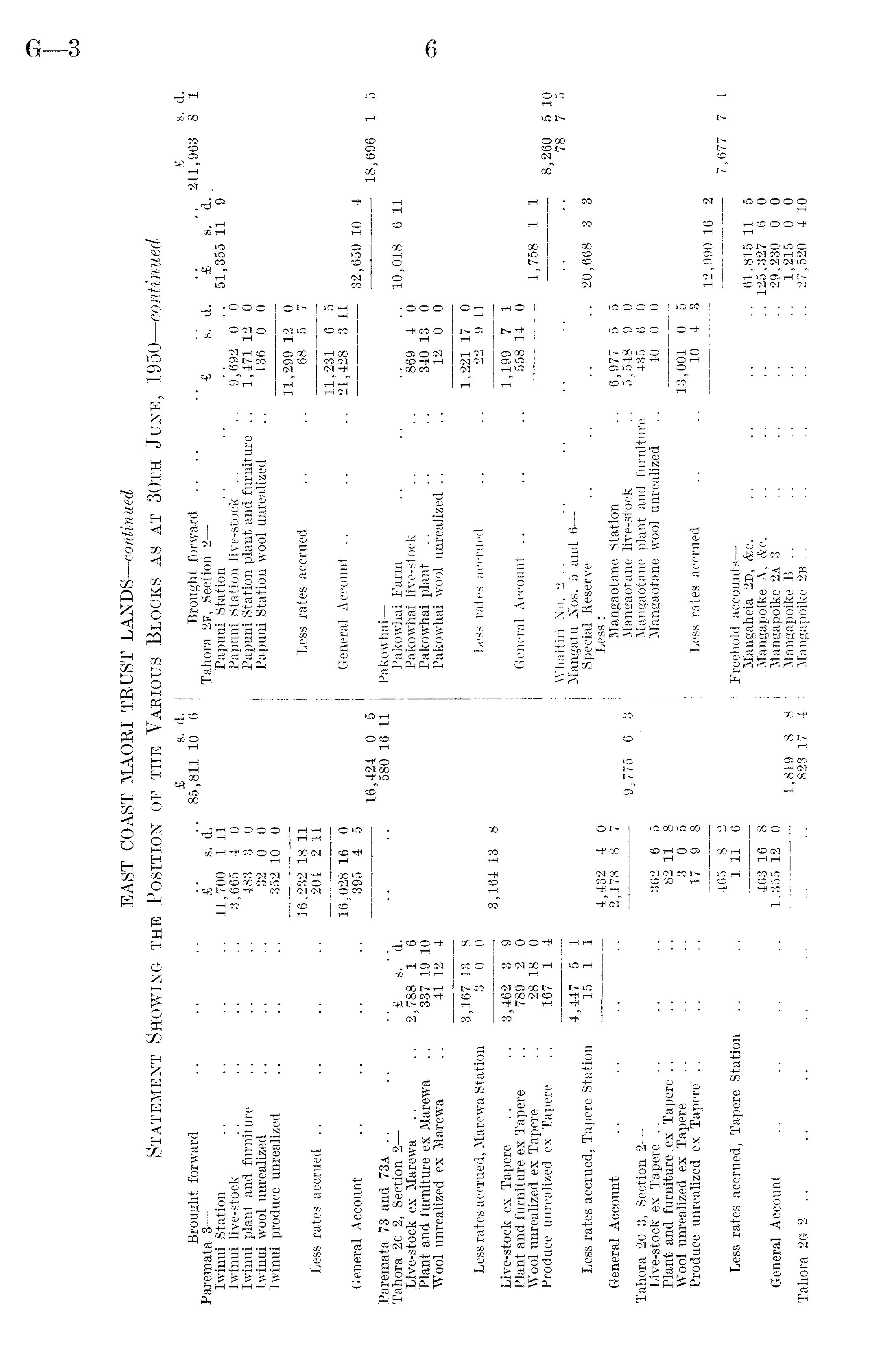 EAST COAST MAORI TRUST LANDS— continued Statement Showing the Position of the Various Blocks as at 30th June, 1950— continued £ s. d. I £ s. d. Brought forward .. .. .. .. .. 85,811 10 6 Brought forward .... .. .. .. .. 211,963 8 1 Paremata 3 £ s. d. Tahora 2f, Section 2 £ s. d. £ s. d. , Iwinui Statioa .. .. .. .. 11,700 1 11 | Papuui Station .. .. .. .. 51,355 11 9 Iwinui live-stock .. .. .. .. 3,665 4 0 Papuni Station live-stock .. .. 9,692 0 0 Iwinni plant and furniture .. .. .. 483 3 0 Papuni Station plant and furniture .. 1,471 12 0 Iwinui wool unrealized .. .. .. 32 0 0 Papuni Station wool unrealized .. 136 0 0 Iwinui produce unrealized .. .. .. 352 10 0 11,299 12 0 16,232 18 11 Less rates accrued .. .. 68 5 7 Less rates accrued .. .. .. .. 204 2 11 -——■— ———— 11,231 6 5 16,028 16 0 General Account .. .. .. 21,428 3 11 General Account .. .. .. .. 395 4 5 32,659 10 4 16,424 0 5 18,696 1 5 Paremata 73 and 73a .. .. .. . . .. .. 580 16 11 Pakowhai— Tahora 20 2, Section 2 £ s. d. Pakowhai Farm .. .. .. .. 10,018 6 11 Live-stock ex Marewa .. .. 2,788 1 6 Pakowhai live-stock .. .. 869 4 0 Plant and furniture ex Marewa ~ 337 19 10 Pakowhai plant .. .. .. 340 13 0 Wool unrealized ex Marewa .. 41 12 4 Pakowhai wool unrealized .. .. 12 0 0 3,167 13 8 1,221 17 0 Less rates accrued, Marewa Station 3 0 0 Less rates accrued .. .. 22 9 11 3,164 13 8 Live-stock ex Tapere .... 3,462 3 9 1,199 7 1 Plant and furniture ex Tapere .. 789 2 0 General Account .. .. .. 558 14 0 Wool unrealized ex Tapere .. 28 18 0 1,758 1 1 Produce unrealized ex Tapere .. 167 1 4 8,260 5 10 Whaitiri No. 2 .. .. .. .. .. .. .. 78 7 5 4,447 5 1 Mangatu JN'os. 5 and 6 Less rates accrued, Tapere Station 15 1 1 Special Reserve .. .. .. .. 20,668 3 3 4,432 4 0 Less: General Account .. .. .. .. 2,178 8 7 Mangaotane Station .. 6,977 5 5 9,775 6 3 Mangaotane live-stock .. 5,548 9 0 Tahora 20 3, Section 2 Mangaotane plant and furniture 435 6 0 Live-stock ex Tapere .. .. .. .. 362 6 5 Mangaotane wool unrealized .. 40 0 0 Plant and furniture , ex Tapere .. .. .. 82 11 8 Wool unrealized ex Tapere .. .. .. 3 0 5 13,001 0 5 Produce unrealized ex Tapere .. .. .. 17 9 8 Less rates accrued .. .. 10 4 3 — 12,990 16 2 465 8 2 ___ 7,677 7 1 Less rates accrued, Tapere Station .. .. 1 11 6 Freehold accounts— Mangaheia 2d, &c. .. .. .. .. 61,815 11 5 463 16 8 Mangapoike A, &c. .. .. .. .. 125, 327 6 0 General Account .. .. .. .. 1,355 12 0 Mangapoike 2A 3 .. .. .. .. 29,230 0 0 —— 1,819 8 8 Mangapoike B .. .. .. .. .. 1,215 0 0 Tahora 2G 2 .. .. .. .. .. .. .. 823 17 4 Mangapoike 2b . . .. .. .. .. 27,520 4 10