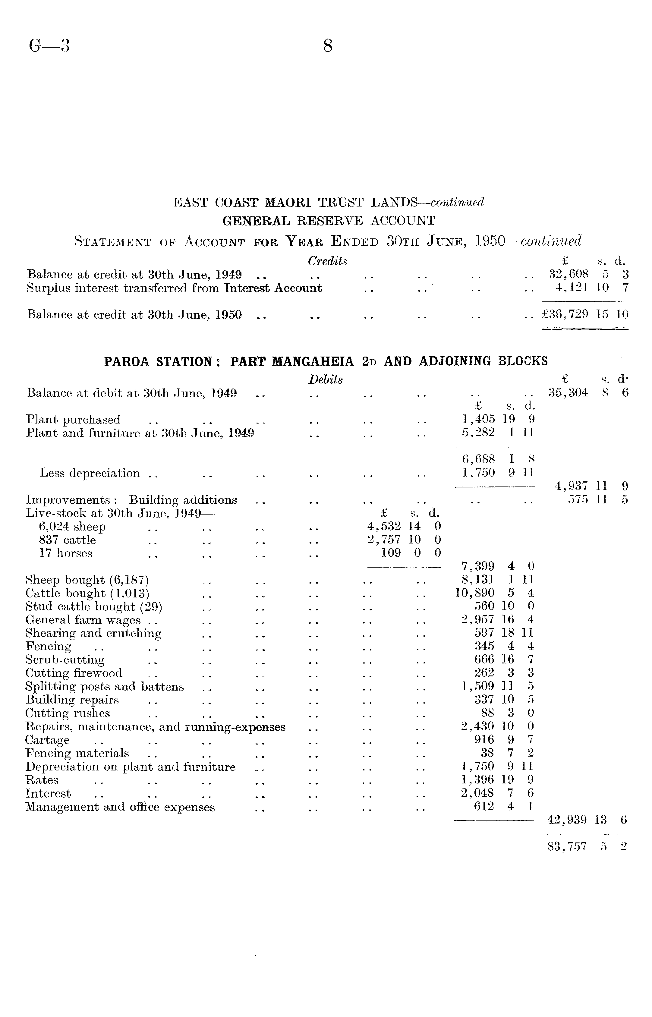 EAST COAST MAORI TRUST LANDS—continued GENERAL RESERVE ACCOUNT Statement op Account for Year Ended 30th June, 1950—continued Credits £ s. d. Balance at credit at 30th June, 1949 .. .. .. .. .. 32,608 5 3 Surplus interest transferred from Interest Account .. .. .. .. 4,121107 Balance at credit at 30th June, 1950 .. .. .. .. .. .. £36,729 15 10 PAROA STATION : PART MANGAHEIA 2d AND ADJOINING BLOCKS JDebits £ s. dBalance at debit at 30th June, 1949 .. .. .. .. • • . • 35,304 8 6 £ s. d. Plant purchased .. .. .. .. .. .. 1,405 19 9 Plant and furniture at 30th June, 1949 .. .. .. 5,282 1 11 6,688 1 8 Less depreciation .. .. .. .. 1,750 9 11 4,937 11 9 Improvements: Building additions .. .. .. .. .. .. 575 11 5 Live-stock at 30th June, 1949 £ s. d. 6,024 sheep .. .. .. .. 4,532 14 0 837 cattle .. .. .. .. 2,757 10 0 17 horses .. .. .. .. 109 0 0 7,399 4 0 Sheep bought (6,187) . . .. .. .. .. 8,131 1 11 Cattle bought (1,013) .. .. .. .. .. 10,890 5 4 Stud cattle bought (29) . - .. .. .. .. 560 10 0 General farm wages .. .. .. .. .. .. 2,957 16 4 Shearing and crutching .. .. .. .. .. 597 18 11 Fencing .. .. . „ ~ .. .. .. 345 4 4 Scrub-cutting .. .. .. .. .. .. 666 16 7 Cutting firewood .. .. .. .. .. .. 262 3 3 Splitting posts and battens .. .. .. .. .. 1,509 11 5 Building repairs .. .. .. .. .. .. 337 10 5 Cutting rushes .. .. .. .. .. .. 88 3 0 Repairs, maintenance, and running-expenses .. .. .. 2,430 10 0 Cartage .. .. .. .. .. .. .. 916 9 7 Fencing materials .. .. .. .. .. .. 38 7 2 Depreciation on plant and furniture .. .. .. .. 1,750 911 Rates .. .. .. .. .. .. .. 1,396 19 9 Interest .. .. .. .. .. .. .. 2,048 7 6 Management and office expenses .. .. .. .. 612 4 1 42,939 13 6 83,757 5 2