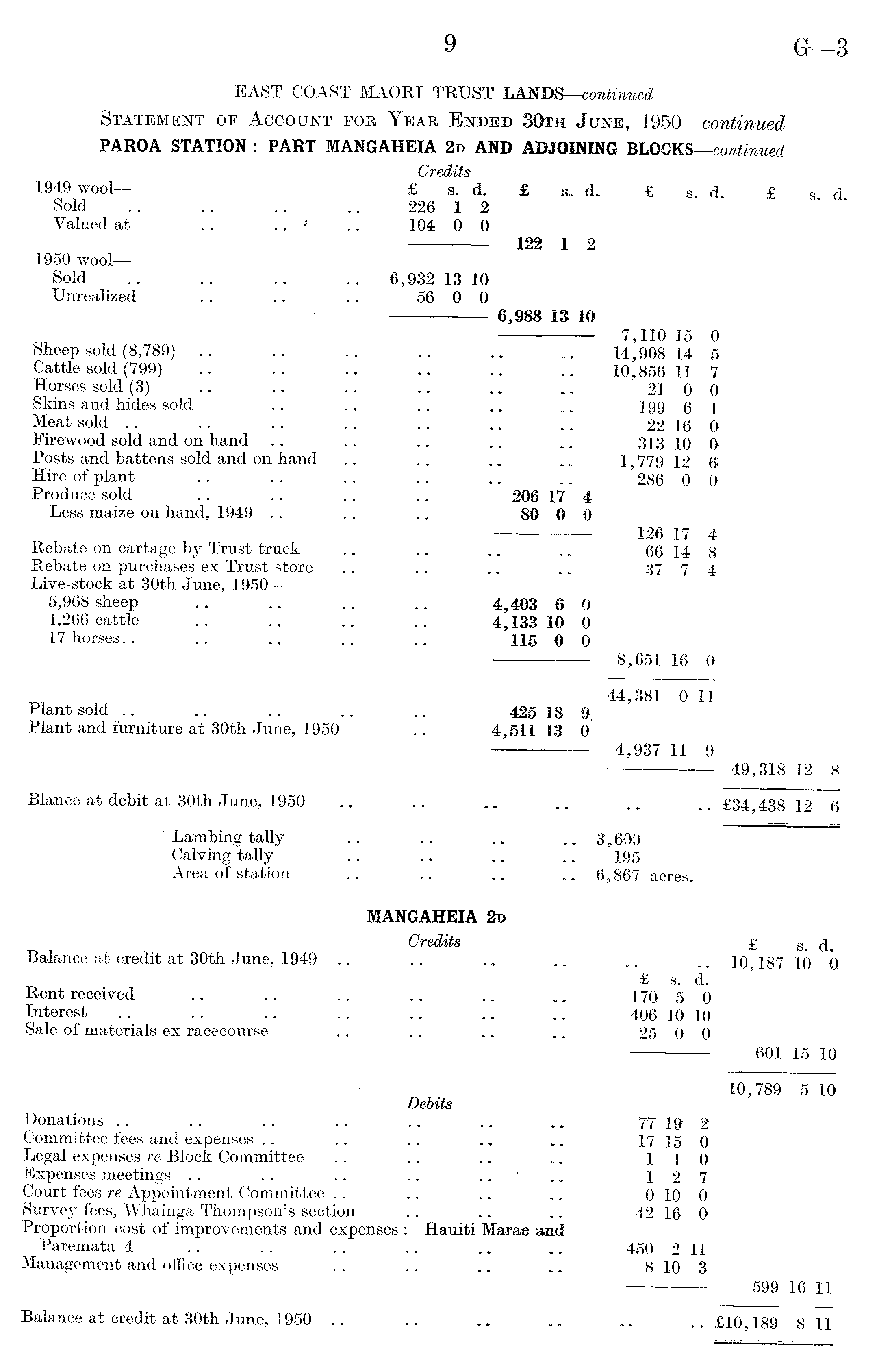 EAST COAST MAORI TRUST LANDS—continued Statement of Account for Year Ended 30m June, 1950—continued PAROA STATION : PART MANGAHEIA 2d AND ADJOINING BLOCKS—continued Credits 1949 wool— £ s. d. £ s. dL £ s. d. £ s d Sold .. .. .. .. 226 1 2 Valued at .. .. ' .. 104 0 0 122 1 2 1950 woolSold .. .. .. .. 6,932 13 10 Unrealized .. .. .. 56 0 0 6,988 13 10 7,110 15 0 Sheep sold (8,789) .. .. .. .. .. .. 14,908 14 5 Cattle sold (799) .. .. .. .. .. .. 10,856 11 7 Horses sold (3) .. .. .. .. .. .. 210 0 Skins and hides sold .. ~ .. .. .. 299 6 1 Meat sold .. .. .. .. .. .. .. 22 16 0 Firewood sold and on hand .. .. .. .. .. 313 io 0 Posts and battens sold and on hand .. .. .. .. 1,779 12 6 Hire of plant .. .. .. .. .. .. 286 0 0 Produce sold .. .. .. .. 206 17 4 Less maize on hand, 1949 .. .. .. 80 0 0 126 17 4 Rebate on cartage by Trust truck .. .. .. .. 66 14 8 Rebate on purchases ex Trust store .. .. .. .. 37 7 4 Live-stock at 30th June, 1950 — 5,968 sheep .. .. .. .. 4,403 6 0 1,266 cattle .. .. .. .. 4,133 10 0 17 horses.. .. .. .. .. 115 o 0 8,651 16 0 44,381 0 11 Plant sold .. .. .. .. .. 425 18 9 Plant and furniture at 30th June, 1950 .. 4,511 13 0 4,937 11 9 49,318 12 8 Blance at debit at 30th June, 1950 .. .. .. .. .. .. £34 433 12 6 ' Lambing tally .. .. .. .. 3,600 Calving tally .. .. .. .. 195 Area of station .. .. .. .. 6,867 acres. MANGAHEIA 2d Credits £ g . (j_ Balance at credit at 30th June, 1949 .. .. .. .. „ .>lO 187 10 0 £ s. d. Rent received .. .. .. .. .. .. 170 5 0 Interest .. .. .. .. .. .. .. 406 10 10 Sale of materials ex racecourse .. .. .. .. 25 0 0 6Ol 15 10 10,789 5 10 Debits Donations .. .. .. .. .. .. m .. 77 19 2 Committee fees and expenses .. ... .. .. .. 17 15 0 Legal expenses re Block Committee .. .. .. .. 110 Expenses meetings .. .. .. .. .. 127 Court fees re Appointment Committee .. .. .. .. 0 10 0 Survey fees, Whainga Thompson's section .. .. .. 42 16 0 Proportion cost of improvements and expenses : Hauiti Marae and Paremata 4 .. .. .. .. .. .. 450 2 11 Management and office expenses .. .. .. ' 8 10 3 599 16 11 Balance at credit at 30th June, 1950 .. .. .. .. ... .. £lO 189 8 11